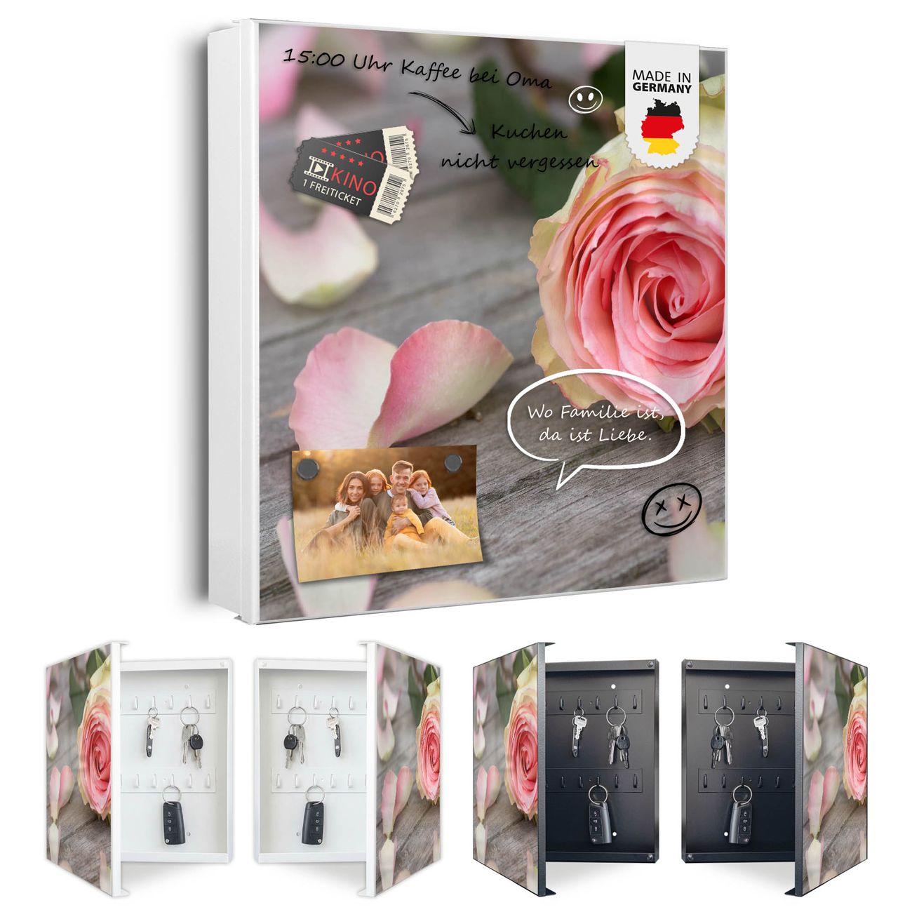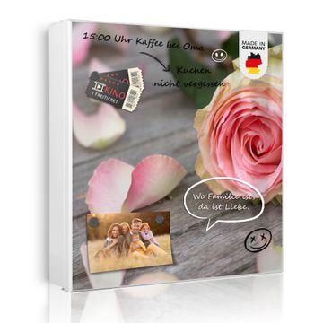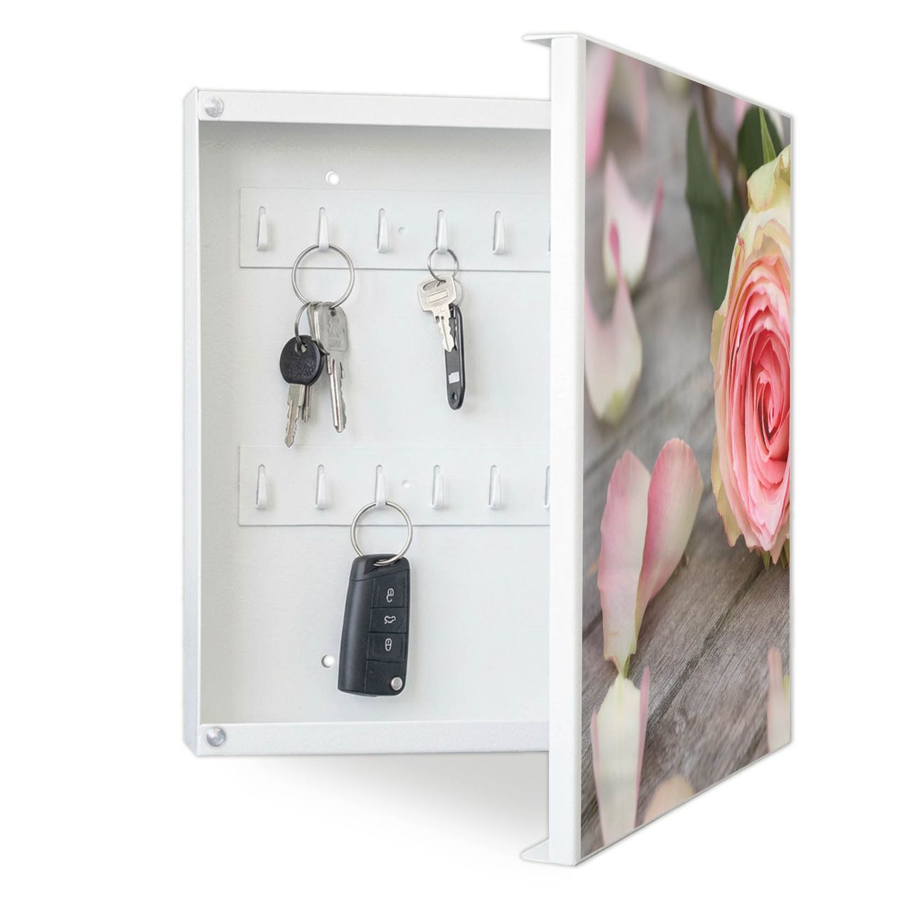 Bringe Ordnung und Eleganz in deinen Eingangsbereich mit dem banjado Schlüsselkasten Motiv Motiv Rosa Rose. Die moderne Schlüsselbox kombiniert funktionales Design mit hochwertiger Verarbeitung und wird so zu einem echten Hingucker in Flur, Büro oder Ferienwohnung. ✅ Stilvolle Schlüsselaufbewahrung mit Motiv Motiv Rosa Rose Der Design-Schlüsselkasten Motiv Motiv Rosa Rose bietet Platz für bis zu 32 Schlüssel, die auf 4 stabilen Reihen mit je 8 Haken übersichtlich verstaut werden. Mit seinen kompakten Maßen von 30 x 30 x 5 cm passt die Schlüsselbox perfekt auch in kleinere Räume. Der weiß lackierte Stahlkorpus mit rechts angeschlagenem Türscharnier harmoniert mit gedruckten Folie auf der Front und fügt sich nahtlos in jedes Wohnambiente ein. Ob als Schlüsselorganizer für Zuhause oder als praktische Lösung für Büros, Praxen und Gewerbe, der banjado Schlüsselkasten sorgt für Ordnung und Übersicht. Dank der magnetischen, mit Kreidestiften beschreibbaren Folie auf der Front kannst du Notizen anheften oder Termine direkt auf der Oberfläche festhalten. Die Schlüsselbox Motiv Motiv Rosa Rose zur Wandmontage wird inklusive Befestigungsmaterial geliefert und ist schnell angebracht. So hast du deine Schlüssel jederzeit griffbereit und zugleich stilvoll verstaut. Mit diesem banjado Schlüsselkasten Motiv Motiv Rosa Rose kombinierst du praktische Aufbewahrung mit stilvollem Wohndesign. Ob privat oder geschäftlich, die Schlüsselbox sorgt für mehr Ordnung, Übersicht und ein wohnliches Ambiente.Vorteile im Überblick