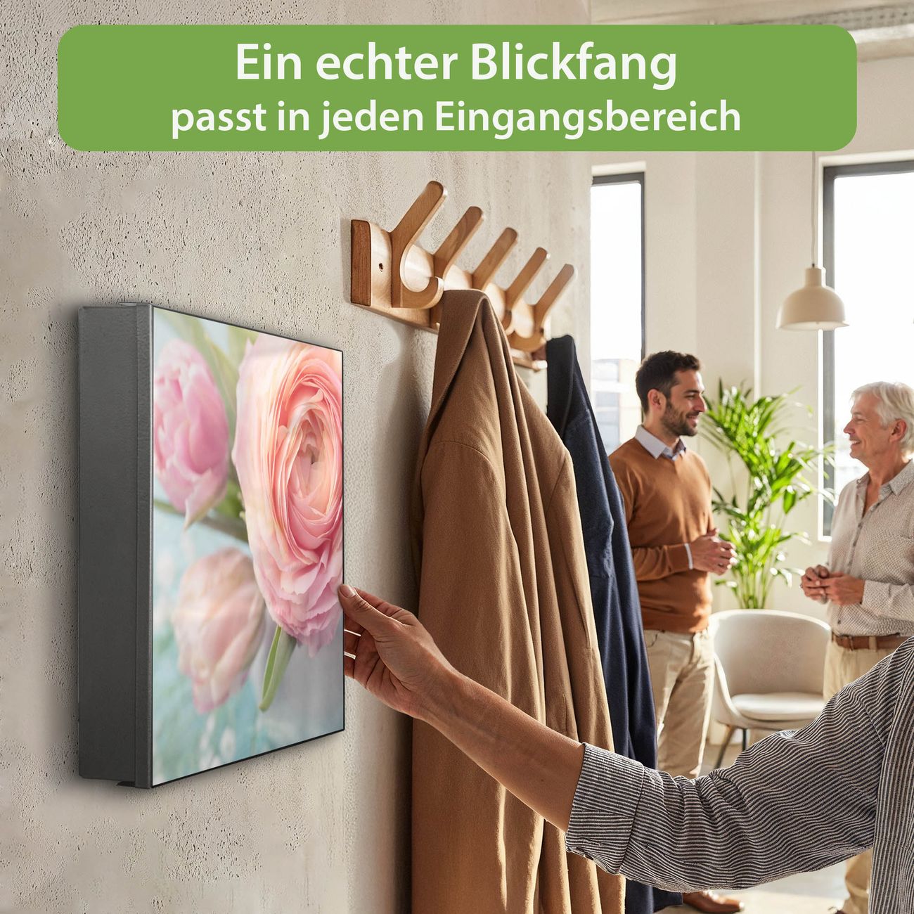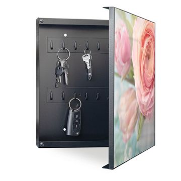 Bringe Ordnung und Eleganz in deinen Eingangsbereich mit dem banjado Schlüsselkasten Motiv Motiv Rosa Tulpe. Die moderne Schlüsselbox kombiniert funktionales Design mit hochwertiger Verarbeitung und wird so zu einem echten Hingucker in Flur, Büro oder Ferienwohnung. ✅ Stilvolle Schlüsselaufbewahrung mit Motiv Motiv Rosa Tulpe Der Design-Schlüsselkasten Motiv Motiv Rosa Tulpe bietet Platz für bis zu 32 Schlüssel, die auf 4 stabilen Reihen mit je 8 Haken übersichtlich verstaut werden. Mit seinen kompakten Maßen von 30 x 30 x 5 cm passt die Schlüsselbox perfekt auch in kleinere Räume. Der schwarz lackierte Stahlkorpus mit rechts angeschlagenem Türscharnier harmoniert mit gedruckten Folie auf der Front und fügt sich nahtlos in jedes Wohnambiente ein. Ob als Schlüsselorganizer für Zuhause oder als praktische Lösung für Büros, Praxen und Gewerbe, der banjado Schlüsselkasten sorgt für Ordnung und Übersicht. Dank der magnetischen, mit Kreidestiften beschreibbaren Folie auf der Front kannst du Notizen anheften oder Termine direkt auf der Oberfläche festhalten. Die Schlüsselbox Motiv Motiv Rosa Tulpe zur Wandmontage wird inklusive Befestigungsmaterial geliefert und ist schnell angebracht. So hast du deine Schlüssel jederzeit griffbereit und zugleich stilvoll verstaut. Mit diesem banjado Schlüsselkasten Motiv Motiv Rosa Tulpe kombinierst du praktische Aufbewahrung mit stilvollem Wohndesign. Ob privat oder geschäftlich, die Schlüsselbox sorgt für mehr Ordnung, Übersicht und ein wohnliches Ambiente.Vorteile im Überblick