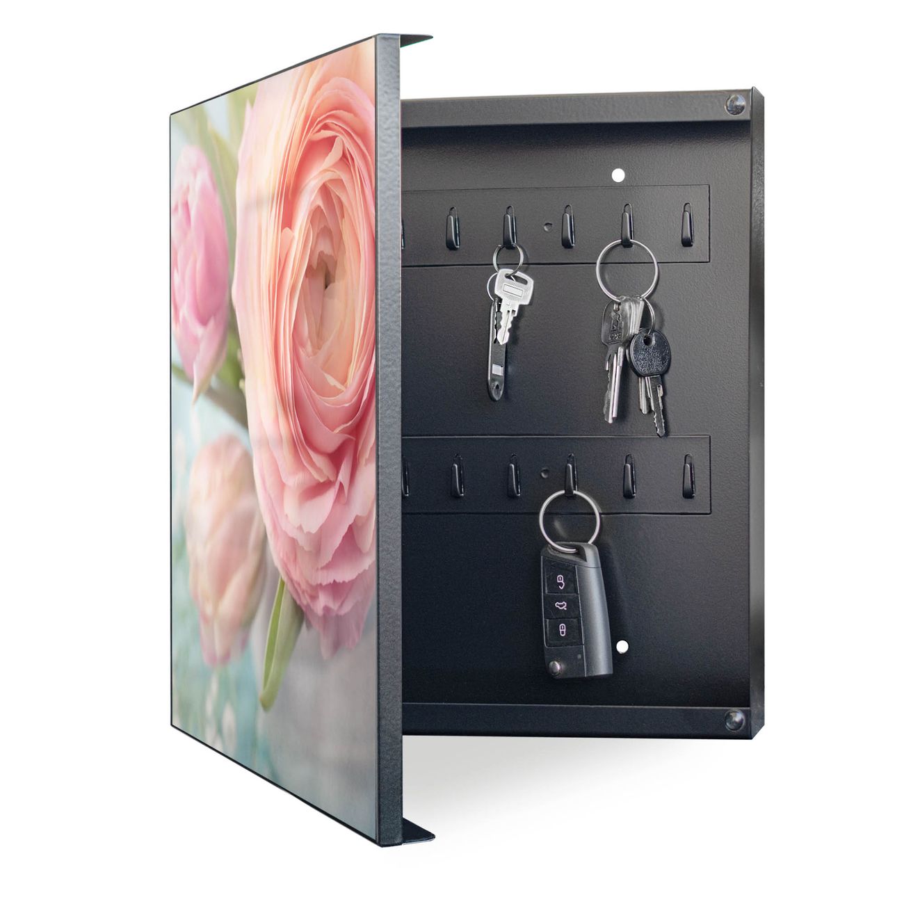 Bringe Ordnung und Eleganz in deinen Eingangsbereich mit dem banjado Schlüsselkasten Motiv Motiv Rosa Tulpe. Die moderne Schlüsselbox kombiniert funktionales Design mit hochwertiger Verarbeitung und wird so zu einem echten Hingucker in Flur, Büro oder Ferienwohnung. ✅ Stilvolle Schlüsselaufbewahrung mit Motiv Motiv Rosa Tulpe Der Design-Schlüsselkasten Motiv Motiv Rosa Tulpe bietet Platz für bis zu 32 Schlüssel, die auf 4 stabilen Reihen mit je 8 Haken übersichtlich verstaut werden. Mit seinen kompakten Maßen von 30 x 30 x 5 cm passt die Schlüsselbox perfekt auch in kleinere Räume. Der schwarz lackierte Stahlkorpus mit links angeschlagenem Türscharnier harmoniert mit gedruckten Folie auf der Front und fügt sich nahtlos in jedes Wohnambiente ein. Ob als Schlüsselorganizer für Zuhause oder als praktische Lösung für Büros, Praxen und Gewerbe, der banjado Schlüsselkasten sorgt für Ordnung und Übersicht. Dank der magnetischen, mit Kreidestiften beschreibbaren Folie auf der Front kannst du Notizen anheften oder Termine direkt auf der Oberfläche festhalten. Die Schlüsselbox Motiv Motiv Rosa Tulpe zur Wandmontage wird inklusive Befestigungsmaterial geliefert und ist schnell angebracht. So hast du deine Schlüssel jederzeit griffbereit und zugleich stilvoll verstaut. Mit diesem banjado Schlüsselkasten Motiv Motiv Rosa Tulpe kombinierst du praktische Aufbewahrung mit stilvollem Wohndesign. Ob privat oder geschäftlich, die Schlüsselbox sorgt für mehr Ordnung, Übersicht und ein wohnliches Ambiente.Vorteile im Überblick