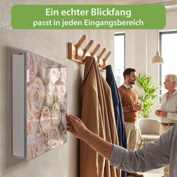 Bringe Ordnung und Eleganz in deinen Eingangsbereich mit dem banjado Schlüsselkasten Motiv Motiv Rosenbouquet. Die moderne Schlüsselbox kombiniert funktionales Design mit hochwertiger Verarbeitung und wird so zu einem echten Hingucker in Flur, Büro oder Ferienwohnung. ✅ Stilvolle Schlüsselaufbewahrung mit Glasfront im Motiv Motiv Rosenbouquet Der Design-Schlüsselkasten Motiv Motiv Rosenbouquet bietet Platz für bis zu 50 Schlüssel, die auf 5 stabilen Reihen mit je 10 Haken übersichtlich verstaut werden. Mit seinen kompakten Maßen von 30 x 30 x 5 cm passt die Schlüsselbox perfekt auch in kleinere Räume. Der weiß lackierte Stahlkorpus mit rechts angeschlagenem Türscharnier harmoniert mit der Glasfront und fügt sich nahtlos in jedes Wohnambiente ein. Ob als Schlüsselorganizer für Zuhause oder als praktische Lösung für Büros, Praxen und Gewerbe, der banjado Schlüsselkasten sorgt für Ordnung und Übersicht. Dank der magnetischen, mit Kreidestiften beschreibbaren Glasfront kannst du Notizen anheften oder Termine direkt auf der Oberfläche festhalten. Die Schlüsselbox Motiv Motiv Rosenbouquet zur Wandmontage wird inklusive Befestigungsmaterial geliefert und ist schnell angebracht. So hast du deine Schlüssel jederzeit griffbereit und zugleich stilvoll verstaut. Mit diesem banjado Schlüsselkasten Motiv Motiv Rosenbouquet kombinierst du praktische Aufbewahrung mit stilvollem Wohndesign. Ob privat oder geschäftlich, die Schlüsselbox sorgt für mehr Ordnung, Übersicht und ein wohnliches Ambiente.Vorteile im Überblick