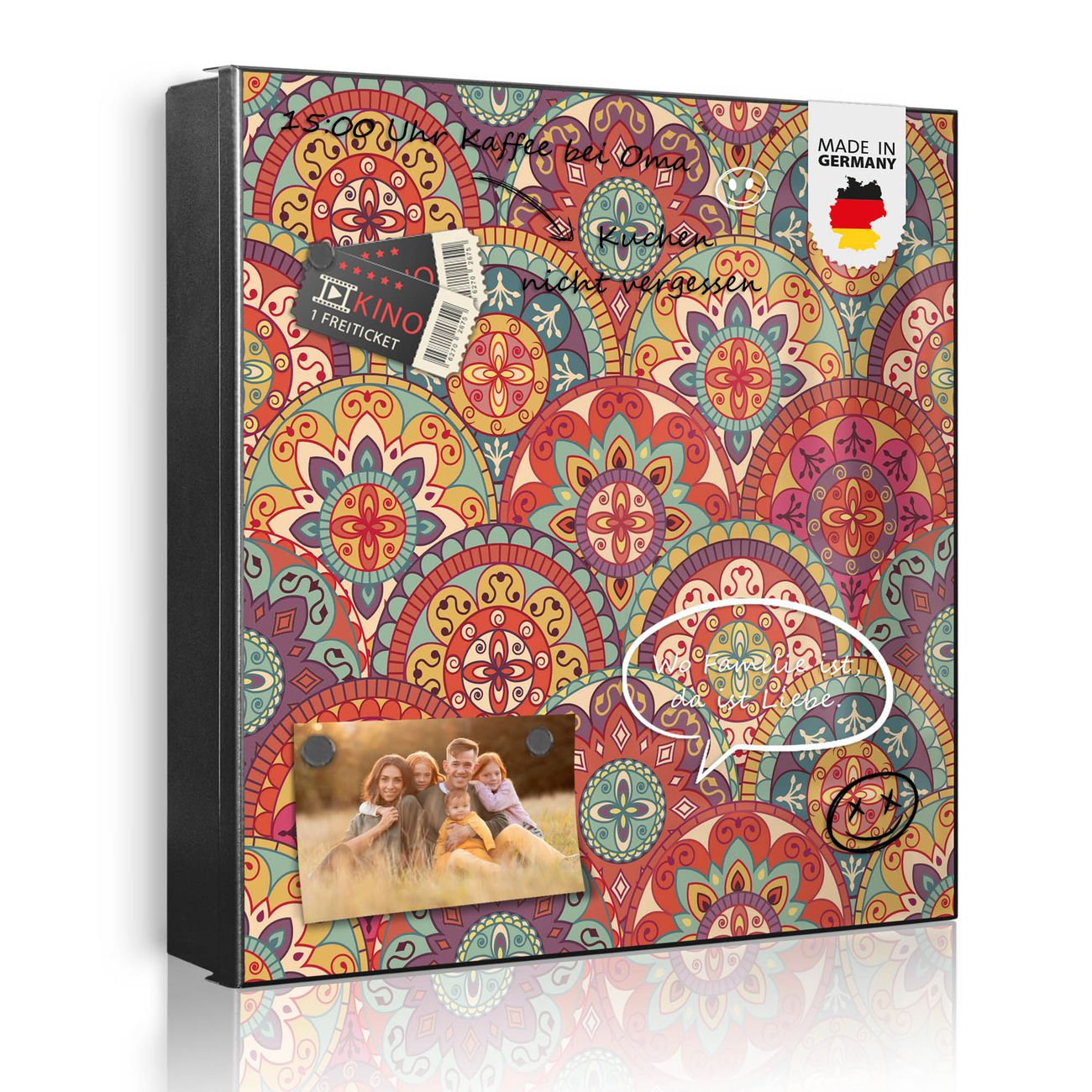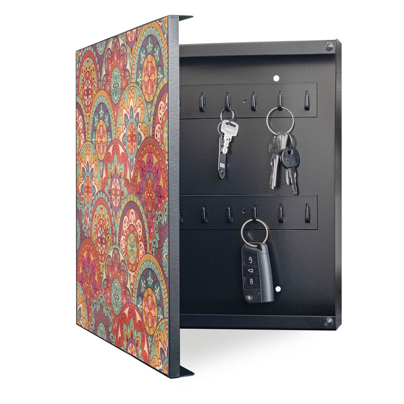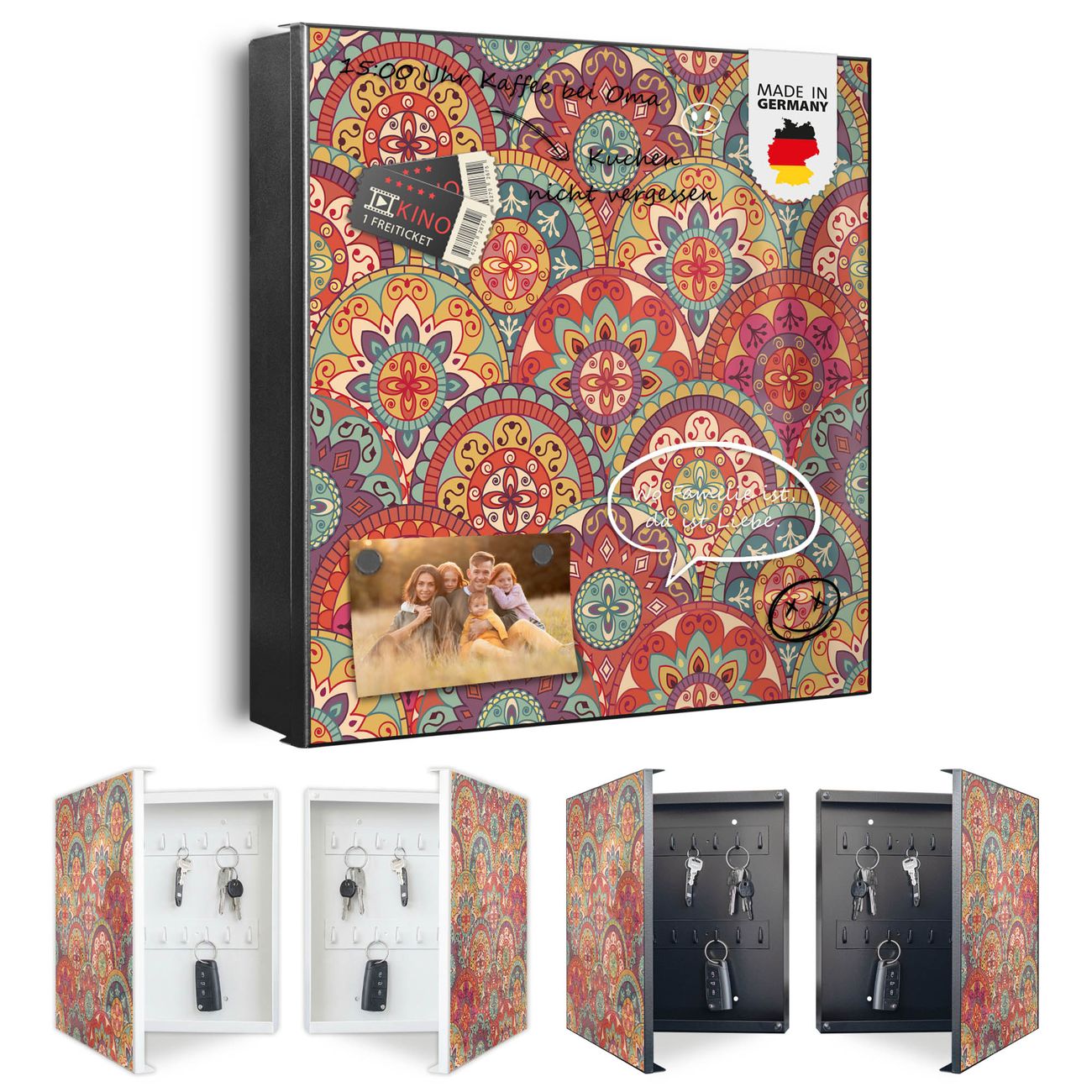 Bringe Ordnung und Eleganz in deinen Eingangsbereich mit dem banjado Schlüsselkasten Motiv Motiv Rosetten. Die moderne Schlüsselbox kombiniert funktionales Design mit hochwertiger Verarbeitung und wird so zu einem echten Hingucker in Flur, Büro oder Ferienwohnung. ✅ Stilvolle Schlüsselaufbewahrung mit Motiv Motiv Rosetten Der Design-Schlüsselkasten Motiv Motiv Rosetten bietet Platz für bis zu 32 Schlüssel, die auf 4 stabilen Reihen mit je 8 Haken übersichtlich verstaut werden. Mit seinen kompakten Maßen von 30 x 30 x 5 cm passt die Schlüsselbox perfekt auch in kleinere Räume. Der schwarz lackierte Stahlkorpus mit links angeschlagenem Türscharnier harmoniert mit gedruckten Folie auf der Front und fügt sich nahtlos in jedes Wohnambiente ein. Ob als Schlüsselorganizer für Zuhause oder als praktische Lösung für Büros, Praxen und Gewerbe, der banjado Schlüsselkasten sorgt für Ordnung und Übersicht. Dank der magnetischen, mit Kreidestiften beschreibbaren Folie auf der Front kannst du Notizen anheften oder Termine direkt auf der Oberfläche festhalten. Die Schlüsselbox Motiv Motiv Rosetten zur Wandmontage wird inklusive Befestigungsmaterial geliefert und ist schnell angebracht. So hast du deine Schlüssel jederzeit griffbereit und zugleich stilvoll verstaut. Mit diesem banjado Schlüsselkasten Motiv Motiv Rosetten kombinierst du praktische Aufbewahrung mit stilvollem Wohndesign. Ob privat oder geschäftlich, die Schlüsselbox sorgt für mehr Ordnung, Übersicht und ein wohnliches Ambiente.Vorteile im Überblick
