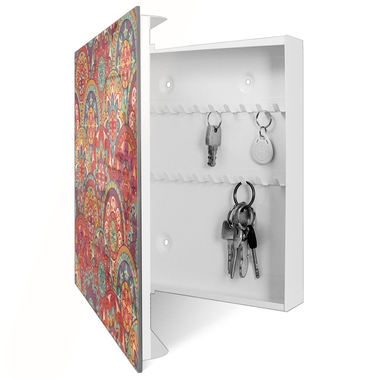 Bringe Ordnung und Eleganz in deinen Eingangsbereich mit dem banjado Schlüsselkasten Motiv Motiv Rosetten. Die moderne Schlüsselbox kombiniert funktionales Design mit hochwertiger Verarbeitung und wird so zu einem echten Hingucker in Flur, Büro oder Ferienwohnung. ✅ Stilvolle Schlüsselaufbewahrung mit Glasfront im Motiv Motiv Rosetten Der Design-Schlüsselkasten Motiv Motiv Rosetten bietet Platz für bis zu 50 Schlüssel, die auf 5 stabilen Reihen mit je 10 Haken übersichtlich verstaut werden. Mit seinen kompakten Maßen von 30 x 30 x 5 cm passt die Schlüsselbox perfekt auch in kleinere Räume. Der weiß lackierte Stahlkorpus mit rechts angeschlagenem Türscharnier harmoniert mit der Glasfront und fügt sich nahtlos in jedes Wohnambiente ein. Ob als Schlüsselorganizer für Zuhause oder als praktische Lösung für Büros, Praxen und Gewerbe, der banjado Schlüsselkasten sorgt für Ordnung und Übersicht. Dank der magnetischen, mit Kreidestiften beschreibbaren Glasfront kannst du Notizen anheften oder Termine direkt auf der Oberfläche festhalten. Die Schlüsselbox Motiv Motiv Rosetten zur Wandmontage wird inklusive Befestigungsmaterial geliefert und ist schnell angebracht. So hast du deine Schlüssel jederzeit griffbereit und zugleich stilvoll verstaut. Mit diesem banjado Schlüsselkasten Motiv Motiv Rosetten kombinierst du praktische Aufbewahrung mit stilvollem Wohndesign. Ob privat oder geschäftlich, die Schlüsselbox sorgt für mehr Ordnung, Übersicht und ein wohnliches Ambiente.Vorteile im Überblick