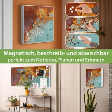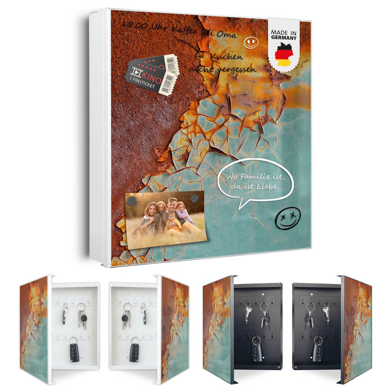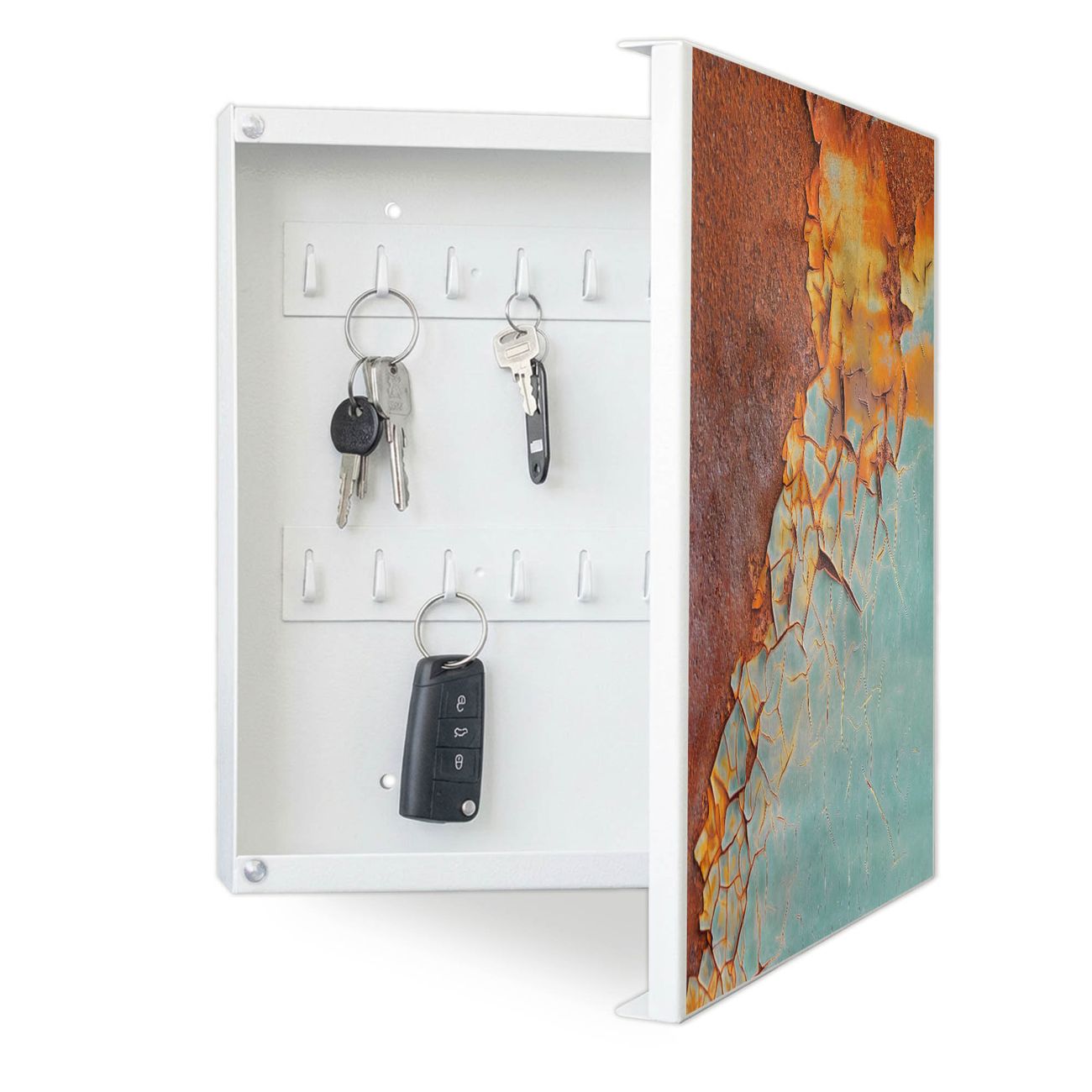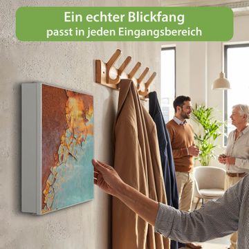 Bringe Ordnung und Eleganz in deinen Eingangsbereich mit dem banjado Schlüsselkasten Motiv Motiv Rost und Blau. Die moderne Schlüsselbox kombiniert funktionales Design mit hochwertiger Verarbeitung und wird so zu einem echten Hingucker in Flur, Büro oder Ferienwohnung. ✅ Stilvolle Schlüsselaufbewahrung mit Motiv Motiv Rost und Blau Der Design-Schlüsselkasten Motiv Motiv Rost und Blau bietet Platz für bis zu 32 Schlüssel, die auf 4 stabilen Reihen mit je 8 Haken übersichtlich verstaut werden. Mit seinen kompakten Maßen von 30 x 30 x 5 cm passt die Schlüsselbox perfekt auch in kleinere Räume. Der weiß lackierte Stahlkorpus mit rechts angeschlagenem Türscharnier harmoniert mit gedruckten Folie auf der Front und fügt sich nahtlos in jedes Wohnambiente ein. Ob als Schlüsselorganizer für Zuhause oder als praktische Lösung für Büros, Praxen und Gewerbe, der banjado Schlüsselkasten sorgt für Ordnung und Übersicht. Dank der magnetischen, mit Kreidestiften beschreibbaren Folie auf der Front kannst du Notizen anheften oder Termine direkt auf der Oberfläche festhalten. Die Schlüsselbox Motiv Motiv Rost und Blau zur Wandmontage wird inklusive Befestigungsmaterial geliefert und ist schnell angebracht. So hast du deine Schlüssel jederzeit griffbereit und zugleich stilvoll verstaut. Mit diesem banjado Schlüsselkasten Motiv Motiv Rost und Blau kombinierst du praktische Aufbewahrung mit stilvollem Wohndesign. Ob privat oder geschäftlich, die Schlüsselbox sorgt für mehr Ordnung, Übersicht und ein wohnliches Ambiente.Vorteile im Überblick
