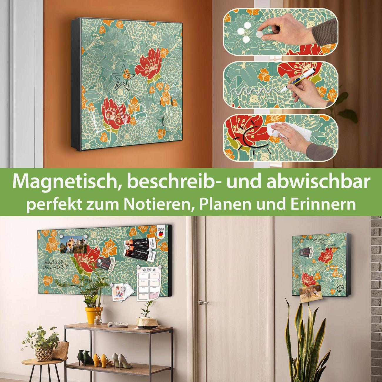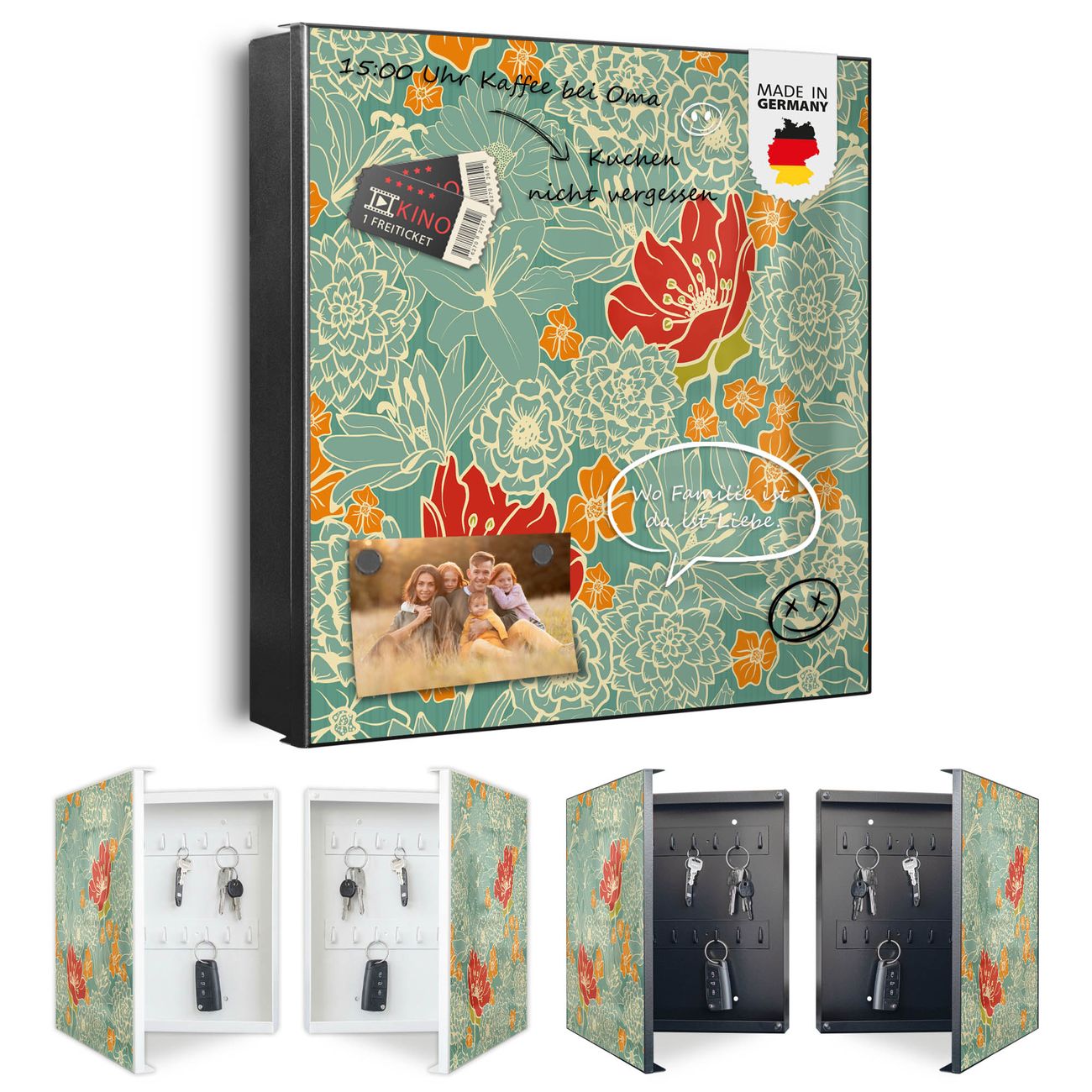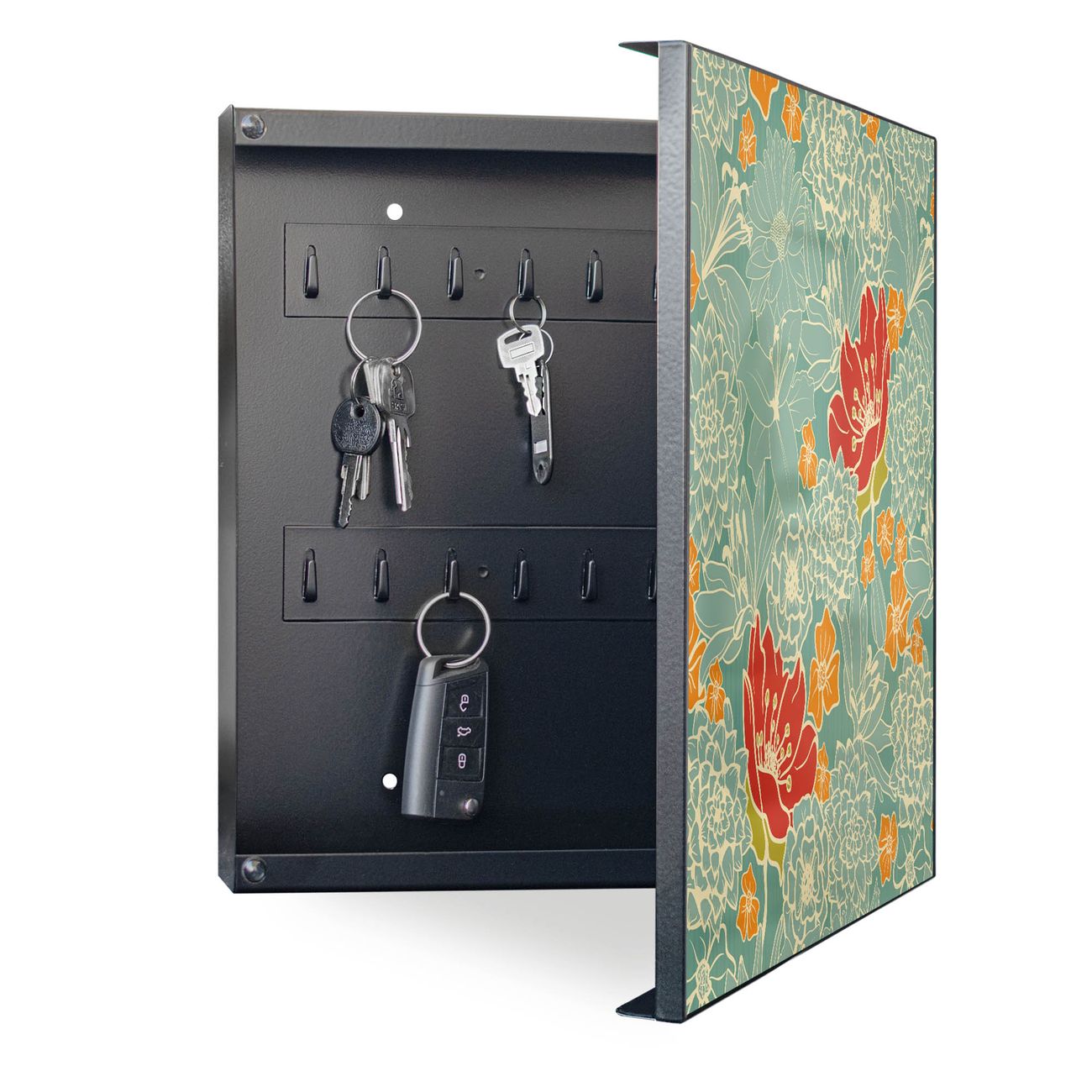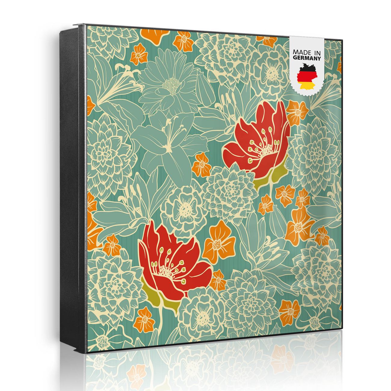 Bringe Ordnung und Eleganz in deinen Eingangsbereich mit dem banjado Schlüsselkasten Motiv Motiv Rote Blumen. Die moderne Schlüsselbox kombiniert funktionales Design mit hochwertiger Verarbeitung und wird so zu einem echten Hingucker in Flur, Büro oder Ferienwohnung. ✅ Stilvolle Schlüsselaufbewahrung mit Motiv Motiv Rote Blumen Der Design-Schlüsselkasten Motiv Motiv Rote Blumen bietet Platz für bis zu 32 Schlüssel, die auf 4 stabilen Reihen mit je 8 Haken übersichtlich verstaut werden. Mit seinen kompakten Maßen von 30 x 30 x 5 cm passt die Schlüsselbox perfekt auch in kleinere Räume. Der schwarz lackierte Stahlkorpus mit rechts angeschlagenem Türscharnier harmoniert mit gedruckten Folie auf der Front und fügt sich nahtlos in jedes Wohnambiente ein. Ob als Schlüsselorganizer für Zuhause oder als praktische Lösung für Büros, Praxen und Gewerbe, der banjado Schlüsselkasten sorgt für Ordnung und Übersicht. Dank der magnetischen, mit Kreidestiften beschreibbaren Folie auf der Front kannst du Notizen anheften oder Termine direkt auf der Oberfläche festhalten. Die Schlüsselbox Motiv Motiv Rote Blumen zur Wandmontage wird inklusive Befestigungsmaterial geliefert und ist schnell angebracht. So hast du deine Schlüssel jederzeit griffbereit und zugleich stilvoll verstaut. Mit diesem banjado Schlüsselkasten Motiv Motiv Rote Blumen kombinierst du praktische Aufbewahrung mit stilvollem Wohndesign. Ob privat oder geschäftlich, die Schlüsselbox sorgt für mehr Ordnung, Übersicht und ein wohnliches Ambiente.Vorteile im Überblick