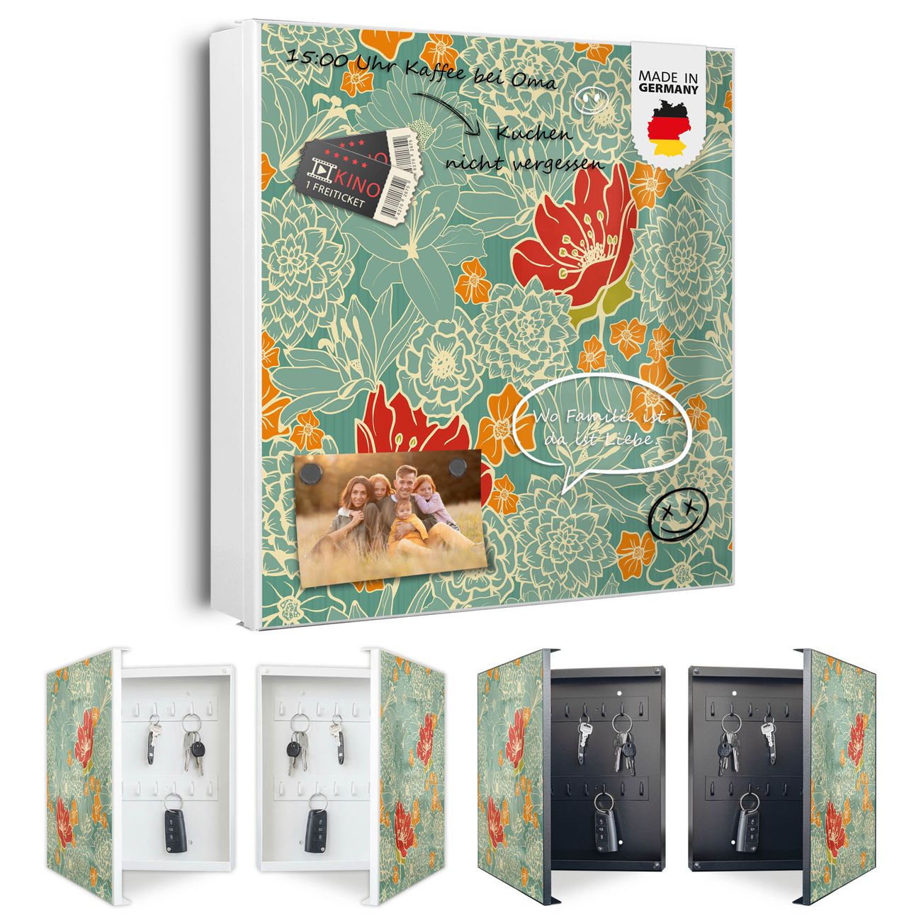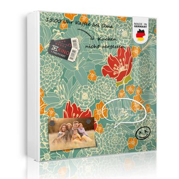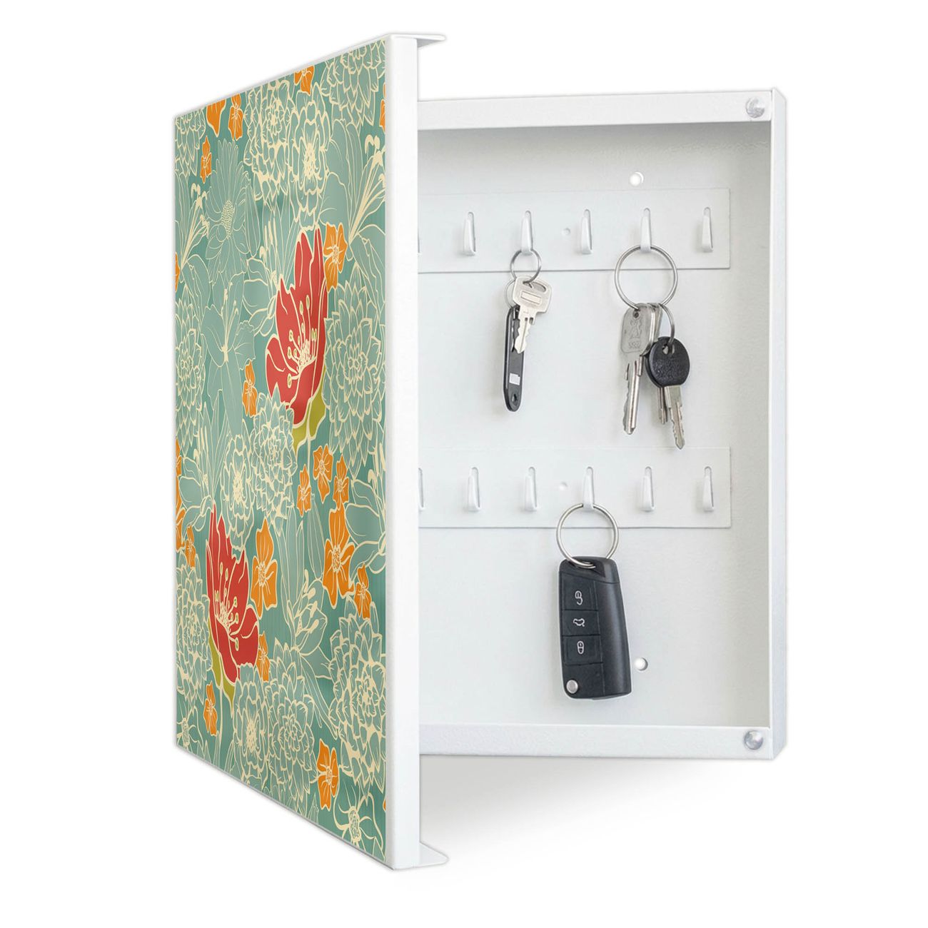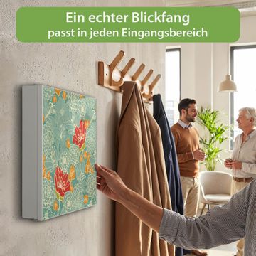 Bringe Ordnung und Eleganz in deinen Eingangsbereich mit dem banjado Schlüsselkasten Motiv Motiv Rote Blumen. Die moderne Schlüsselbox kombiniert funktionales Design mit hochwertiger Verarbeitung und wird so zu einem echten Hingucker in Flur, Büro oder Ferienwohnung. ✅ Stilvolle Schlüsselaufbewahrung mit Motiv Motiv Rote Blumen Der Design-Schlüsselkasten Motiv Motiv Rote Blumen bietet Platz für bis zu 32 Schlüssel, die auf 4 stabilen Reihen mit je 8 Haken übersichtlich verstaut werden. Mit seinen kompakten Maßen von 30 x 30 x 5 cm passt die Schlüsselbox perfekt auch in kleinere Räume. Der weiß lackierte Stahlkorpus mit links angeschlagenem Türscharnier harmoniert mit gedruckten Folie auf der Front und fügt sich nahtlos in jedes Wohnambiente ein. Ob als Schlüsselorganizer für Zuhause oder als praktische Lösung für Büros, Praxen und Gewerbe, der banjado Schlüsselkasten sorgt für Ordnung und Übersicht. Dank der magnetischen, mit Kreidestiften beschreibbaren Folie auf der Front kannst du Notizen anheften oder Termine direkt auf der Oberfläche festhalten. Die Schlüsselbox Motiv Motiv Rote Blumen zur Wandmontage wird inklusive Befestigungsmaterial geliefert und ist schnell angebracht. So hast du deine Schlüssel jederzeit griffbereit und zugleich stilvoll verstaut. Mit diesem banjado Schlüsselkasten Motiv Motiv Rote Blumen kombinierst du praktische Aufbewahrung mit stilvollem Wohndesign. Ob privat oder geschäftlich, die Schlüsselbox sorgt für mehr Ordnung, Übersicht und ein wohnliches Ambiente.Vorteile im Überblick