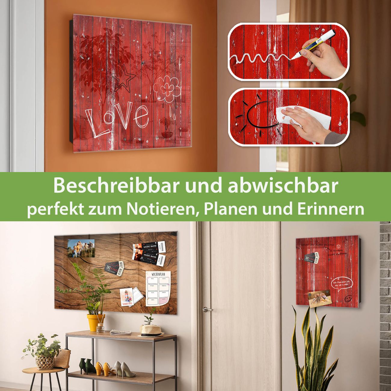 Bringe Ordnung und Eleganz in deinen Eingangsbereich mit dem banjado Schlüsselkasten Motiv Motiv Rote Holzlatten. Die moderne Schlüsselbox kombiniert funktionales Design mit hochwertiger Verarbeitung und wird so zu einem echten Hingucker in Flur, Büro oder Ferienwohnung. ✅ Stilvolle Schlüsselaufbewahrung mit Glasfront im Motiv Motiv Rote Holzlatten Der Design-Schlüsselkasten Motiv Motiv Rote Holzlatten bietet Platz für bis zu 50 Schlüssel, die auf 5 stabilen Reihen mit je 10 Haken übersichtlich verstaut werden. Mit seinen kompakten Maßen von 30 x 30 x 5 cm passt die Schlüsselbox perfekt auch in kleinere Räume. Der schwarz lackierte Stahlkorpus mit rechts angeschlagenem Türscharnier harmoniert mit der Glasfront und fügt sich nahtlos in jedes Wohnambiente ein. Ob als Schlüsselorganizer für Zuhause oder als praktische Lösung für Büros, Praxen und Gewerbe, der banjado Schlüsselkasten sorgt für Ordnung und Übersicht. Dank der magnetischen, mit Kreidestiften beschreibbaren Glasfront kannst du Notizen anheften oder Termine direkt auf der Oberfläche festhalten. Die Schlüsselbox Motiv Motiv Rote Holzlatten zur Wandmontage wird inklusive Befestigungsmaterial geliefert und ist schnell angebracht. So hast du deine Schlüssel jederzeit griffbereit und zugleich stilvoll verstaut. Mit diesem banjado Schlüsselkasten Motiv Motiv Rote Holzlatten kombinierst du praktische Aufbewahrung mit stilvollem Wohndesign. Ob privat oder geschäftlich, die Schlüsselbox sorgt für mehr Ordnung, Übersicht und ein wohnliches Ambiente.Vorteile im Überblick
