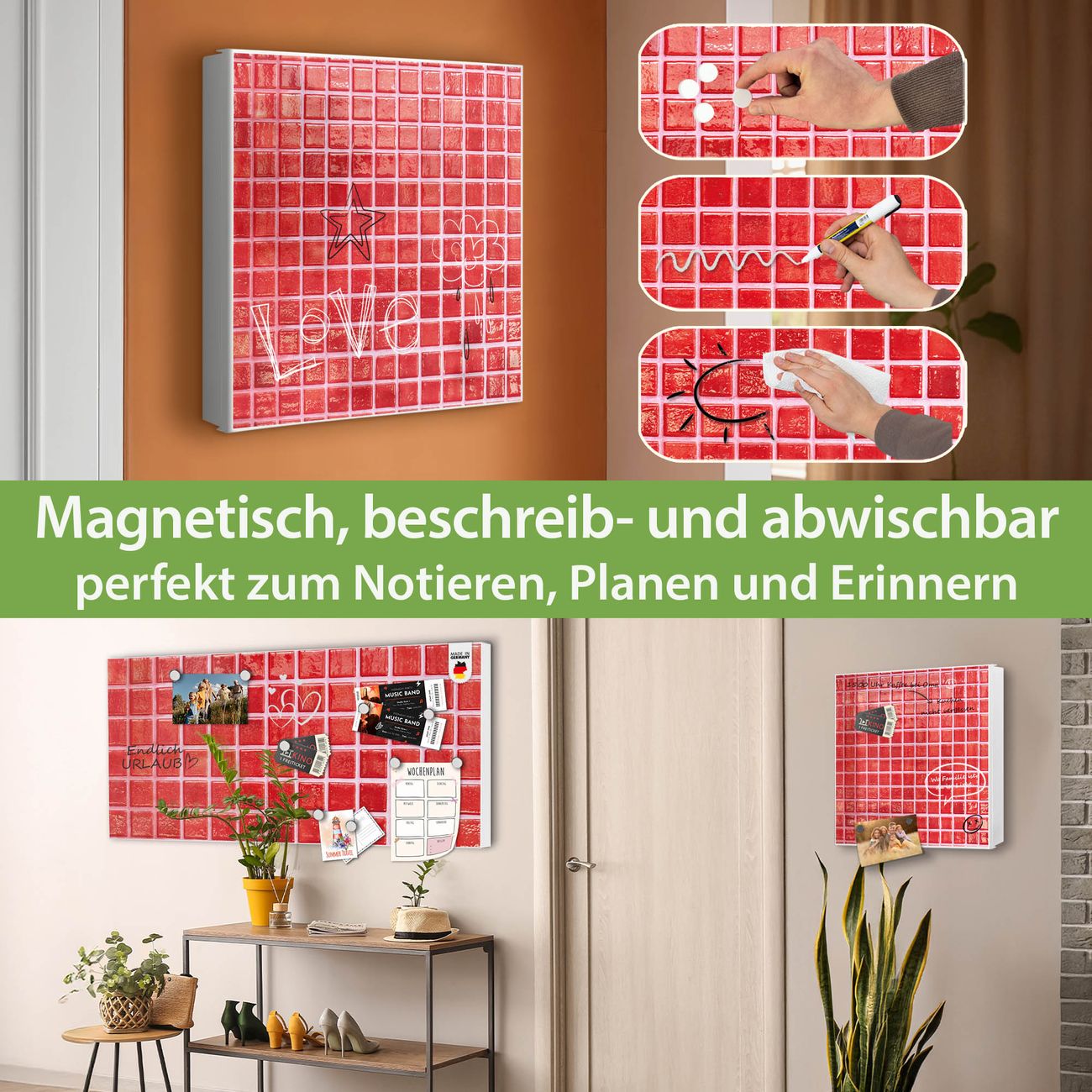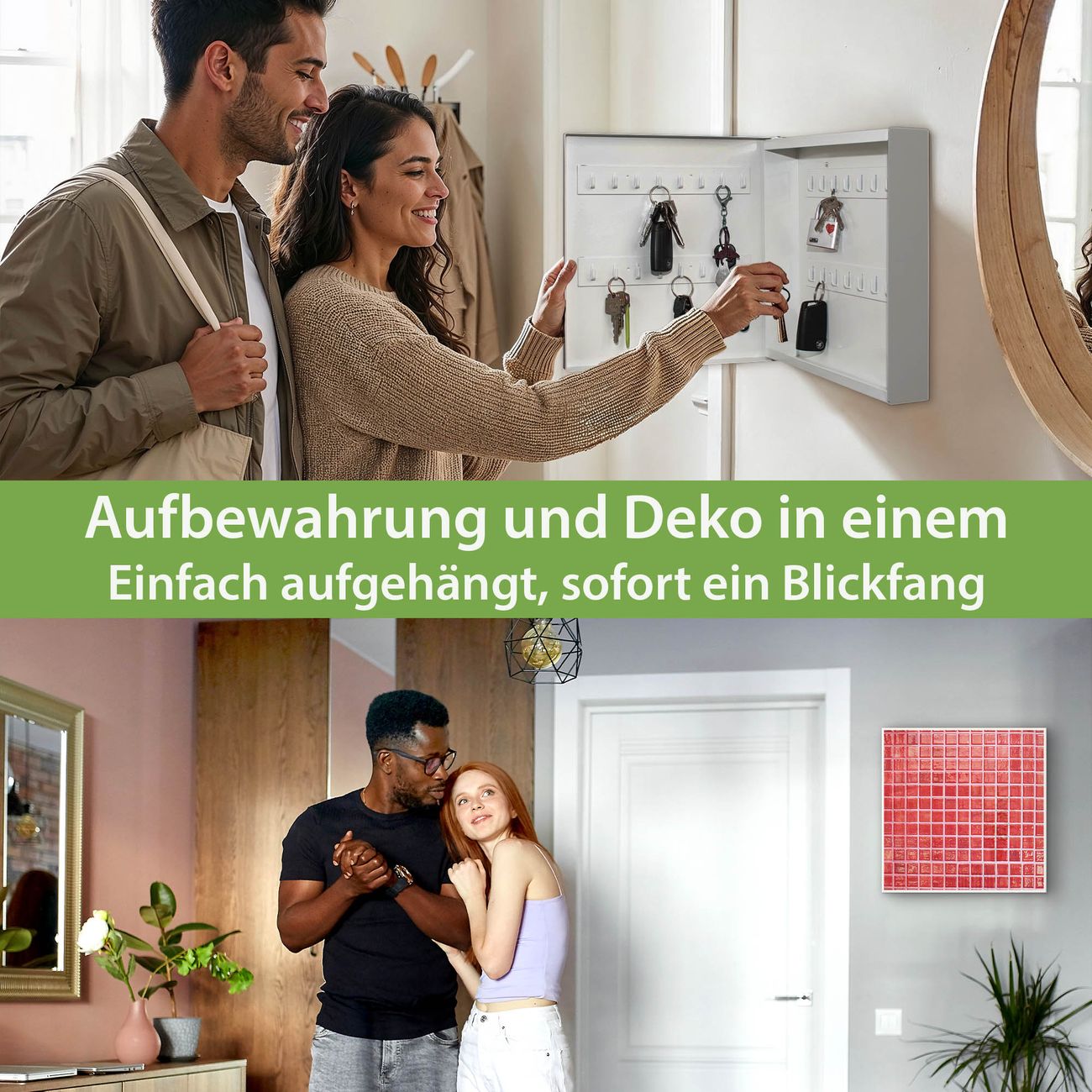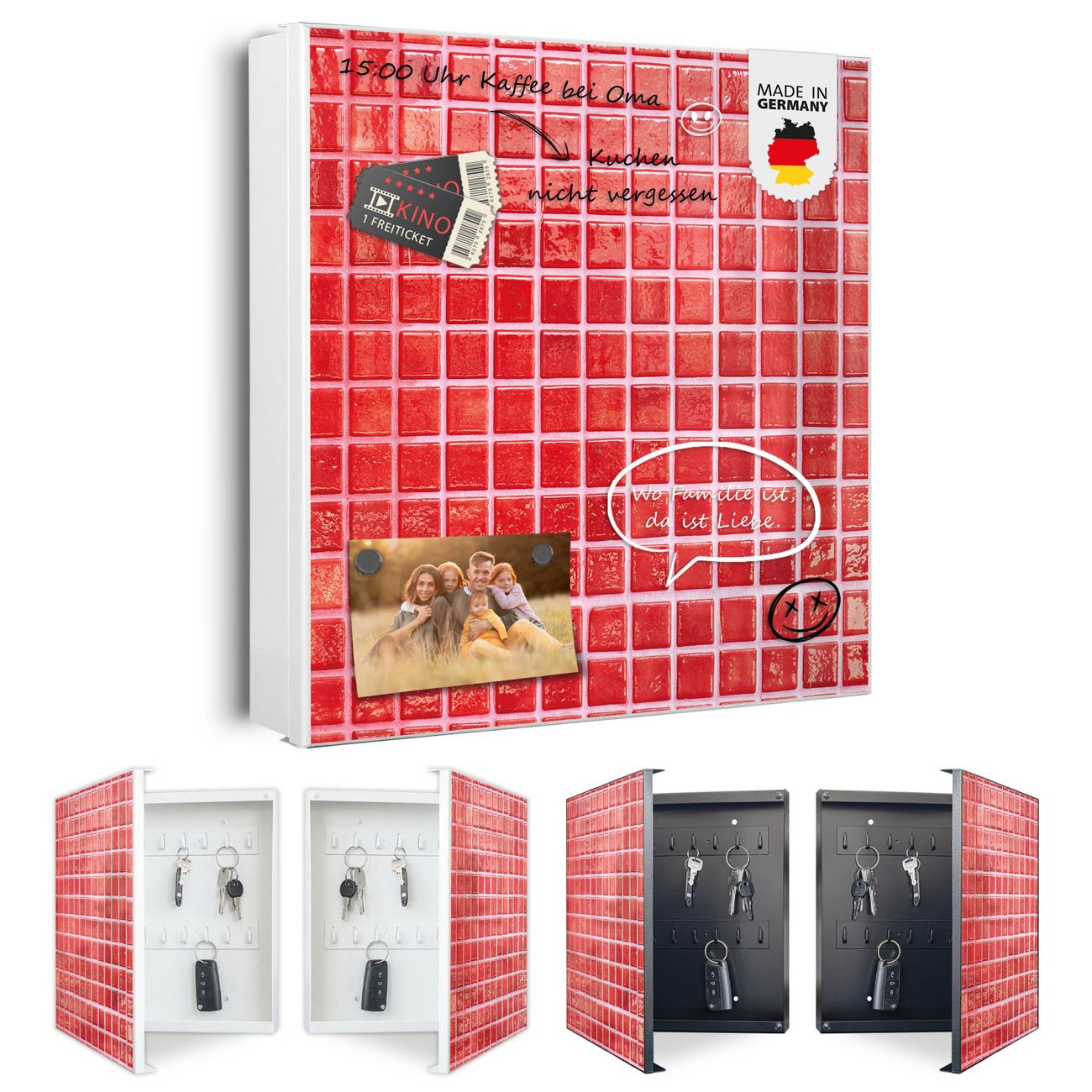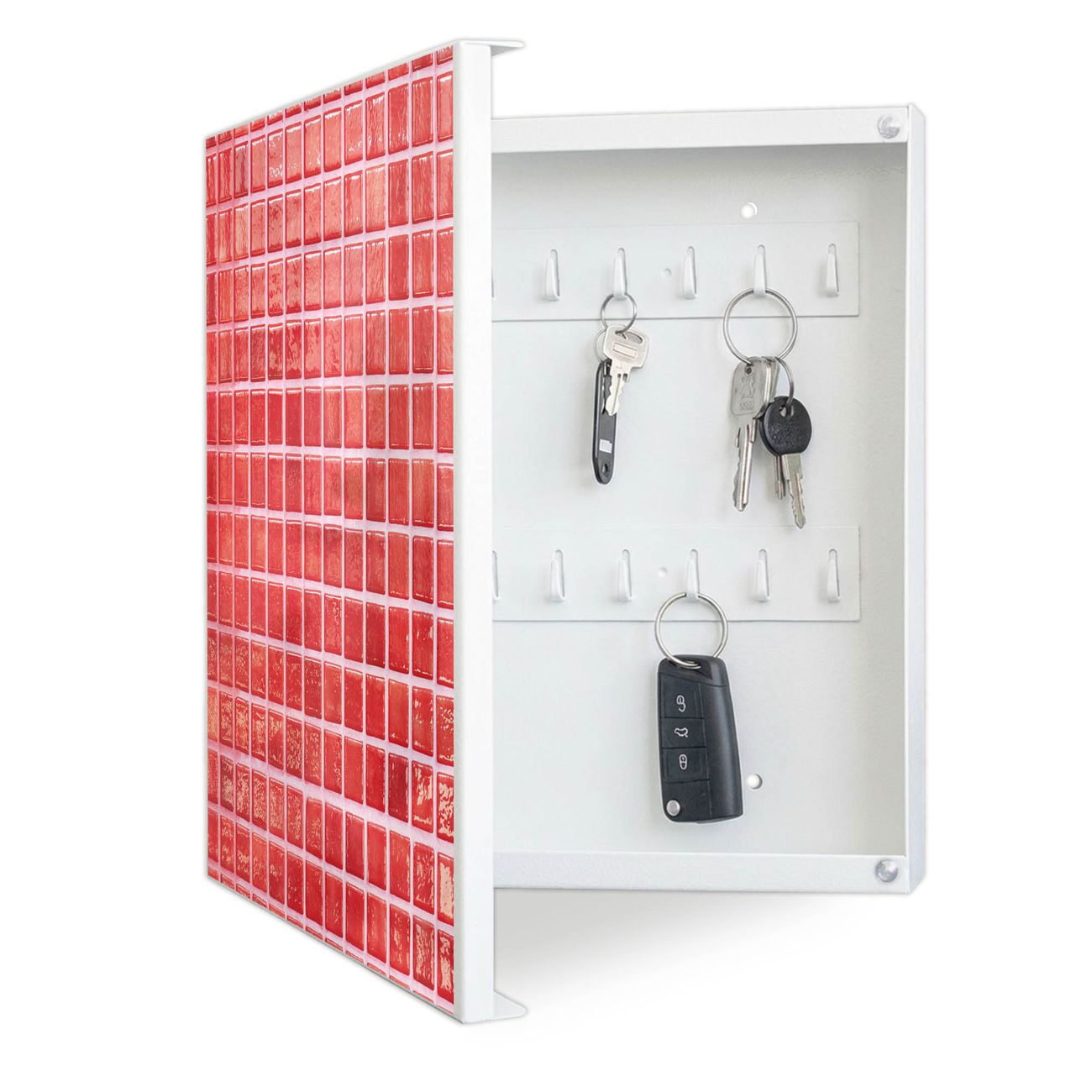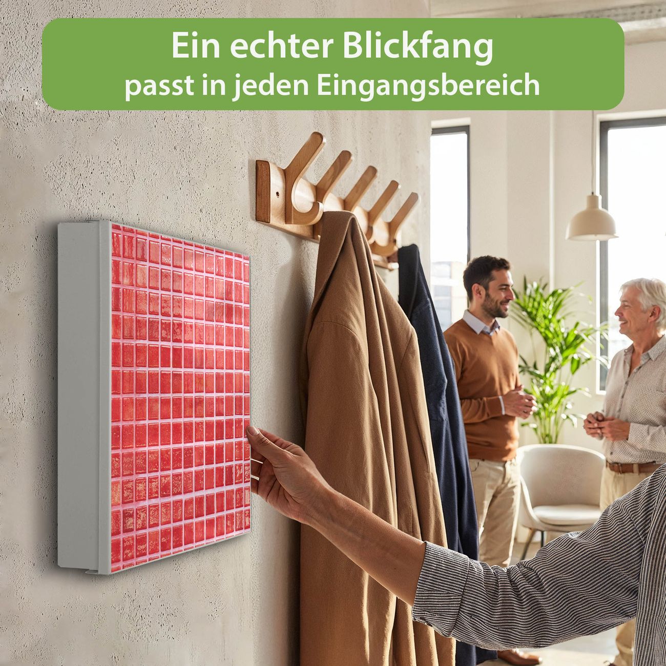 Bringe Ordnung und Eleganz in deinen Eingangsbereich mit dem banjado Schlüsselkasten Motiv Motiv Rote Kacheln. Die moderne Schlüsselbox kombiniert funktionales Design mit hochwertiger Verarbeitung und wird so zu einem echten Hingucker in Flur, Büro oder Ferienwohnung. ✅ Stilvolle Schlüsselaufbewahrung mit Motiv Motiv Rote Kacheln Der Design-Schlüsselkasten Motiv Motiv Rote Kacheln bietet Platz für bis zu 32 Schlüssel, die auf 4 stabilen Reihen mit je 8 Haken übersichtlich verstaut werden. Mit seinen kompakten Maßen von 30 x 30 x 5 cm passt die Schlüsselbox perfekt auch in kleinere Räume. Der weiß lackierte Stahlkorpus mit links angeschlagenem Türscharnier harmoniert mit gedruckten Folie auf der Front und fügt sich nahtlos in jedes Wohnambiente ein. Ob als Schlüsselorganizer für Zuhause oder als praktische Lösung für Büros, Praxen und Gewerbe, der banjado Schlüsselkasten sorgt für Ordnung und Übersicht. Dank der magnetischen, mit Kreidestiften beschreibbaren Folie auf der Front kannst du Notizen anheften oder Termine direkt auf der Oberfläche festhalten. Die Schlüsselbox Motiv Motiv Rote Kacheln zur Wandmontage wird inklusive Befestigungsmaterial geliefert und ist schnell angebracht. So hast du deine Schlüssel jederzeit griffbereit und zugleich stilvoll verstaut. Mit diesem banjado Schlüsselkasten Motiv Motiv Rote Kacheln kombinierst du praktische Aufbewahrung mit stilvollem Wohndesign. Ob privat oder geschäftlich, die Schlüsselbox sorgt für mehr Ordnung, Übersicht und ein wohnliches Ambiente.Vorteile im Überblick
