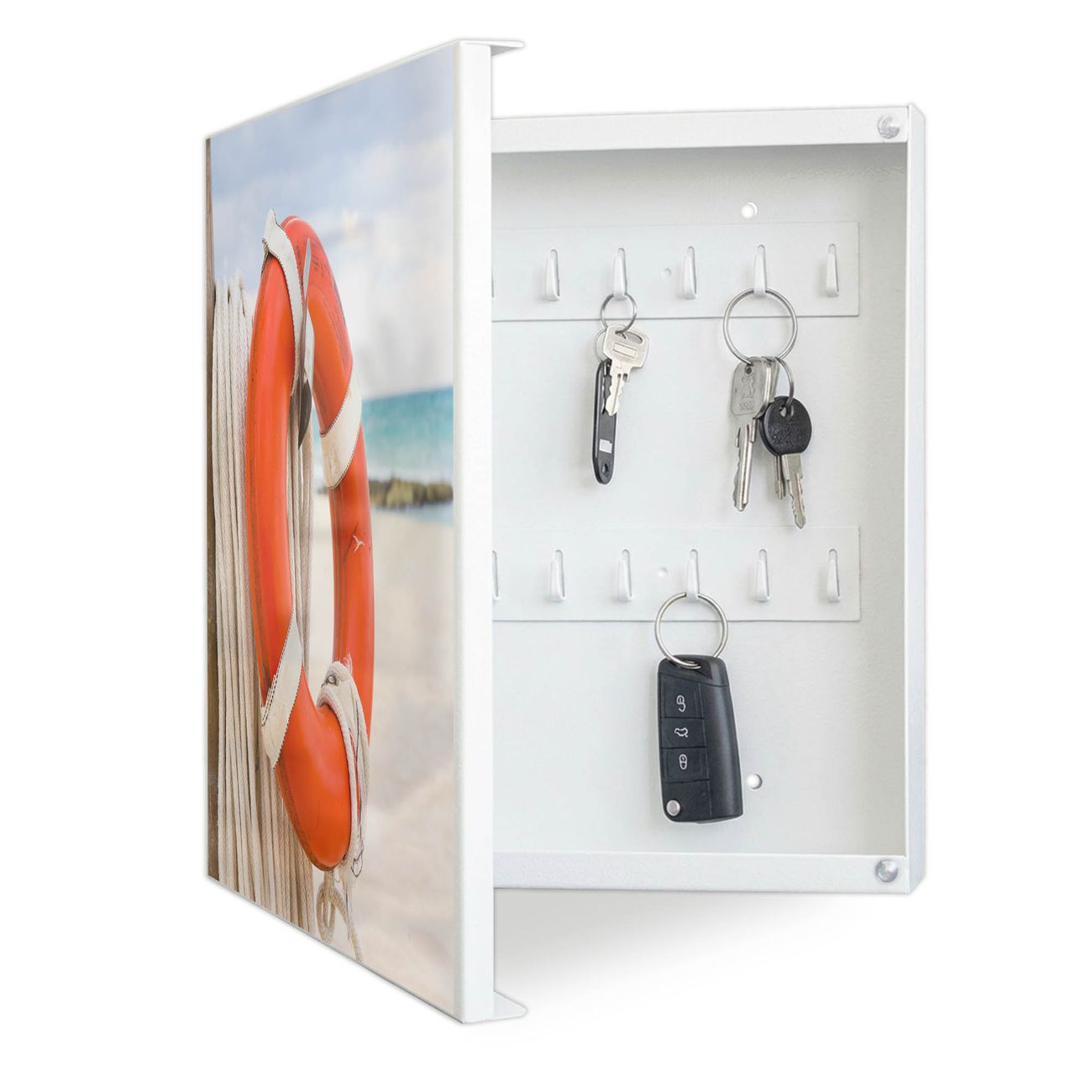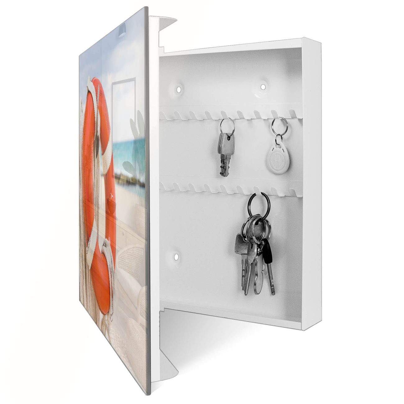 Bringe Ordnung und Eleganz in deinen Eingangsbereich mit dem banjado Schlüsselkasten Motiv Motiv Roter Rettungsring. Die moderne Schlüsselbox kombiniert funktionales Design mit hochwertiger Verarbeitung und wird so zu einem echten Hingucker in Flur, Büro oder Ferienwohnung. ✅ Stilvolle Schlüsselaufbewahrung mit Motiv Motiv Roter Rettungsring Der Design-Schlüsselkasten Motiv Motiv Roter Rettungsring bietet Platz für bis zu 32 Schlüssel, die auf 4 stabilen Reihen mit je 8 Haken übersichtlich verstaut werden. Mit seinen kompakten Maßen von 30 x 30 x 5 cm passt die Schlüsselbox perfekt auch in kleinere Räume. Der weiß lackierte Stahlkorpus mit links angeschlagenem Türscharnier harmoniert mit gedruckten Folie auf der Front und fügt sich nahtlos in jedes Wohnambiente ein. Ob als Schlüsselorganizer für Zuhause oder als praktische Lösung für Büros, Praxen und Gewerbe, der banjado Schlüsselkasten sorgt für Ordnung und Übersicht. Dank der magnetischen, mit Kreidestiften beschreibbaren Folie auf der Front kannst du Notizen anheften oder Termine direkt auf der Oberfläche festhalten. Die Schlüsselbox Motiv Motiv Roter Rettungsring zur Wandmontage wird inklusive Befestigungsmaterial geliefert und ist schnell angebracht. So hast du deine Schlüssel jederzeit griffbereit und zugleich stilvoll verstaut. Mit diesem banjado Schlüsselkasten Motiv Motiv Roter Rettungsring kombinierst du praktische Aufbewahrung mit stilvollem Wohndesign. Ob privat oder geschäftlich, die Schlüsselbox sorgt für mehr Ordnung, Übersicht und ein wohnliches Ambiente.Vorteile im Überblick