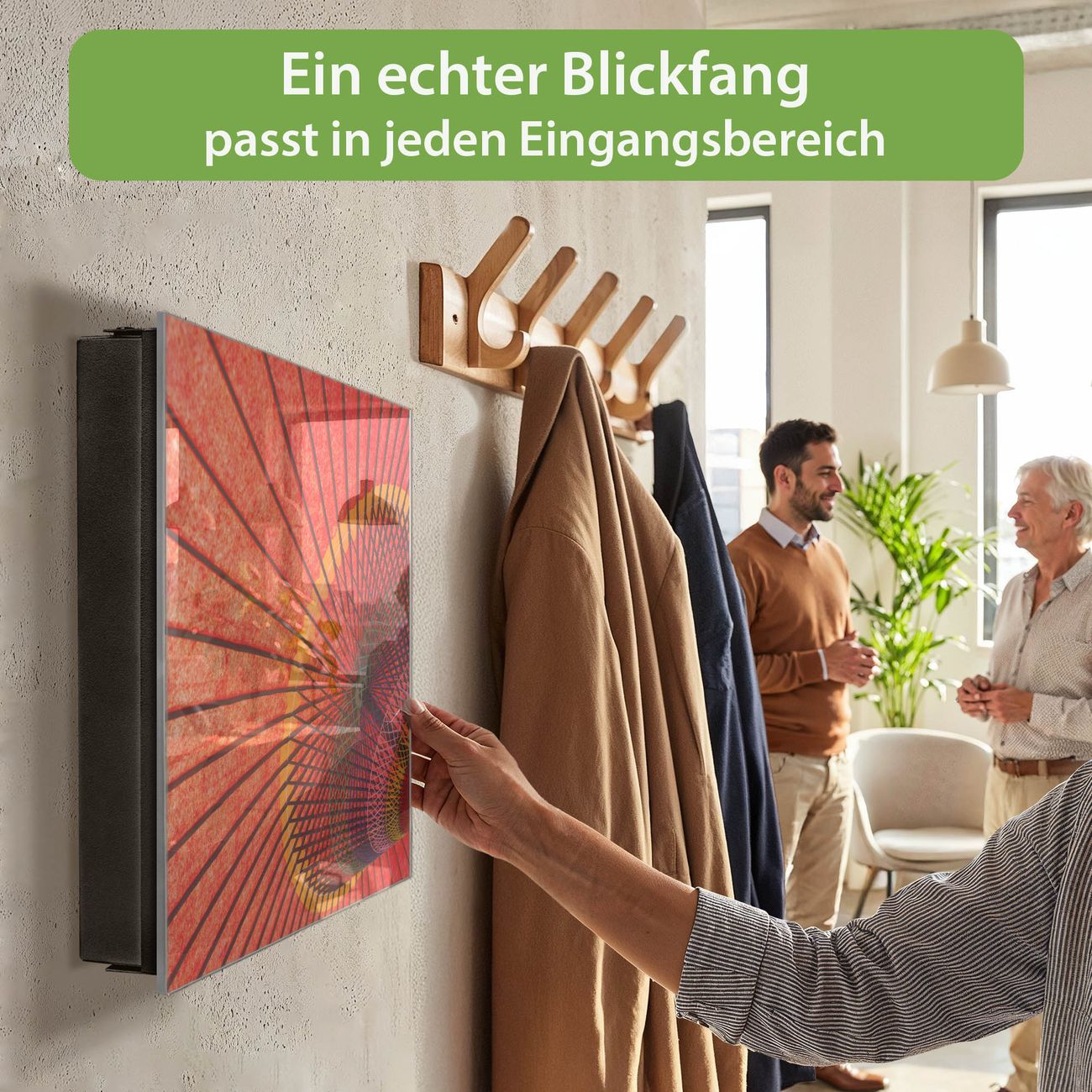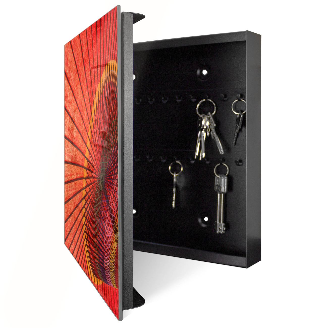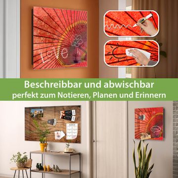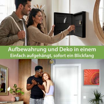 Bringe Ordnung und Eleganz in deinen Eingangsbereich mit dem banjado Schlüsselkasten Motiv Motiv Roter Schirm. Die moderne Schlüsselbox kombiniert funktionales Design mit hochwertiger Verarbeitung und wird so zu einem echten Hingucker in Flur, Büro oder Ferienwohnung. ✅ Stilvolle Schlüsselaufbewahrung mit Glasfront im Motiv Motiv Roter Schirm Der Design-Schlüsselkasten Motiv Motiv Roter Schirm bietet Platz für bis zu 50 Schlüssel, die auf 5 stabilen Reihen mit je 10 Haken übersichtlich verstaut werden. Mit seinen kompakten Maßen von 30 x 30 x 5 cm passt die Schlüsselbox perfekt auch in kleinere Räume. Der schwarz lackierte Stahlkorpus mit rechts angeschlagenem Türscharnier harmoniert mit der Glasfront und fügt sich nahtlos in jedes Wohnambiente ein. Ob als Schlüsselorganizer für Zuhause oder als praktische Lösung für Büros, Praxen und Gewerbe, der banjado Schlüsselkasten sorgt für Ordnung und Übersicht. Dank der magnetischen, mit Kreidestiften beschreibbaren Glasfront kannst du Notizen anheften oder Termine direkt auf der Oberfläche festhalten. Die Schlüsselbox Motiv Motiv Roter Schirm zur Wandmontage wird inklusive Befestigungsmaterial geliefert und ist schnell angebracht. So hast du deine Schlüssel jederzeit griffbereit und zugleich stilvoll verstaut. Mit diesem banjado Schlüsselkasten Motiv Motiv Roter Schirm kombinierst du praktische Aufbewahrung mit stilvollem Wohndesign. Ob privat oder geschäftlich, die Schlüsselbox sorgt für mehr Ordnung, Übersicht und ein wohnliches Ambiente.Vorteile im Überblick