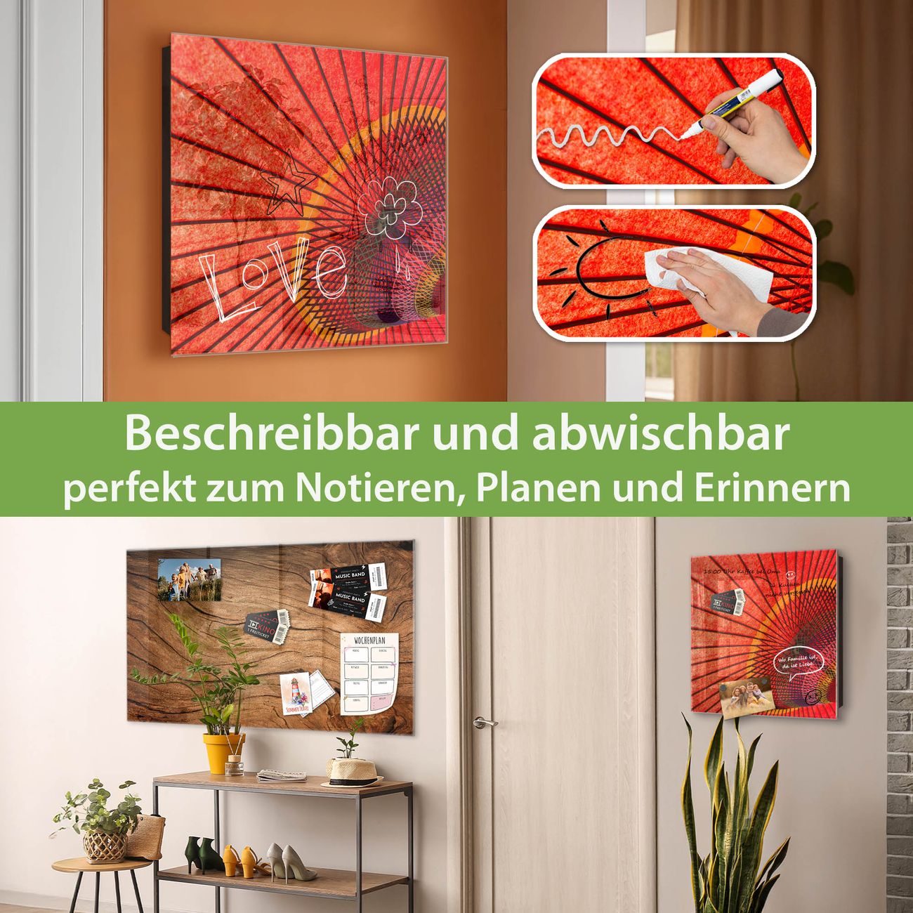 ✅ Magnetisch und mit Kreidestift beschreibbar, gehärtetes Glas, links angeschlagene TürOrdnung und Design in einem