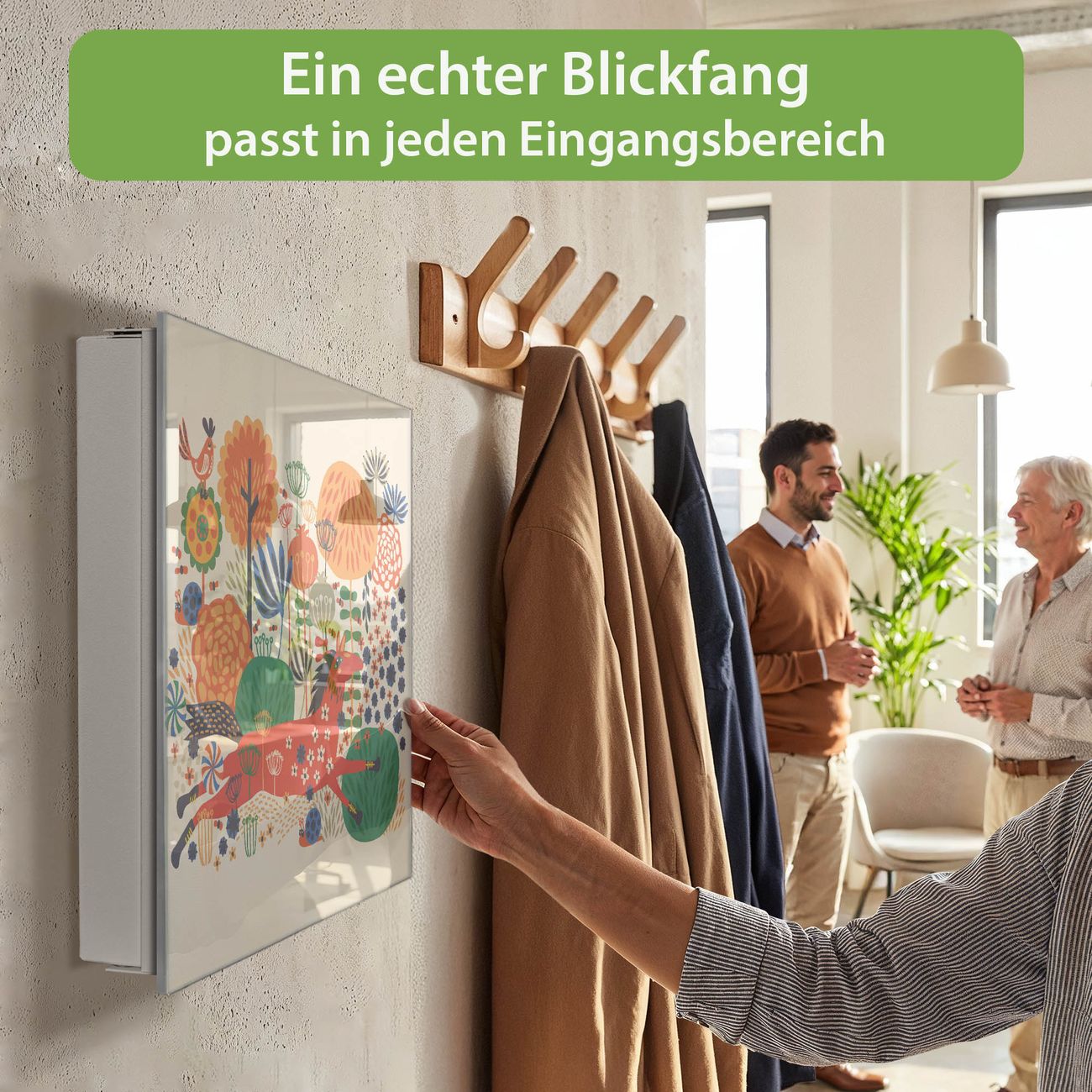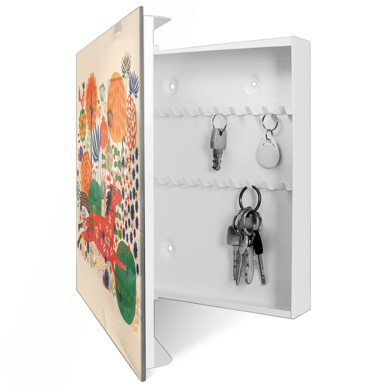 Bringe Ordnung und Eleganz in deinen Eingangsbereich mit dem banjado Schlüsselkasten Motiv Motiv Rotes Pferd. Die moderne Schlüsselbox kombiniert funktionales Design mit hochwertiger Verarbeitung und wird so zu einem echten Hingucker in Flur, Büro oder Ferienwohnung. ✅ Stilvolle Schlüsselaufbewahrung mit Glasfront im Motiv Motiv Rotes Pferd Der Design-Schlüsselkasten Motiv Motiv Rotes Pferd bietet Platz für bis zu 50 Schlüssel, die auf 5 stabilen Reihen mit je 10 Haken übersichtlich verstaut werden. Mit seinen kompakten Maßen von 30 x 30 x 5 cm passt die Schlüsselbox perfekt auch in kleinere Räume. Der weiß lackierte Stahlkorpus mit rechts angeschlagenem Türscharnier harmoniert mit der Glasfront und fügt sich nahtlos in jedes Wohnambiente ein. Ob als Schlüsselorganizer für Zuhause oder als praktische Lösung für Büros, Praxen und Gewerbe, der banjado Schlüsselkasten sorgt für Ordnung und Übersicht. Dank der magnetischen, mit Kreidestiften beschreibbaren Glasfront kannst du Notizen anheften oder Termine direkt auf der Oberfläche festhalten. Die Schlüsselbox Motiv Motiv Rotes Pferd zur Wandmontage wird inklusive Befestigungsmaterial geliefert und ist schnell angebracht. So hast du deine Schlüssel jederzeit griffbereit und zugleich stilvoll verstaut. Mit diesem banjado Schlüsselkasten Motiv Motiv Rotes Pferd kombinierst du praktische Aufbewahrung mit stilvollem Wohndesign. Ob privat oder geschäftlich, die Schlüsselbox sorgt für mehr Ordnung, Übersicht und ein wohnliches Ambiente.Vorteile im Überblick