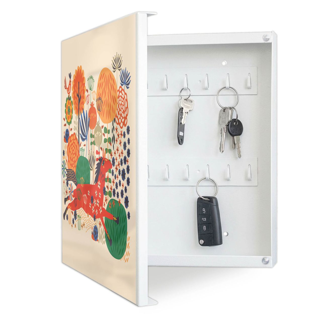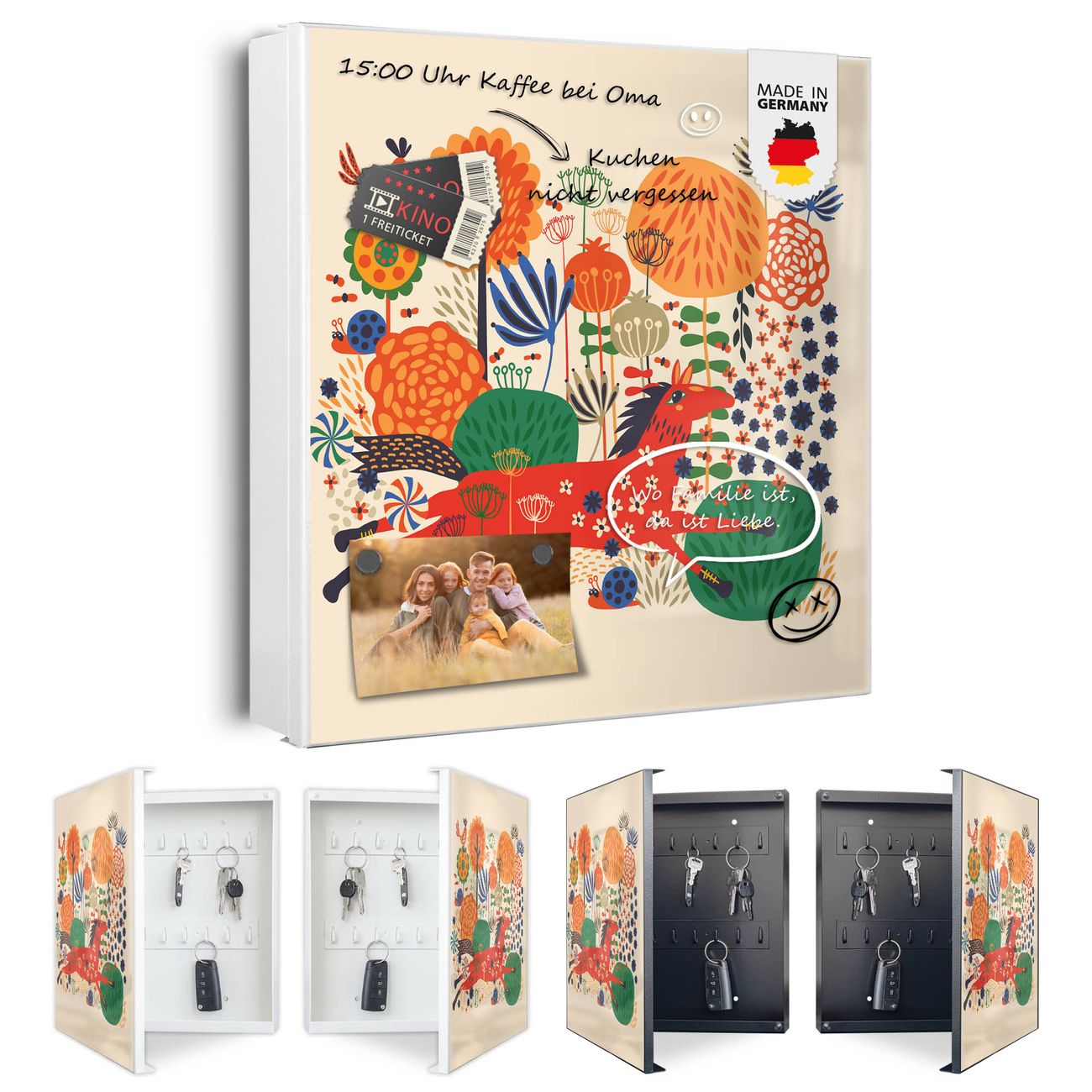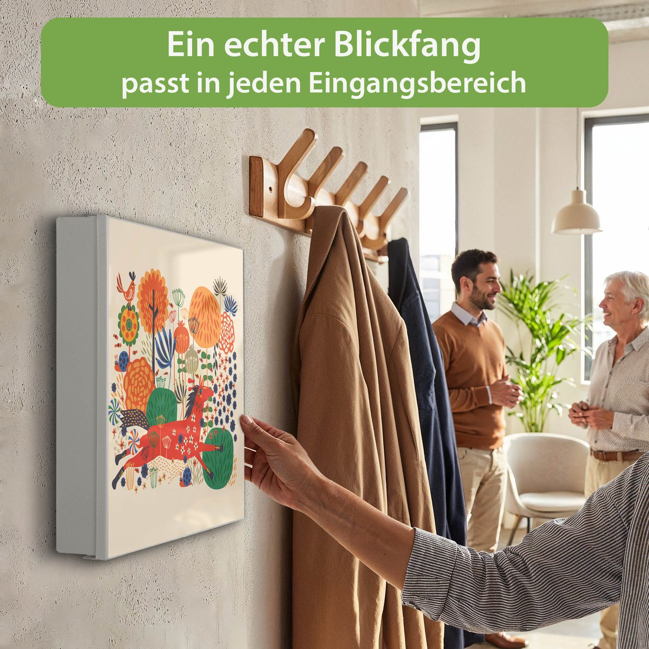 Bringe Ordnung und Eleganz in deinen Eingangsbereich mit dem banjado Schlüsselkasten Motiv Motiv Rotes Pferd. Die moderne Schlüsselbox kombiniert funktionales Design mit hochwertiger Verarbeitung und wird so zu einem echten Hingucker in Flur, Büro oder Ferienwohnung. ✅ Stilvolle Schlüsselaufbewahrung mit Motiv Motiv Rotes Pferd Der Design-Schlüsselkasten Motiv Motiv Rotes Pferd bietet Platz für bis zu 32 Schlüssel, die auf 4 stabilen Reihen mit je 8 Haken übersichtlich verstaut werden. Mit seinen kompakten Maßen von 30 x 30 x 5 cm passt die Schlüsselbox perfekt auch in kleinere Räume. Der weiß lackierte Stahlkorpus mit links angeschlagenem Türscharnier harmoniert mit gedruckten Folie auf der Front und fügt sich nahtlos in jedes Wohnambiente ein. Ob als Schlüsselorganizer für Zuhause oder als praktische Lösung für Büros, Praxen und Gewerbe, der banjado Schlüsselkasten sorgt für Ordnung und Übersicht. Dank der magnetischen, mit Kreidestiften beschreibbaren Folie auf der Front kannst du Notizen anheften oder Termine direkt auf der Oberfläche festhalten. Die Schlüsselbox Motiv Motiv Rotes Pferd zur Wandmontage wird inklusive Befestigungsmaterial geliefert und ist schnell angebracht. So hast du deine Schlüssel jederzeit griffbereit und zugleich stilvoll verstaut. Mit diesem banjado Schlüsselkasten Motiv Motiv Rotes Pferd kombinierst du praktische Aufbewahrung mit stilvollem Wohndesign. Ob privat oder geschäftlich, die Schlüsselbox sorgt für mehr Ordnung, Übersicht und ein wohnliches Ambiente.Vorteile im Überblick