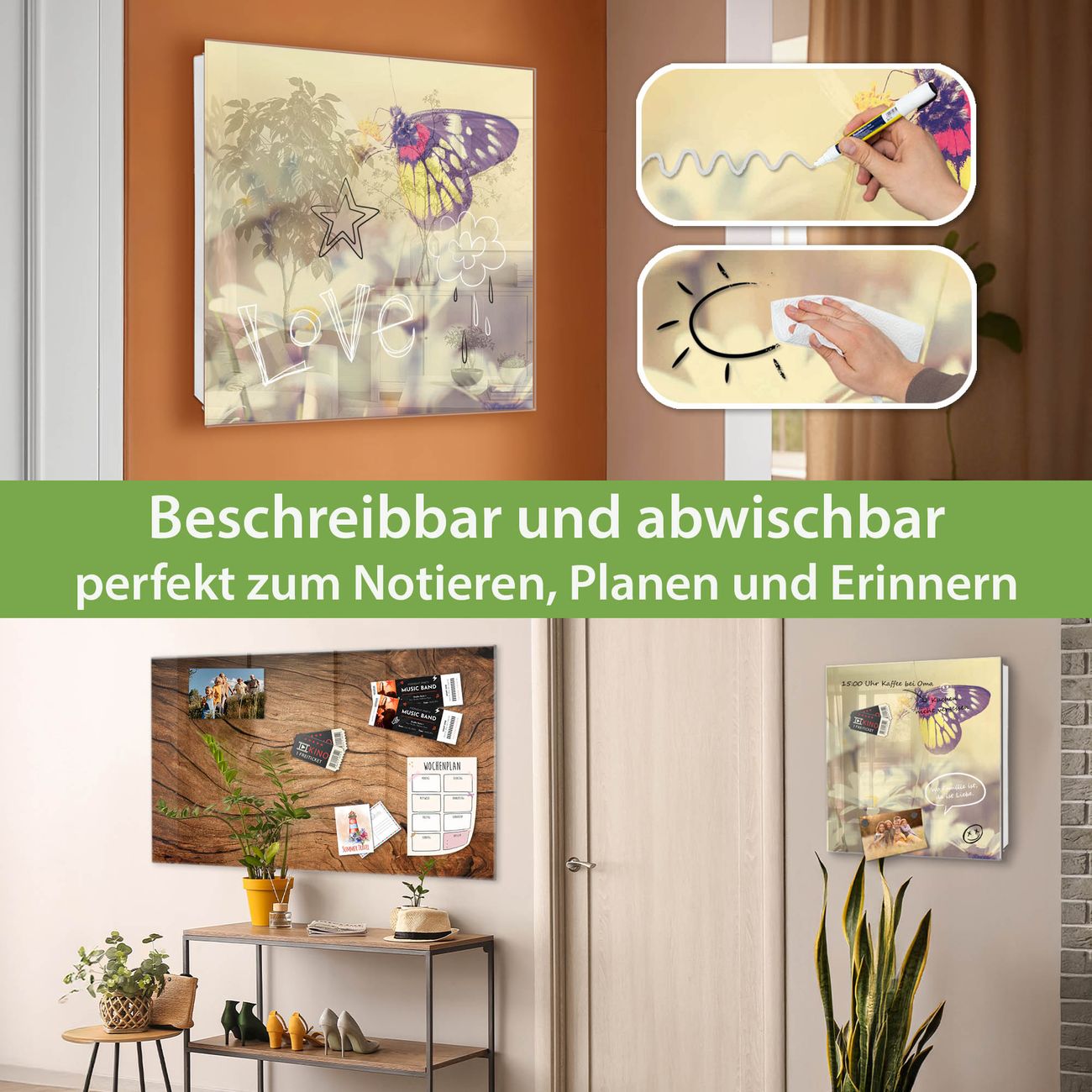 Bringe Ordnung und Eleganz in deinen Eingangsbereich mit dem banjado Schlüsselkasten Motiv Motiv Rotgelber Falter. Die moderne Schlüsselbox kombiniert funktionales Design mit hochwertiger Verarbeitung und wird so zu einem echten Hingucker in Flur, Büro oder Ferienwohnung. ✅ Stilvolle Schlüsselaufbewahrung mit Glasfront im Motiv Motiv Rotgelber Falter Der Design-Schlüsselkasten Motiv Motiv Rotgelber Falter bietet Platz für bis zu 50 Schlüssel, die auf 5 stabilen Reihen mit je 10 Haken übersichtlich verstaut werden. Mit seinen kompakten Maßen von 30 x 30 x 5 cm passt die Schlüsselbox perfekt auch in kleinere Räume. Der weiß lackierte Stahlkorpus mit rechts angeschlagenem Türscharnier harmoniert mit der Glasfront und fügt sich nahtlos in jedes Wohnambiente ein. Ob als Schlüsselorganizer für Zuhause oder als praktische Lösung für Büros, Praxen und Gewerbe, der banjado Schlüsselkasten sorgt für Ordnung und Übersicht. Dank der magnetischen, mit Kreidestiften beschreibbaren Glasfront kannst du Notizen anheften oder Termine direkt auf der Oberfläche festhalten. Die Schlüsselbox Motiv Motiv Rotgelber Falter zur Wandmontage wird inklusive Befestigungsmaterial geliefert und ist schnell angebracht. So hast du deine Schlüssel jederzeit griffbereit und zugleich stilvoll verstaut. Mit diesem banjado Schlüsselkasten Motiv Motiv Rotgelber Falter kombinierst du praktische Aufbewahrung mit stilvollem Wohndesign. Ob privat oder geschäftlich, die Schlüsselbox sorgt für mehr Ordnung, Übersicht und ein wohnliches Ambiente.Vorteile im Überblick