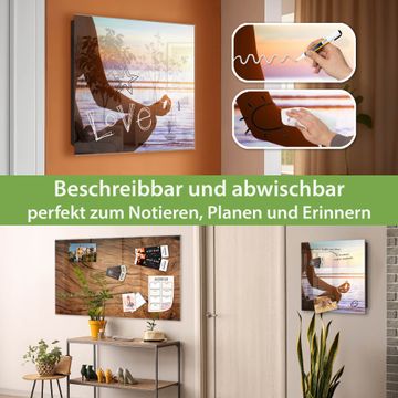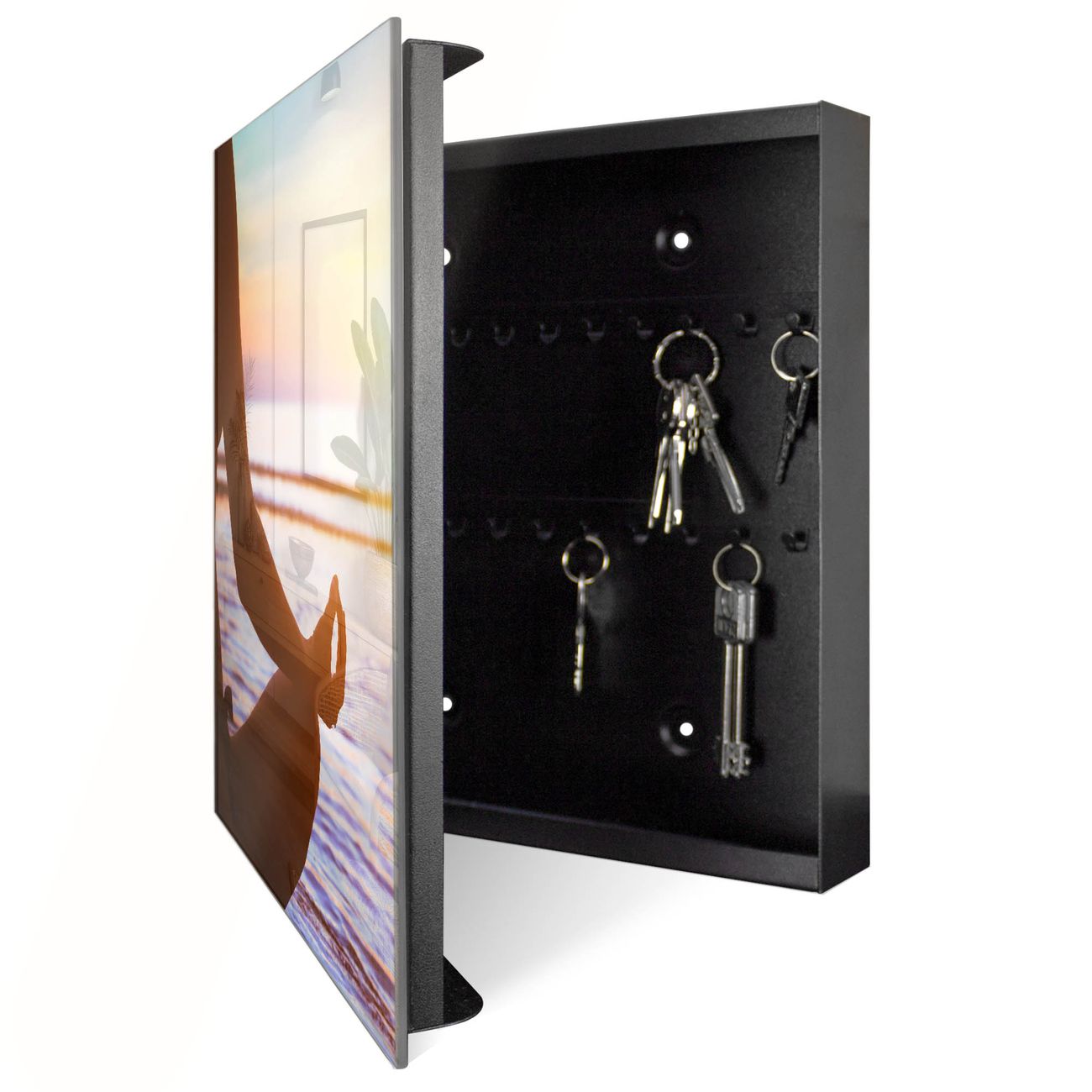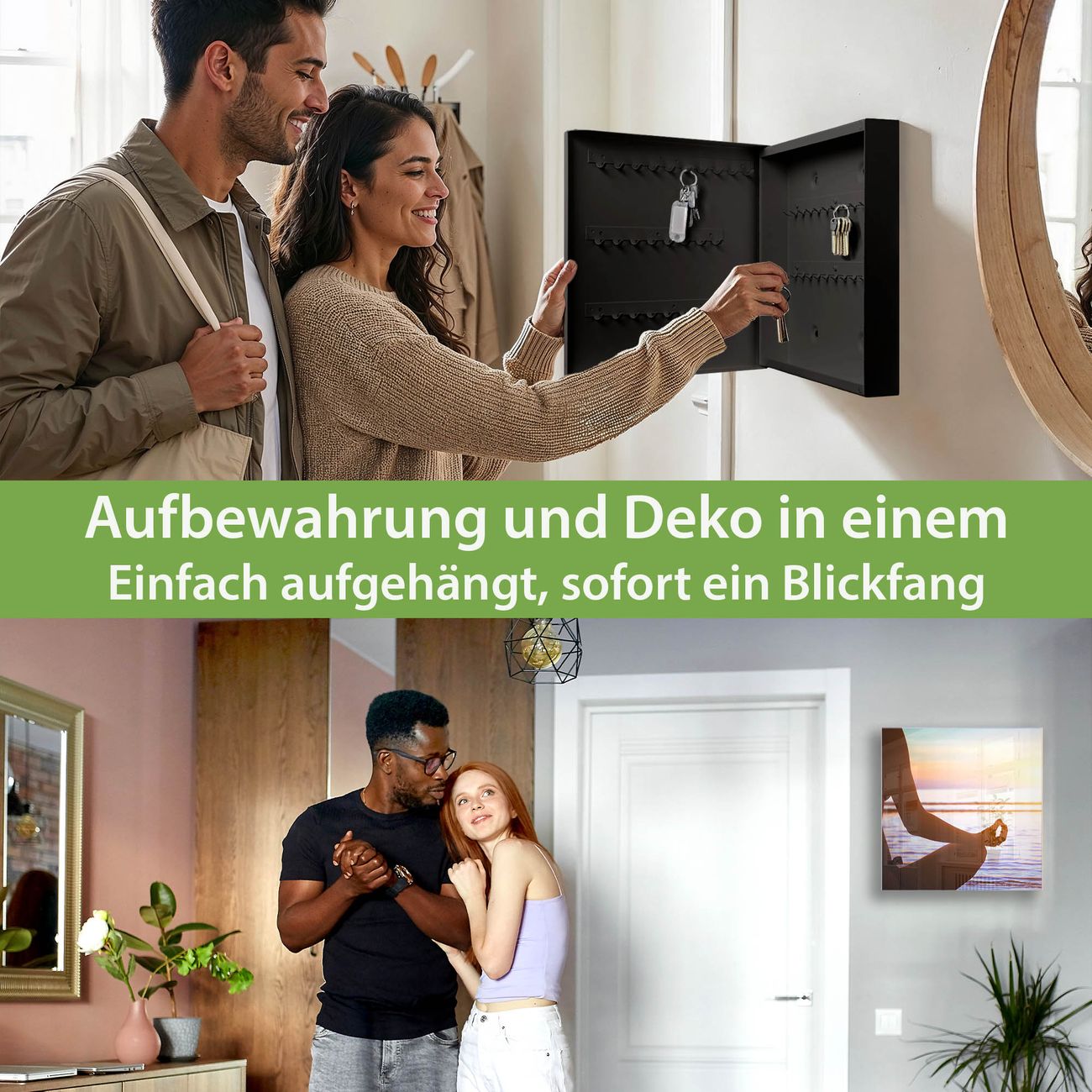 Bringe Ordnung und Eleganz in deinen Eingangsbereich mit dem banjado Schlüsselkasten Motiv Motiv Ruhe. Die moderne Schlüsselbox kombiniert funktionales Design mit hochwertiger Verarbeitung und wird so zu einem echten Hingucker in Flur, Büro oder Ferienwohnung. ✅ Stilvolle Schlüsselaufbewahrung mit Glasfront im Motiv Motiv Ruhe Der Design-Schlüsselkasten Motiv Motiv Ruhe bietet Platz für bis zu 50 Schlüssel, die auf 5 stabilen Reihen mit je 10 Haken übersichtlich verstaut werden. Mit seinen kompakten Maßen von 30 x 30 x 5 cm passt die Schlüsselbox perfekt auch in kleinere Räume. Der schwarz lackierte Stahlkorpus mit rechts angeschlagenem Türscharnier harmoniert mit der Glasfront und fügt sich nahtlos in jedes Wohnambiente ein. Ob als Schlüsselorganizer für Zuhause oder als praktische Lösung für Büros, Praxen und Gewerbe, der banjado Schlüsselkasten sorgt für Ordnung und Übersicht. Dank der magnetischen, mit Kreidestiften beschreibbaren Glasfront kannst du Notizen anheften oder Termine direkt auf der Oberfläche festhalten. Die Schlüsselbox Motiv Motiv Ruhe zur Wandmontage wird inklusive Befestigungsmaterial geliefert und ist schnell angebracht. So hast du deine Schlüssel jederzeit griffbereit und zugleich stilvoll verstaut. Mit diesem banjado Schlüsselkasten Motiv Motiv Ruhe kombinierst du praktische Aufbewahrung mit stilvollem Wohndesign. Ob privat oder geschäftlich, die Schlüsselbox sorgt für mehr Ordnung, Übersicht und ein wohnliches Ambiente.Vorteile im Überblick