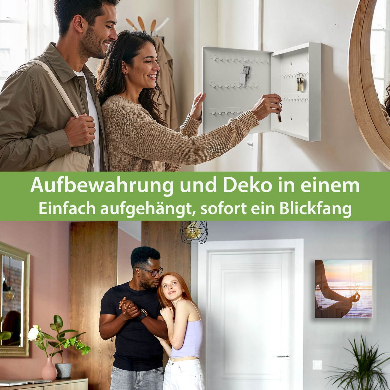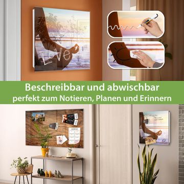 Bringe Ordnung und Eleganz in deinen Eingangsbereich mit dem banjado Schlüsselkasten Motiv Motiv Ruhe. Die moderne Schlüsselbox kombiniert funktionales Design mit hochwertiger Verarbeitung und wird so zu einem echten Hingucker in Flur, Büro oder Ferienwohnung. ✅ Stilvolle Schlüsselaufbewahrung mit Glasfront im Motiv Motiv Ruhe Der Design-Schlüsselkasten Motiv Motiv Ruhe bietet Platz für bis zu 50 Schlüssel, die auf 5 stabilen Reihen mit je 10 Haken übersichtlich verstaut werden. Mit seinen kompakten Maßen von 30 x 30 x 5 cm passt die Schlüsselbox perfekt auch in kleinere Räume. Der weiß lackierte Stahlkorpus mit rechts angeschlagenem Türscharnier harmoniert mit der Glasfront und fügt sich nahtlos in jedes Wohnambiente ein. Ob als Schlüsselorganizer für Zuhause oder als praktische Lösung für Büros, Praxen und Gewerbe, der banjado Schlüsselkasten sorgt für Ordnung und Übersicht. Dank der magnetischen, mit Kreidestiften beschreibbaren Glasfront kannst du Notizen anheften oder Termine direkt auf der Oberfläche festhalten. Die Schlüsselbox Motiv Motiv Ruhe zur Wandmontage wird inklusive Befestigungsmaterial geliefert und ist schnell angebracht. So hast du deine Schlüssel jederzeit griffbereit und zugleich stilvoll verstaut. Mit diesem banjado Schlüsselkasten Motiv Motiv Ruhe kombinierst du praktische Aufbewahrung mit stilvollem Wohndesign. Ob privat oder geschäftlich, die Schlüsselbox sorgt für mehr Ordnung, Übersicht und ein wohnliches Ambiente.Vorteile im Überblick