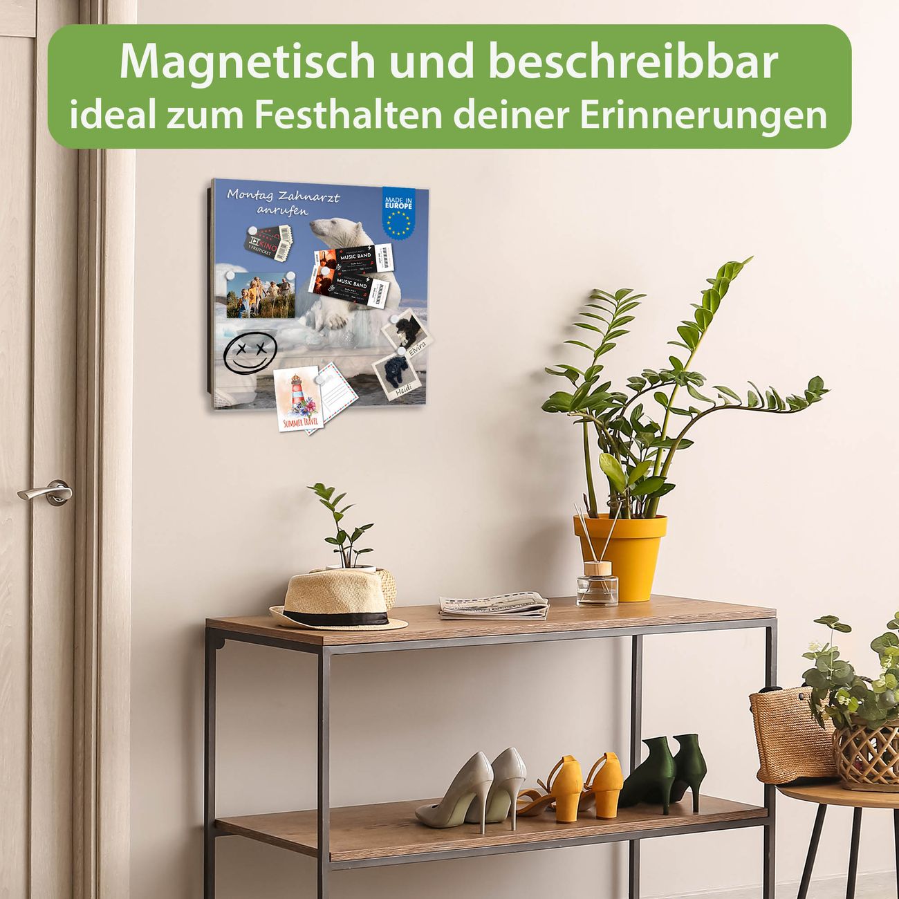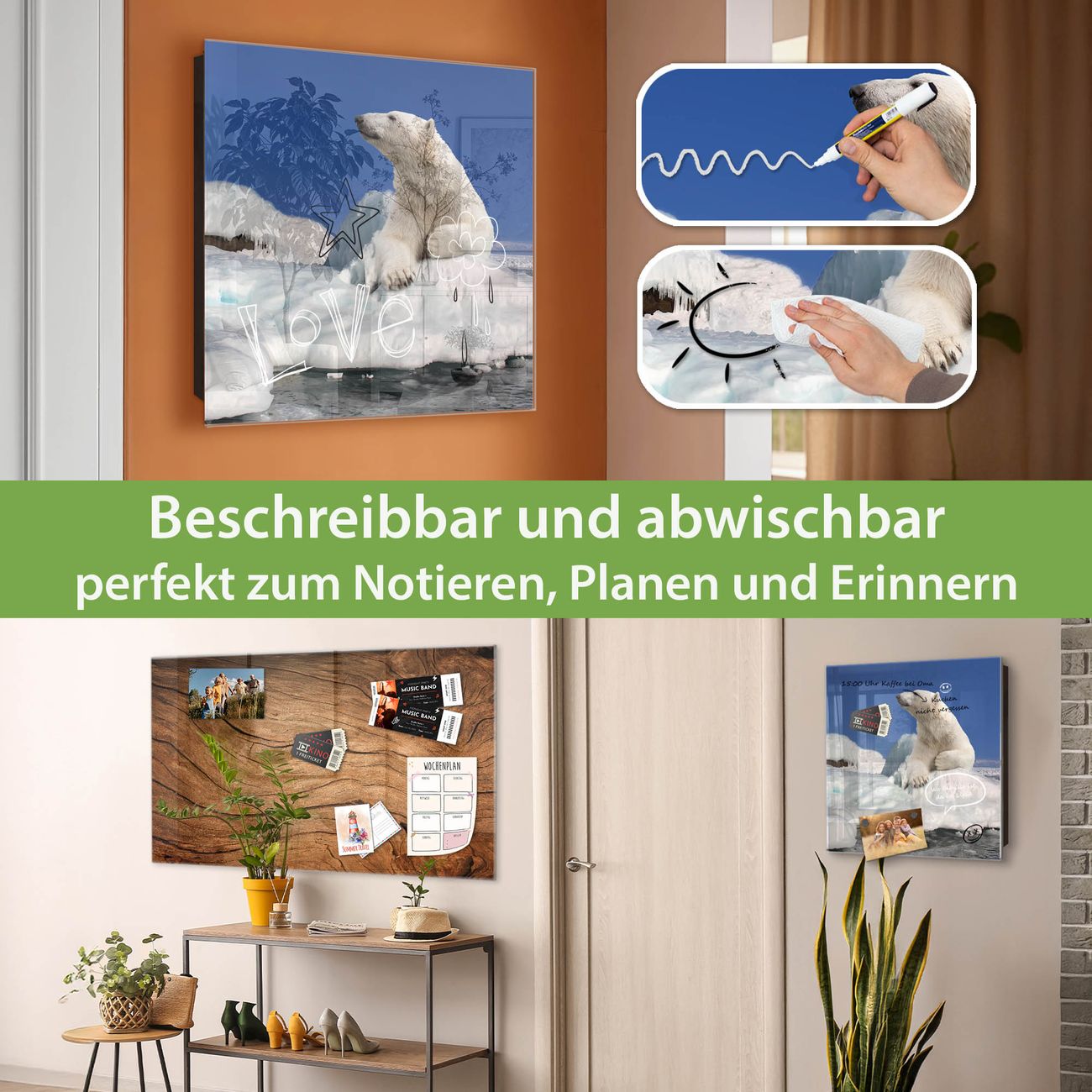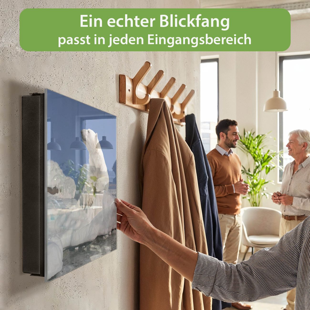 Bringe Ordnung und Eleganz in deinen Eingangsbereich mit dem banjado Schlüsselkasten Motiv Motiv Ruhender Eisbär. Die moderne Schlüsselbox kombiniert funktionales Design mit hochwertiger Verarbeitung und wird so zu einem echten Hingucker in Flur, Büro oder Ferienwohnung. ✅ Stilvolle Schlüsselaufbewahrung mit Glasfront im Motiv Motiv Ruhender Eisbär Der Design-Schlüsselkasten Motiv Motiv Ruhender Eisbär bietet Platz für bis zu 50 Schlüssel, die auf 5 stabilen Reihen mit je 10 Haken übersichtlich verstaut werden. Mit seinen kompakten Maßen von 30 x 30 x 5 cm passt die Schlüsselbox perfekt auch in kleinere Räume. Der schwarz lackierte Stahlkorpus mit rechts angeschlagenem Türscharnier harmoniert mit der Glasfront und fügt sich nahtlos in jedes Wohnambiente ein. Ob als Schlüsselorganizer für Zuhause oder als praktische Lösung für Büros, Praxen und Gewerbe, der banjado Schlüsselkasten sorgt für Ordnung und Übersicht. Dank der magnetischen, mit Kreidestiften beschreibbaren Glasfront kannst du Notizen anheften oder Termine direkt auf der Oberfläche festhalten. Die Schlüsselbox Motiv Motiv Ruhender Eisbär zur Wandmontage wird inklusive Befestigungsmaterial geliefert und ist schnell angebracht. So hast du deine Schlüssel jederzeit griffbereit und zugleich stilvoll verstaut. Mit diesem banjado Schlüsselkasten Motiv Motiv Ruhender Eisbär kombinierst du praktische Aufbewahrung mit stilvollem Wohndesign. Ob privat oder geschäftlich, die Schlüsselbox sorgt für mehr Ordnung, Übersicht und ein wohnliches Ambiente.Vorteile im Überblick