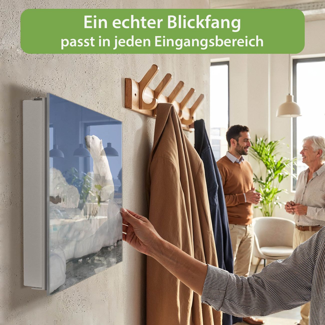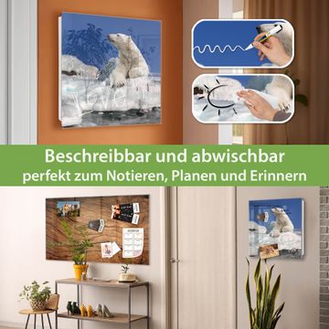 Bringe Ordnung und Eleganz in deinen Eingangsbereich mit dem banjado Schlüsselkasten Motiv Motiv Ruhender Eisbär. Die moderne Schlüsselbox kombiniert funktionales Design mit hochwertiger Verarbeitung und wird so zu einem echten Hingucker in Flur, Büro oder Ferienwohnung. ✅ Stilvolle Schlüsselaufbewahrung mit Glasfront im Motiv Motiv Ruhender Eisbär Der Design-Schlüsselkasten Motiv Motiv Ruhender Eisbär bietet Platz für bis zu 50 Schlüssel, die auf 5 stabilen Reihen mit je 10 Haken übersichtlich verstaut werden. Mit seinen kompakten Maßen von 30 x 30 x 5 cm passt die Schlüsselbox perfekt auch in kleinere Räume. Der weiß lackierte Stahlkorpus mit rechts angeschlagenem Türscharnier harmoniert mit der Glasfront und fügt sich nahtlos in jedes Wohnambiente ein. Ob als Schlüsselorganizer für Zuhause oder als praktische Lösung für Büros, Praxen und Gewerbe, der banjado Schlüsselkasten sorgt für Ordnung und Übersicht. Dank der magnetischen, mit Kreidestiften beschreibbaren Glasfront kannst du Notizen anheften oder Termine direkt auf der Oberfläche festhalten. Die Schlüsselbox Motiv Motiv Ruhender Eisbär zur Wandmontage wird inklusive Befestigungsmaterial geliefert und ist schnell angebracht. So hast du deine Schlüssel jederzeit griffbereit und zugleich stilvoll verstaut. Mit diesem banjado Schlüsselkasten Motiv Motiv Ruhender Eisbär kombinierst du praktische Aufbewahrung mit stilvollem Wohndesign. Ob privat oder geschäftlich, die Schlüsselbox sorgt für mehr Ordnung, Übersicht und ein wohnliches Ambiente.Vorteile im Überblick