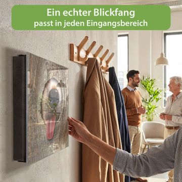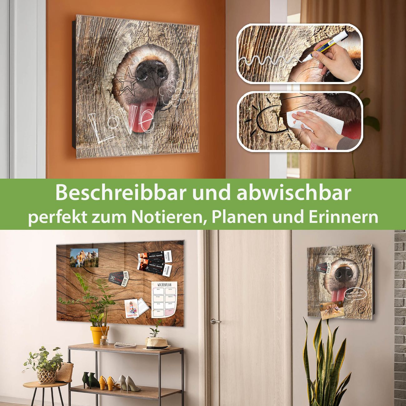 Bringe Ordnung und Eleganz in deinen Eingangsbereich mit dem banjado Schlüsselkasten Motiv Motiv Rumschnüffeln. Die moderne Schlüsselbox kombiniert funktionales Design mit hochwertiger Verarbeitung und wird so zu einem echten Hingucker in Flur, Büro oder Ferienwohnung. ✅ Stilvolle Schlüsselaufbewahrung mit Glasfront im Motiv Motiv Rumschnüffeln Der Design-Schlüsselkasten Motiv Motiv Rumschnüffeln bietet Platz für bis zu 50 Schlüssel, die auf 5 stabilen Reihen mit je 10 Haken übersichtlich verstaut werden. Mit seinen kompakten Maßen von 30 x 30 x 5 cm passt die Schlüsselbox perfekt auch in kleinere Räume. Der schwarz lackierte Stahlkorpus mit rechts angeschlagenem Türscharnier harmoniert mit der Glasfront und fügt sich nahtlos in jedes Wohnambiente ein. Ob als Schlüsselorganizer für Zuhause oder als praktische Lösung für Büros, Praxen und Gewerbe, der banjado Schlüsselkasten sorgt für Ordnung und Übersicht. Dank der magnetischen, mit Kreidestiften beschreibbaren Glasfront kannst du Notizen anheften oder Termine direkt auf der Oberfläche festhalten. Die Schlüsselbox Motiv Motiv Rumschnüffeln zur Wandmontage wird inklusive Befestigungsmaterial geliefert und ist schnell angebracht. So hast du deine Schlüssel jederzeit griffbereit und zugleich stilvoll verstaut. Mit diesem banjado Schlüsselkasten Motiv Motiv Rumschnüffeln kombinierst du praktische Aufbewahrung mit stilvollem Wohndesign. Ob privat oder geschäftlich, die Schlüsselbox sorgt für mehr Ordnung, Übersicht und ein wohnliches Ambiente.Vorteile im Überblick