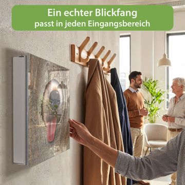 Bringe Ordnung und Eleganz in deinen Eingangsbereich mit dem banjado Schlüsselkasten Motiv Motiv Rumschnüffeln. Die moderne Schlüsselbox kombiniert funktionales Design mit hochwertiger Verarbeitung und wird so zu einem echten Hingucker in Flur, Büro oder Ferienwohnung. ✅ Stilvolle Schlüsselaufbewahrung mit Glasfront im Motiv Motiv Rumschnüffeln Der Design-Schlüsselkasten Motiv Motiv Rumschnüffeln bietet Platz für bis zu 50 Schlüssel, die auf 5 stabilen Reihen mit je 10 Haken übersichtlich verstaut werden. Mit seinen kompakten Maßen von 30 x 30 x 5 cm passt die Schlüsselbox perfekt auch in kleinere Räume. Der weiß lackierte Stahlkorpus mit rechts angeschlagenem Türscharnier harmoniert mit der Glasfront und fügt sich nahtlos in jedes Wohnambiente ein. Ob als Schlüsselorganizer für Zuhause oder als praktische Lösung für Büros, Praxen und Gewerbe, der banjado Schlüsselkasten sorgt für Ordnung und Übersicht. Dank der magnetischen, mit Kreidestiften beschreibbaren Glasfront kannst du Notizen anheften oder Termine direkt auf der Oberfläche festhalten. Die Schlüsselbox Motiv Motiv Rumschnüffeln zur Wandmontage wird inklusive Befestigungsmaterial geliefert und ist schnell angebracht. So hast du deine Schlüssel jederzeit griffbereit und zugleich stilvoll verstaut. Mit diesem banjado Schlüsselkasten Motiv Motiv Rumschnüffeln kombinierst du praktische Aufbewahrung mit stilvollem Wohndesign. Ob privat oder geschäftlich, die Schlüsselbox sorgt für mehr Ordnung, Übersicht und ein wohnliches Ambiente.Vorteile im Überblick