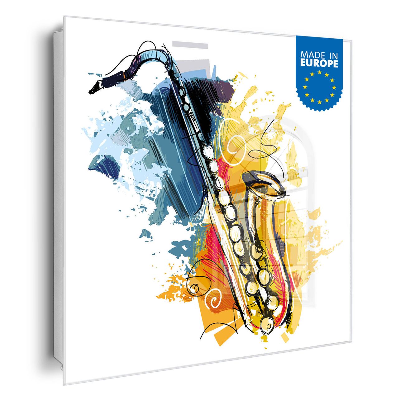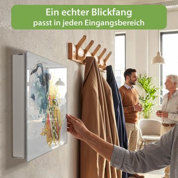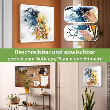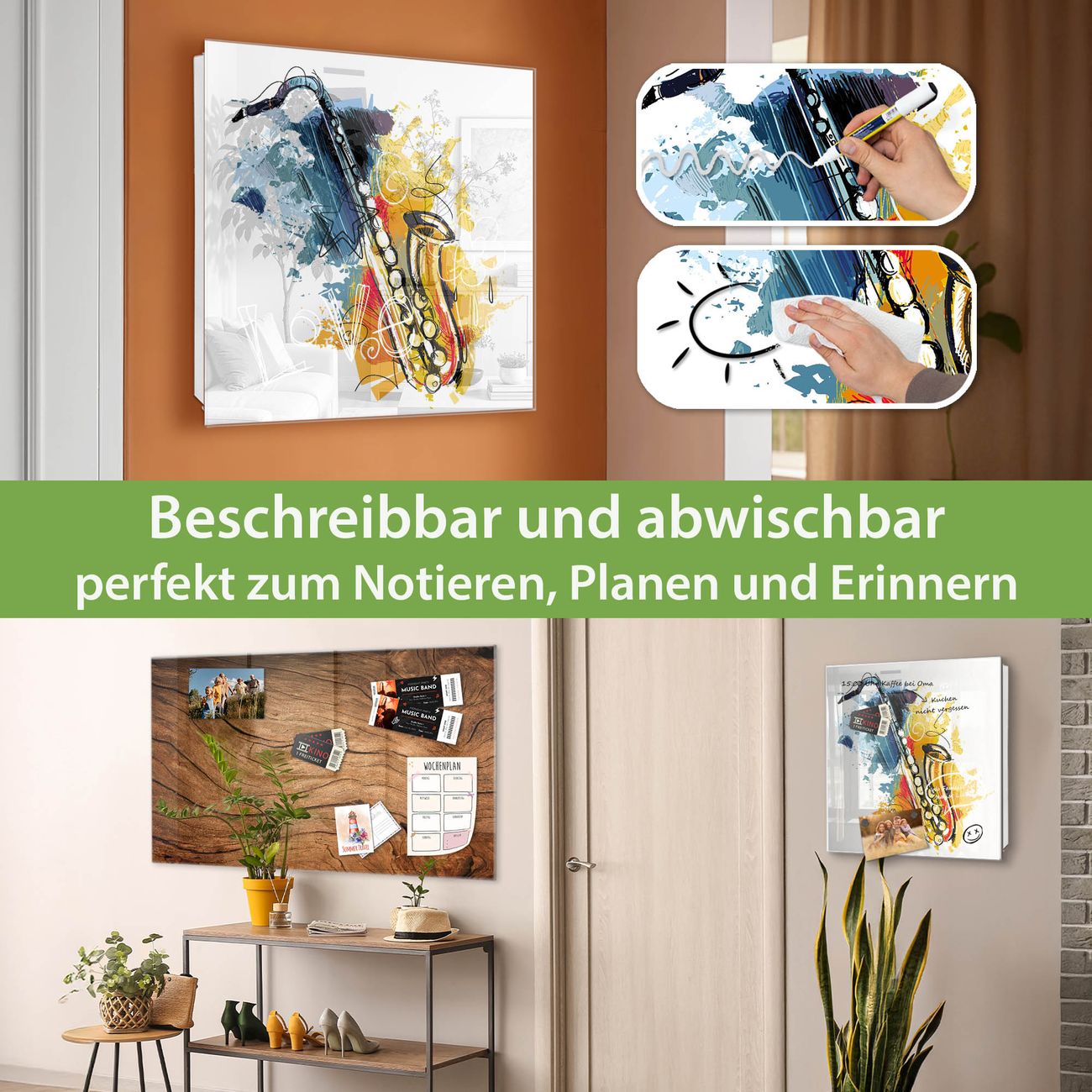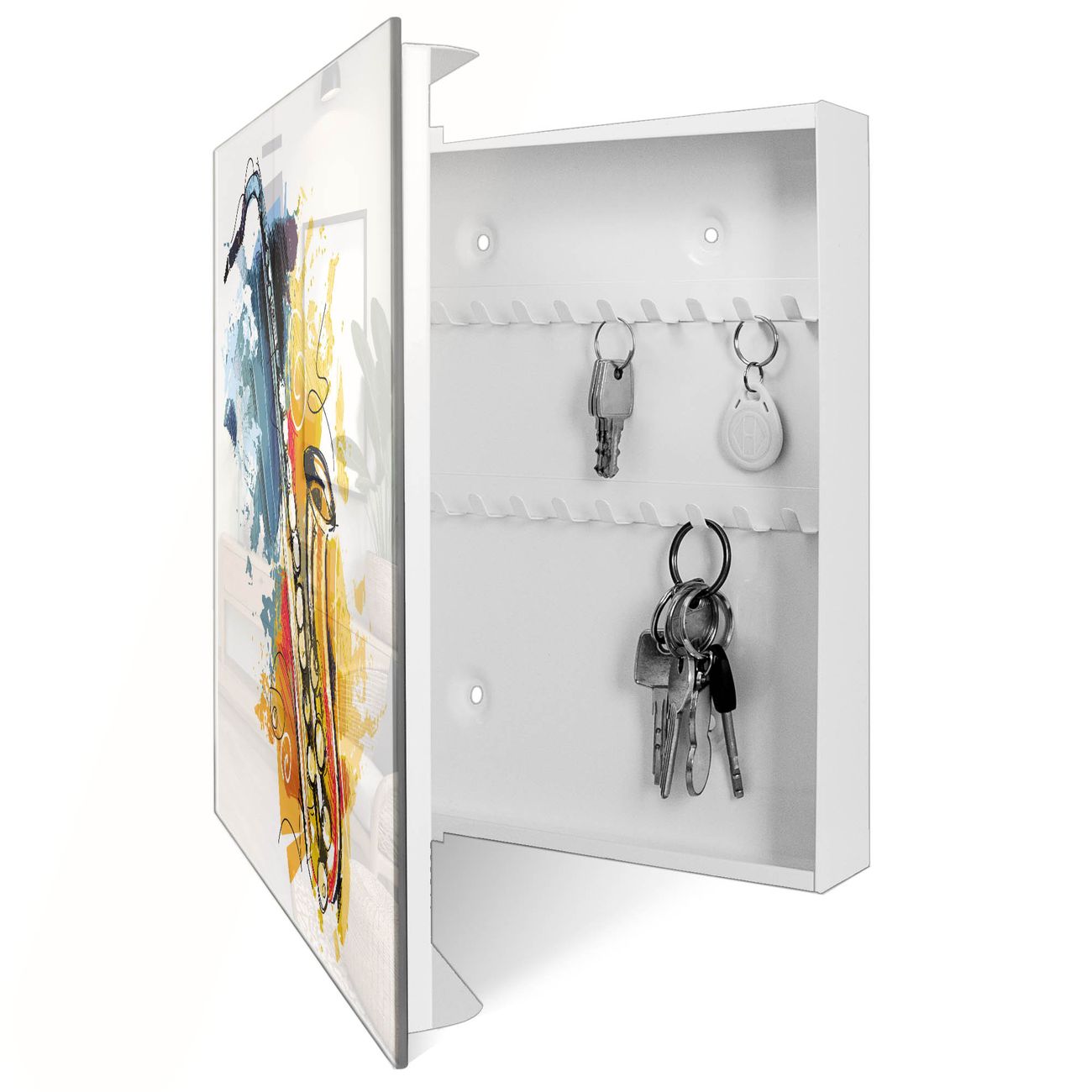 Bringe Ordnung und Eleganz in deinen Eingangsbereich mit dem banjado Schlüsselkasten Motiv Motiv Saxophon. Die moderne Schlüsselbox kombiniert funktionales Design mit hochwertiger Verarbeitung und wird so zu einem echten Hingucker in Flur, Büro oder Ferienwohnung. ✅ Stilvolle Schlüsselaufbewahrung mit Glasfront im Motiv Motiv Saxophon Der Design-Schlüsselkasten Motiv Motiv Saxophon bietet Platz für bis zu 50 Schlüssel, die auf 5 stabilen Reihen mit je 10 Haken übersichtlich verstaut werden. Mit seinen kompakten Maßen von 30 x 30 x 5 cm passt die Schlüsselbox perfekt auch in kleinere Räume. Der weiß lackierte Stahlkorpus mit rechts angeschlagenem Türscharnier harmoniert mit der Glasfront und fügt sich nahtlos in jedes Wohnambiente ein. Ob als Schlüsselorganizer für Zuhause oder als praktische Lösung für Büros, Praxen und Gewerbe, der banjado Schlüsselkasten sorgt für Ordnung und Übersicht. Dank der magnetischen, mit Kreidestiften beschreibbaren Glasfront kannst du Notizen anheften oder Termine direkt auf der Oberfläche festhalten. Die Schlüsselbox Motiv Motiv Saxophon zur Wandmontage wird inklusive Befestigungsmaterial geliefert und ist schnell angebracht. So hast du deine Schlüssel jederzeit griffbereit und zugleich stilvoll verstaut. Mit diesem banjado Schlüsselkasten Motiv Motiv Saxophon kombinierst du praktische Aufbewahrung mit stilvollem Wohndesign. Ob privat oder geschäftlich, die Schlüsselbox sorgt für mehr Ordnung, Übersicht und ein wohnliches Ambiente.Vorteile im Überblick