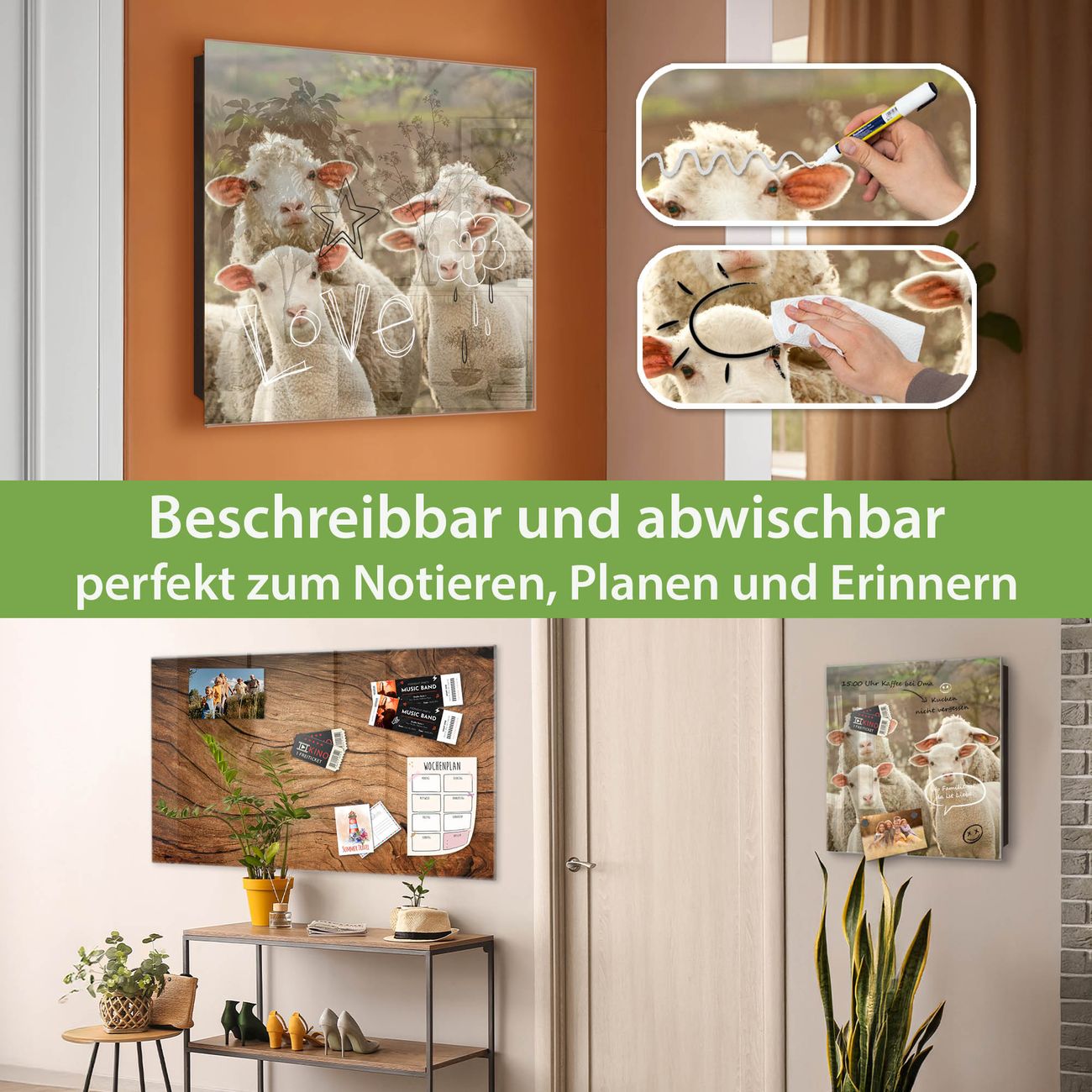 Bringe Ordnung und Eleganz in deinen Eingangsbereich mit dem banjado Schlüsselkasten Motiv Motiv Schaffamilie. Die moderne Schlüsselbox kombiniert funktionales Design mit hochwertiger Verarbeitung und wird so zu einem echten Hingucker in Flur, Büro oder Ferienwohnung. ✅ Stilvolle Schlüsselaufbewahrung mit Glasfront im Motiv Motiv Schaffamilie Der Design-Schlüsselkasten Motiv Motiv Schaffamilie bietet Platz für bis zu 50 Schlüssel, die auf 5 stabilen Reihen mit je 10 Haken übersichtlich verstaut werden. Mit seinen kompakten Maßen von 30 x 30 x 5 cm passt die Schlüsselbox perfekt auch in kleinere Räume. Der schwarz lackierte Stahlkorpus mit rechts angeschlagenem Türscharnier harmoniert mit der Glasfront und fügt sich nahtlos in jedes Wohnambiente ein. Ob als Schlüsselorganizer für Zuhause oder als praktische Lösung für Büros, Praxen und Gewerbe, der banjado Schlüsselkasten sorgt für Ordnung und Übersicht. Dank der magnetischen, mit Kreidestiften beschreibbaren Glasfront kannst du Notizen anheften oder Termine direkt auf der Oberfläche festhalten. Die Schlüsselbox Motiv Motiv Schaffamilie zur Wandmontage wird inklusive Befestigungsmaterial geliefert und ist schnell angebracht. So hast du deine Schlüssel jederzeit griffbereit und zugleich stilvoll verstaut. Mit diesem banjado Schlüsselkasten Motiv Motiv Schaffamilie kombinierst du praktische Aufbewahrung mit stilvollem Wohndesign. Ob privat oder geschäftlich, die Schlüsselbox sorgt für mehr Ordnung, Übersicht und ein wohnliches Ambiente.Vorteile im Überblick