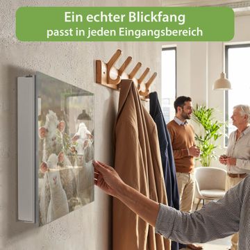 Bringe Ordnung und Eleganz in deinen Eingangsbereich mit dem banjado Schlüsselkasten Motiv Motiv Schaffamilie. Die moderne Schlüsselbox kombiniert funktionales Design mit hochwertiger Verarbeitung und wird so zu einem echten Hingucker in Flur, Büro oder Ferienwohnung. ✅ Stilvolle Schlüsselaufbewahrung mit Glasfront im Motiv Motiv Schaffamilie Der Design-Schlüsselkasten Motiv Motiv Schaffamilie bietet Platz für bis zu 50 Schlüssel, die auf 5 stabilen Reihen mit je 10 Haken übersichtlich verstaut werden. Mit seinen kompakten Maßen von 30 x 30 x 5 cm passt die Schlüsselbox perfekt auch in kleinere Räume. Der weiß lackierte Stahlkorpus mit rechts angeschlagenem Türscharnier harmoniert mit der Glasfront und fügt sich nahtlos in jedes Wohnambiente ein. Ob als Schlüsselorganizer für Zuhause oder als praktische Lösung für Büros, Praxen und Gewerbe, der banjado Schlüsselkasten sorgt für Ordnung und Übersicht. Dank der magnetischen, mit Kreidestiften beschreibbaren Glasfront kannst du Notizen anheften oder Termine direkt auf der Oberfläche festhalten. Die Schlüsselbox Motiv Motiv Schaffamilie zur Wandmontage wird inklusive Befestigungsmaterial geliefert und ist schnell angebracht. So hast du deine Schlüssel jederzeit griffbereit und zugleich stilvoll verstaut. Mit diesem banjado Schlüsselkasten Motiv Motiv Schaffamilie kombinierst du praktische Aufbewahrung mit stilvollem Wohndesign. Ob privat oder geschäftlich, die Schlüsselbox sorgt für mehr Ordnung, Übersicht und ein wohnliches Ambiente.Vorteile im Überblick