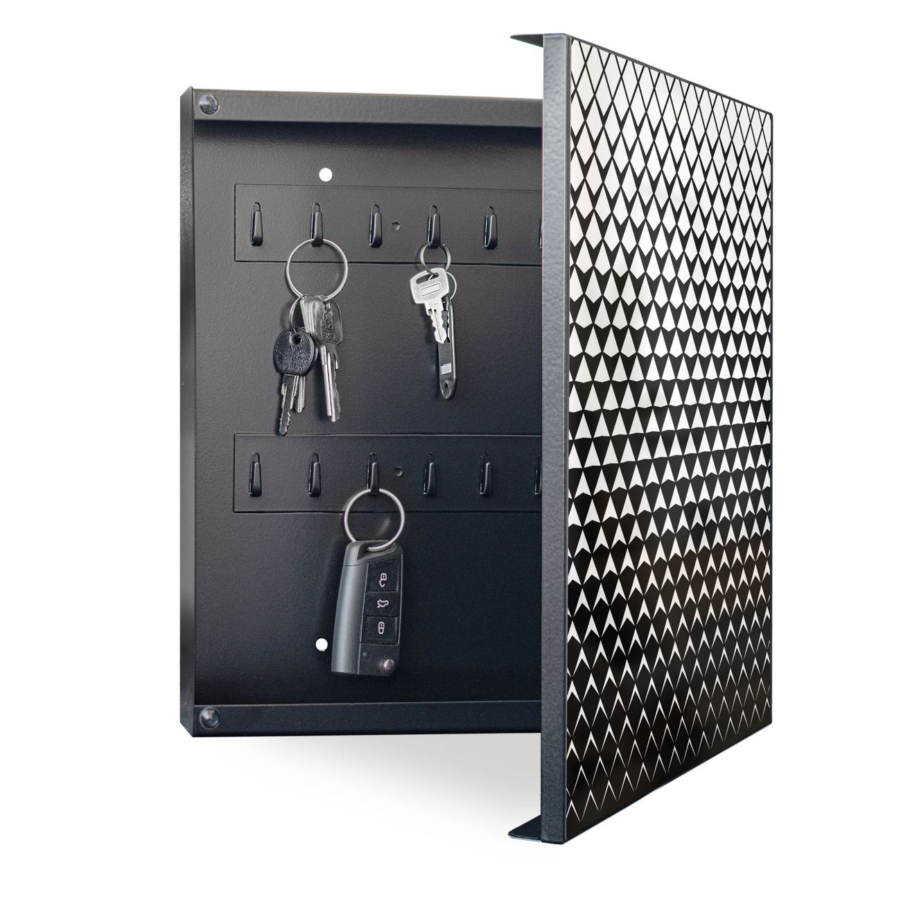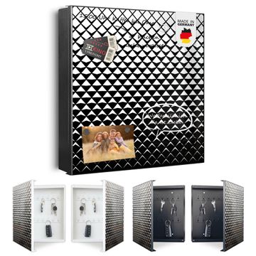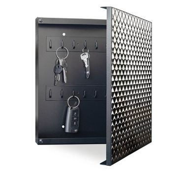 Bringe Ordnung und Eleganz in deinen Eingangsbereich mit dem banjado Schlüsselkasten Motiv Motiv Schattierung. Die moderne Schlüsselbox kombiniert funktionales Design mit hochwertiger Verarbeitung und wird so zu einem echten Hingucker in Flur, Büro oder Ferienwohnung. ✅ Stilvolle Schlüsselaufbewahrung mit Motiv Motiv Schattierung Der Design-Schlüsselkasten Motiv Motiv Schattierung bietet Platz für bis zu 32 Schlüssel, die auf 4 stabilen Reihen mit je 8 Haken übersichtlich verstaut werden. Mit seinen kompakten Maßen von 30 x 30 x 5 cm passt die Schlüsselbox perfekt auch in kleinere Räume. Der schwarz lackierte Stahlkorpus mit rechts angeschlagenem Türscharnier harmoniert mit gedruckten Folie auf der Front und fügt sich nahtlos in jedes Wohnambiente ein. Ob als Schlüsselorganizer für Zuhause oder als praktische Lösung für Büros, Praxen und Gewerbe, der banjado Schlüsselkasten sorgt für Ordnung und Übersicht. Dank der magnetischen, mit Kreidestiften beschreibbaren Folie auf der Front kannst du Notizen anheften oder Termine direkt auf der Oberfläche festhalten. Die Schlüsselbox Motiv Motiv Schattierung zur Wandmontage wird inklusive Befestigungsmaterial geliefert und ist schnell angebracht. So hast du deine Schlüssel jederzeit griffbereit und zugleich stilvoll verstaut. Mit diesem banjado Schlüsselkasten Motiv Motiv Schattierung kombinierst du praktische Aufbewahrung mit stilvollem Wohndesign. Ob privat oder geschäftlich, die Schlüsselbox sorgt für mehr Ordnung, Übersicht und ein wohnliches Ambiente.Vorteile im Überblick