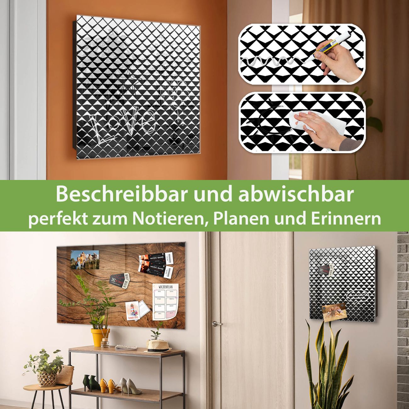 ✅ Magnetisch und mit Kreidestift beschreibbar, gehärtetes Glas, links angeschlagene TürOrdnung und Design in einem