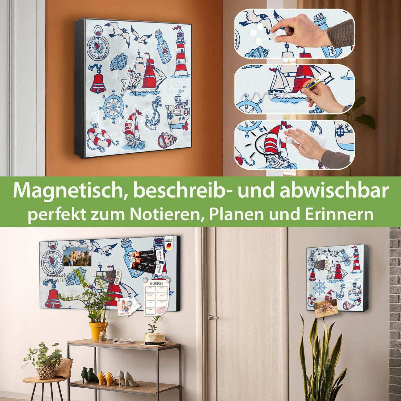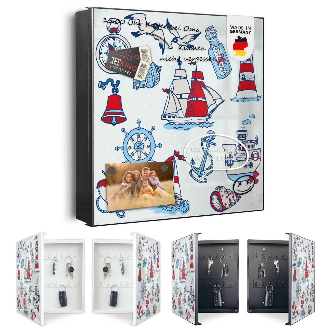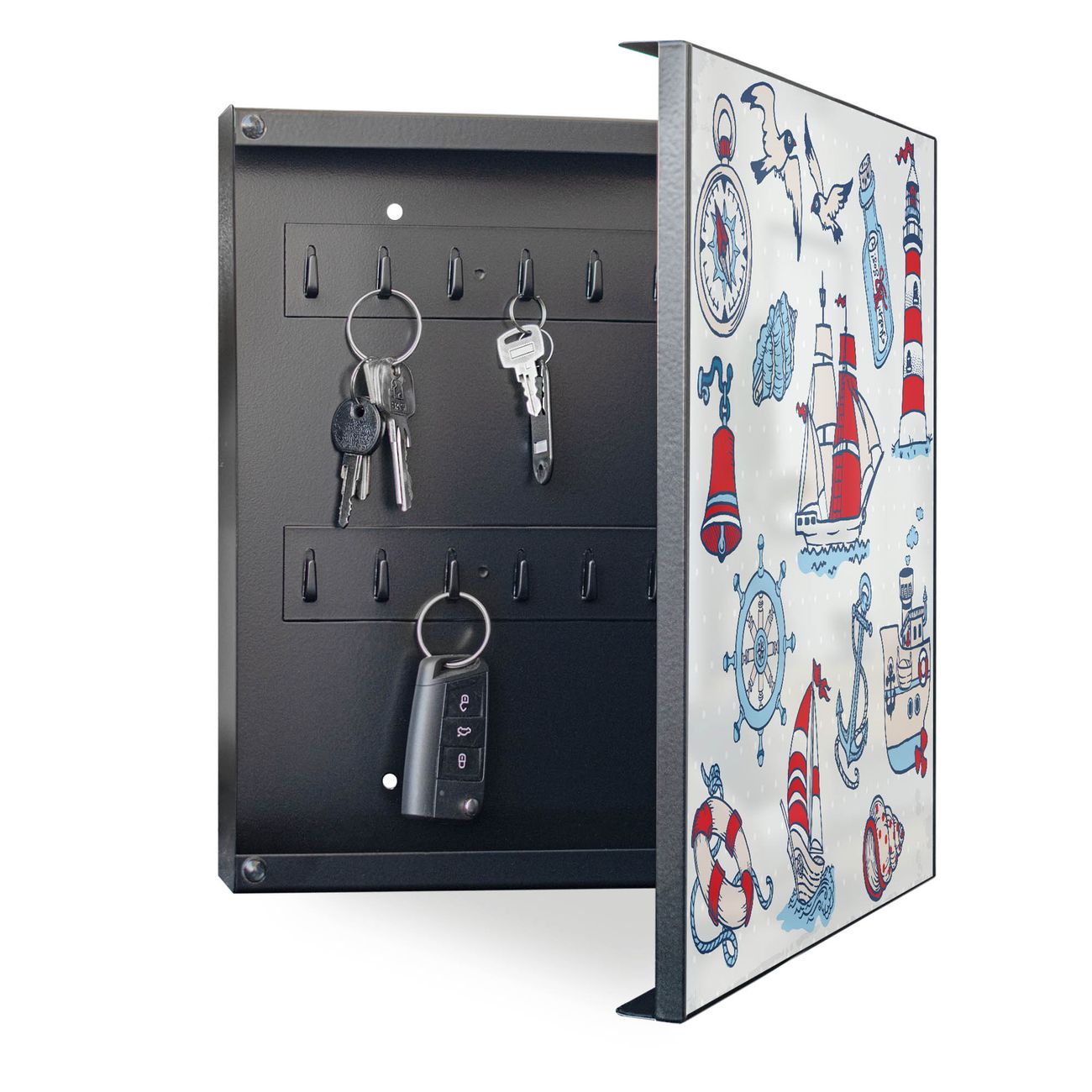 Bringe Ordnung und Eleganz in deinen Eingangsbereich mit dem banjado Schlüsselkasten Motiv Motiv Schiff Ahoj. Die moderne Schlüsselbox kombiniert funktionales Design mit hochwertiger Verarbeitung und wird so zu einem echten Hingucker in Flur, Büro oder Ferienwohnung. ✅ Stilvolle Schlüsselaufbewahrung mit Motiv Motiv Schiff Ahoj Der Design-Schlüsselkasten Motiv Motiv Schiff Ahoj bietet Platz für bis zu 32 Schlüssel, die auf 4 stabilen Reihen mit je 8 Haken übersichtlich verstaut werden. Mit seinen kompakten Maßen von 30 x 30 x 5 cm passt die Schlüsselbox perfekt auch in kleinere Räume. Der schwarz lackierte Stahlkorpus mit rechts angeschlagenem Türscharnier harmoniert mit gedruckten Folie auf der Front und fügt sich nahtlos in jedes Wohnambiente ein. Ob als Schlüsselorganizer für Zuhause oder als praktische Lösung für Büros, Praxen und Gewerbe, der banjado Schlüsselkasten sorgt für Ordnung und Übersicht. Dank der magnetischen, mit Kreidestiften beschreibbaren Folie auf der Front kannst du Notizen anheften oder Termine direkt auf der Oberfläche festhalten. Die Schlüsselbox Motiv Motiv Schiff Ahoj zur Wandmontage wird inklusive Befestigungsmaterial geliefert und ist schnell angebracht. So hast du deine Schlüssel jederzeit griffbereit und zugleich stilvoll verstaut. Mit diesem banjado Schlüsselkasten Motiv Motiv Schiff Ahoj kombinierst du praktische Aufbewahrung mit stilvollem Wohndesign. Ob privat oder geschäftlich, die Schlüsselbox sorgt für mehr Ordnung, Übersicht und ein wohnliches Ambiente.Vorteile im Überblick