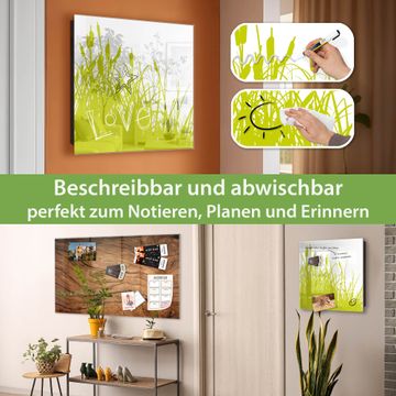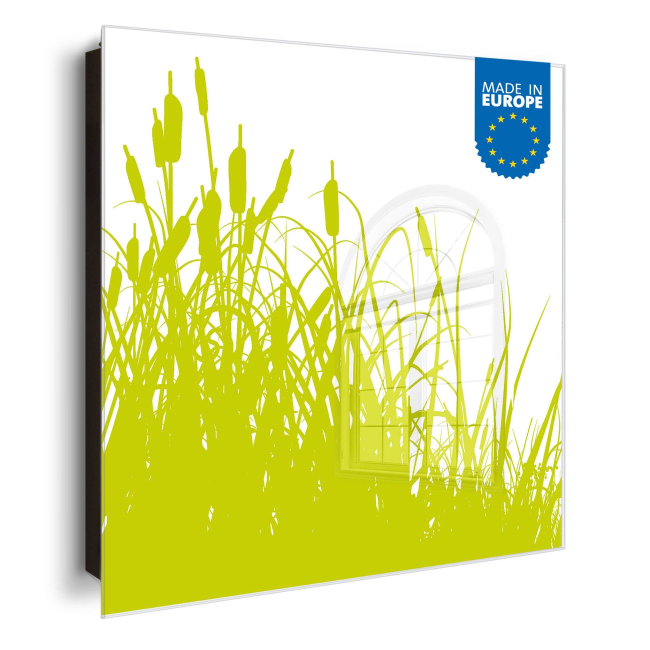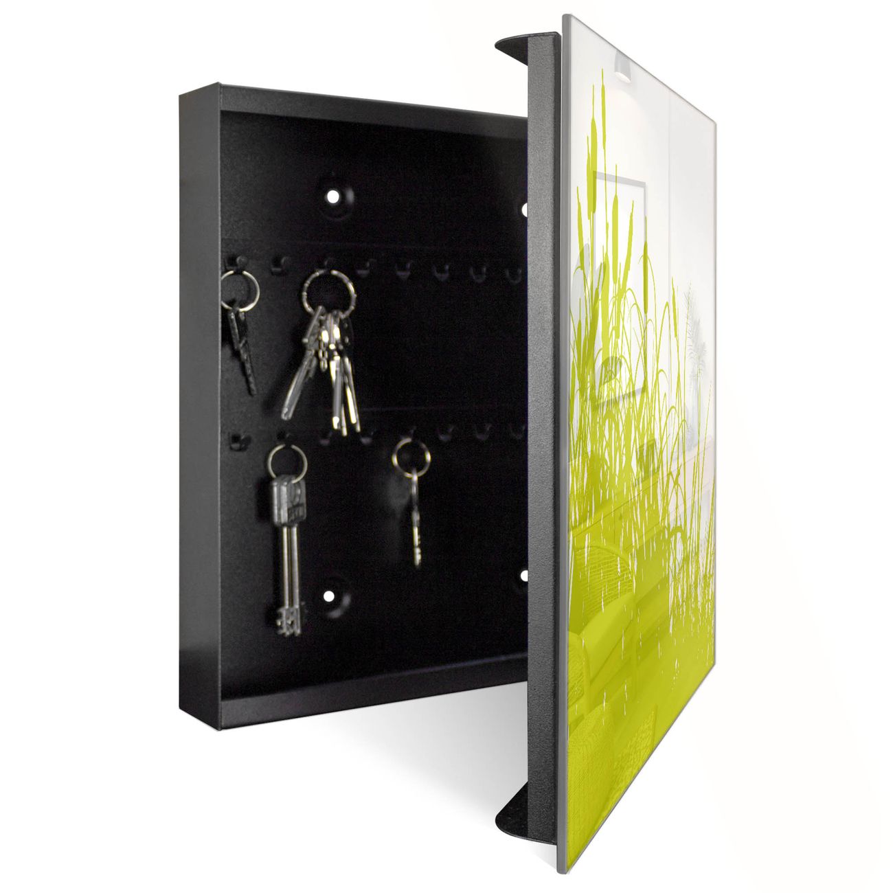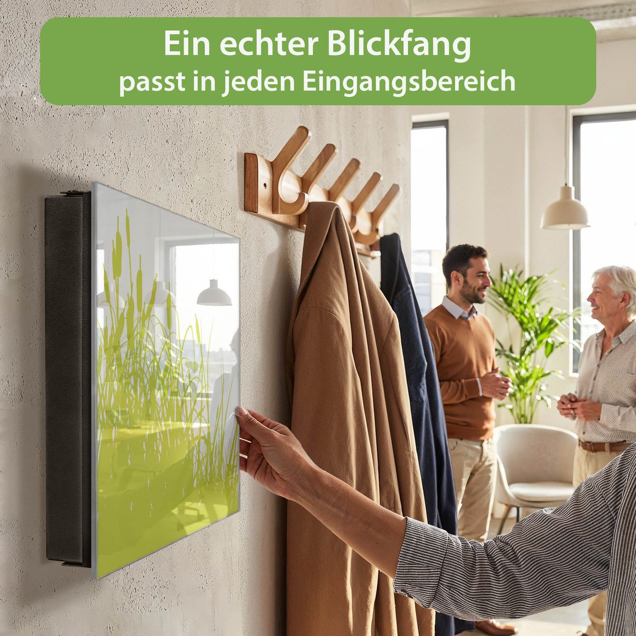 Bringe Ordnung und Eleganz in deinen Eingangsbereich mit dem banjado Schlüsselkasten Motiv Motiv Schilf. Die moderne Schlüsselbox kombiniert funktionales Design mit hochwertiger Verarbeitung und wird so zu einem echten Hingucker in Flur, Büro oder Ferienwohnung. ✅ Stilvolle Schlüsselaufbewahrung mit Glasfront im Motiv Motiv Schilf Der Design-Schlüsselkasten Motiv Motiv Schilf bietet Platz für bis zu 50 Schlüssel, die auf 5 stabilen Reihen mit je 10 Haken übersichtlich verstaut werden. Mit seinen kompakten Maßen von 30 x 30 x 5 cm passt die Schlüsselbox perfekt auch in kleinere Räume. Der schwarz lackierte Stahlkorpus mit rechts angeschlagenem Türscharnier harmoniert mit der Glasfront und fügt sich nahtlos in jedes Wohnambiente ein. Ob als Schlüsselorganizer für Zuhause oder als praktische Lösung für Büros, Praxen und Gewerbe, der banjado Schlüsselkasten sorgt für Ordnung und Übersicht. Dank der magnetischen, mit Kreidestiften beschreibbaren Glasfront kannst du Notizen anheften oder Termine direkt auf der Oberfläche festhalten. Die Schlüsselbox Motiv Motiv Schilf zur Wandmontage wird inklusive Befestigungsmaterial geliefert und ist schnell angebracht. So hast du deine Schlüssel jederzeit griffbereit und zugleich stilvoll verstaut. Mit diesem banjado Schlüsselkasten Motiv Motiv Schilf kombinierst du praktische Aufbewahrung mit stilvollem Wohndesign. Ob privat oder geschäftlich, die Schlüsselbox sorgt für mehr Ordnung, Übersicht und ein wohnliches Ambiente.Vorteile im Überblick