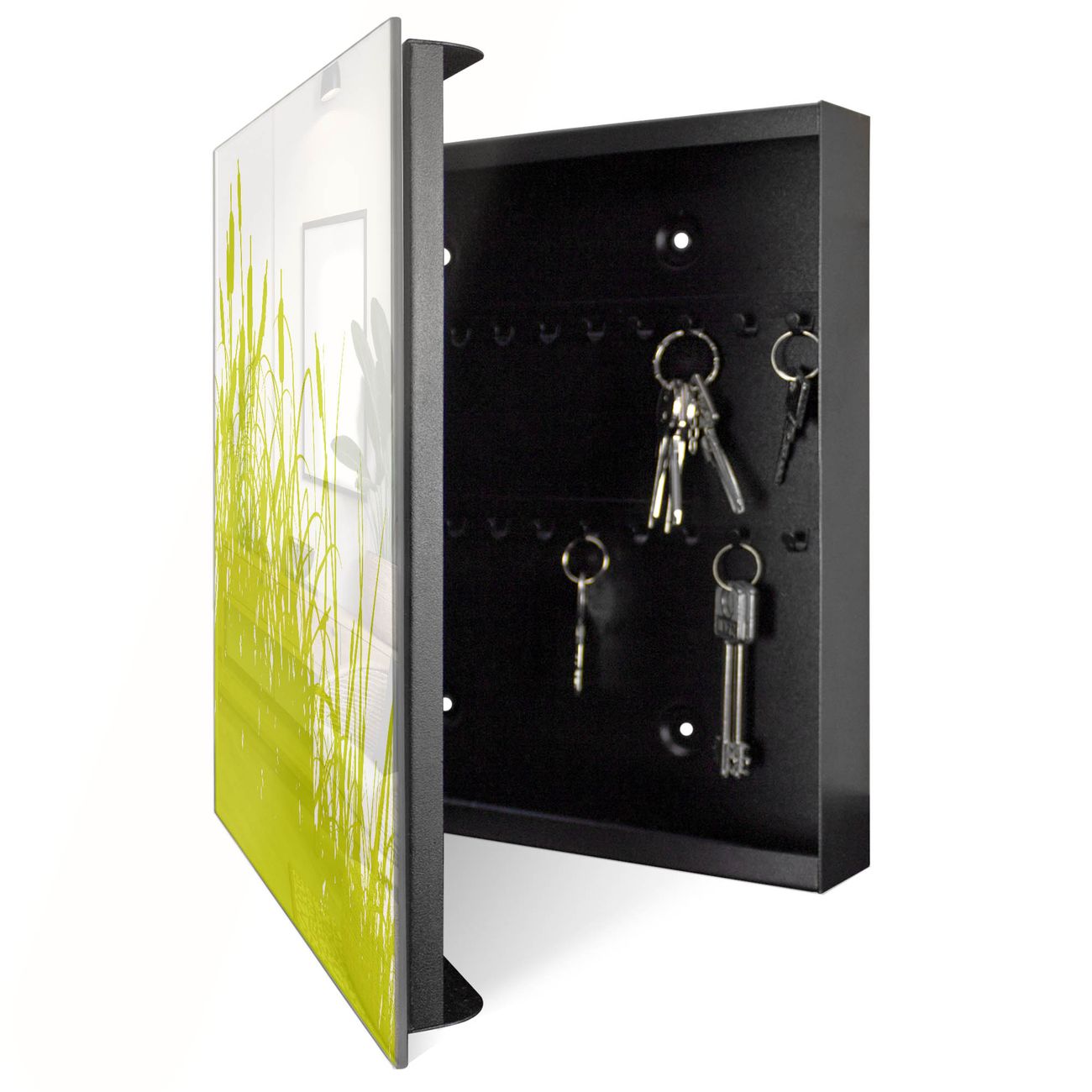 Bringe Ordnung und Eleganz in deinen Eingangsbereich mit dem banjado Schlüsselkasten Motiv Motiv Schilf. Die moderne Schlüsselbox kombiniert funktionales Design mit hochwertiger Verarbeitung und wird so zu einem echten Hingucker in Flur, Büro oder Ferienwohnung. ✅ Stilvolle Schlüsselaufbewahrung mit Glasfront im Motiv Motiv Schilf Der Design-Schlüsselkasten Motiv Motiv Schilf bietet Platz für bis zu 50 Schlüssel, die auf 5 stabilen Reihen mit je 10 Haken übersichtlich verstaut werden. Mit seinen kompakten Maßen von 30 x 30 x 5 cm passt die Schlüsselbox perfekt auch in kleinere Räume. Der schwarz lackierte Stahlkorpus mit rechts angeschlagenem Türscharnier harmoniert mit der Glasfront und fügt sich nahtlos in jedes Wohnambiente ein. Ob als Schlüsselorganizer für Zuhause oder als praktische Lösung für Büros, Praxen und Gewerbe, der banjado Schlüsselkasten sorgt für Ordnung und Übersicht. Dank der magnetischen, mit Kreidestiften beschreibbaren Glasfront kannst du Notizen anheften oder Termine direkt auf der Oberfläche festhalten. Die Schlüsselbox Motiv Motiv Schilf zur Wandmontage wird inklusive Befestigungsmaterial geliefert und ist schnell angebracht. So hast du deine Schlüssel jederzeit griffbereit und zugleich stilvoll verstaut. Mit diesem banjado Schlüsselkasten Motiv Motiv Schilf kombinierst du praktische Aufbewahrung mit stilvollem Wohndesign. Ob privat oder geschäftlich, die Schlüsselbox sorgt für mehr Ordnung, Übersicht und ein wohnliches Ambiente.Vorteile im Überblick