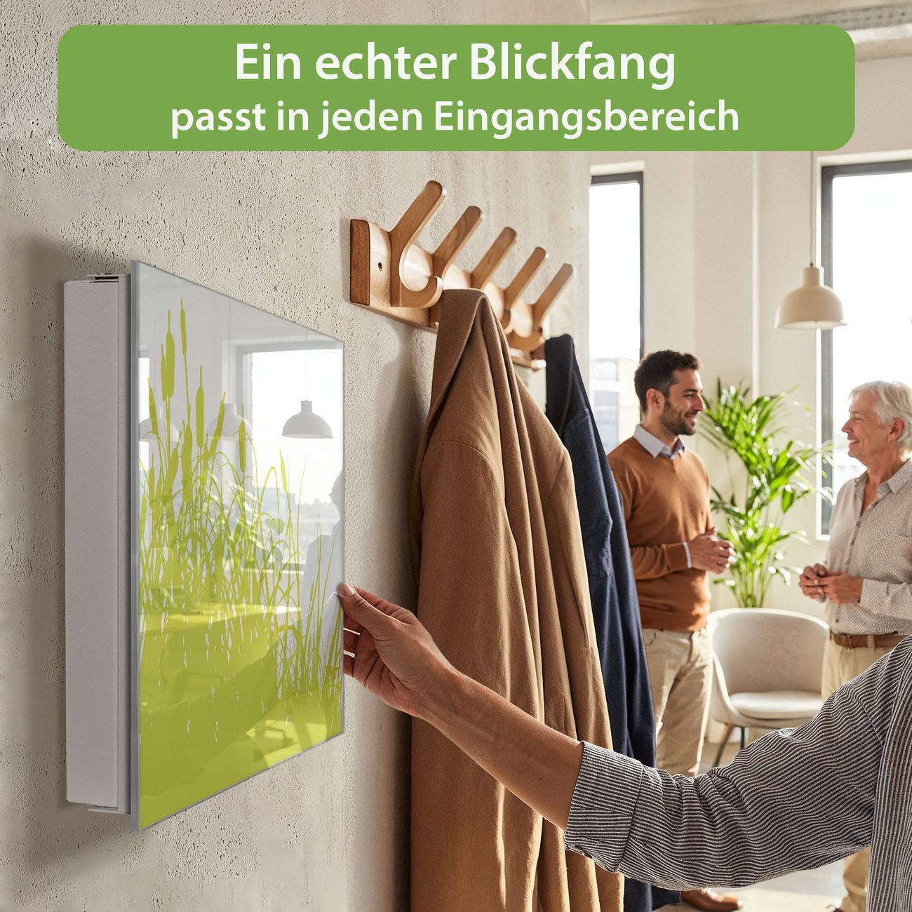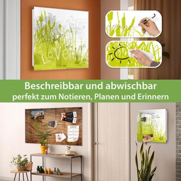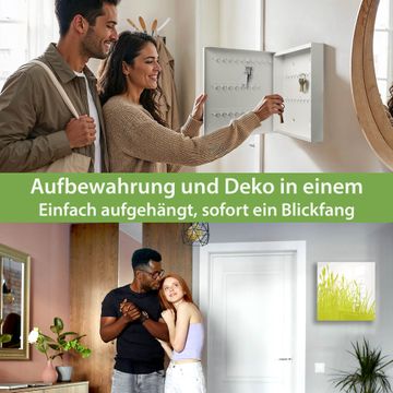 Bringe Ordnung und Eleganz in deinen Eingangsbereich mit dem banjado Schlüsselkasten Motiv Motiv Schilf. Die moderne Schlüsselbox kombiniert funktionales Design mit hochwertiger Verarbeitung und wird so zu einem echten Hingucker in Flur, Büro oder Ferienwohnung. ✅ Stilvolle Schlüsselaufbewahrung mit Glasfront im Motiv Motiv Schilf Der Design-Schlüsselkasten Motiv Motiv Schilf bietet Platz für bis zu 50 Schlüssel, die auf 5 stabilen Reihen mit je 10 Haken übersichtlich verstaut werden. Mit seinen kompakten Maßen von 30 x 30 x 5 cm passt die Schlüsselbox perfekt auch in kleinere Räume. Der weiß lackierte Stahlkorpus mit rechts angeschlagenem Türscharnier harmoniert mit der Glasfront und fügt sich nahtlos in jedes Wohnambiente ein. Ob als Schlüsselorganizer für Zuhause oder als praktische Lösung für Büros, Praxen und Gewerbe, der banjado Schlüsselkasten sorgt für Ordnung und Übersicht. Dank der magnetischen, mit Kreidestiften beschreibbaren Glasfront kannst du Notizen anheften oder Termine direkt auf der Oberfläche festhalten. Die Schlüsselbox Motiv Motiv Schilf zur Wandmontage wird inklusive Befestigungsmaterial geliefert und ist schnell angebracht. So hast du deine Schlüssel jederzeit griffbereit und zugleich stilvoll verstaut. Mit diesem banjado Schlüsselkasten Motiv Motiv Schilf kombinierst du praktische Aufbewahrung mit stilvollem Wohndesign. Ob privat oder geschäftlich, die Schlüsselbox sorgt für mehr Ordnung, Übersicht und ein wohnliches Ambiente.Vorteile im Überblick