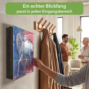 Bringe Ordnung und Eleganz in deinen Eingangsbereich mit dem banjado Schlüsselkasten Motiv Motiv Schimmel. Die moderne Schlüsselbox kombiniert funktionales Design mit hochwertiger Verarbeitung und wird so zu einem echten Hingucker in Flur, Büro oder Ferienwohnung. ✅ Stilvolle Schlüsselaufbewahrung mit Glasfront im Motiv Motiv Schimmel Der Design-Schlüsselkasten Motiv Motiv Schimmel bietet Platz für bis zu 50 Schlüssel, die auf 5 stabilen Reihen mit je 10 Haken übersichtlich verstaut werden. Mit seinen kompakten Maßen von 30 x 30 x 5 cm passt die Schlüsselbox perfekt auch in kleinere Räume. Der schwarz lackierte Stahlkorpus mit rechts angeschlagenem Türscharnier harmoniert mit der Glasfront und fügt sich nahtlos in jedes Wohnambiente ein. Ob als Schlüsselorganizer für Zuhause oder als praktische Lösung für Büros, Praxen und Gewerbe, der banjado Schlüsselkasten sorgt für Ordnung und Übersicht. Dank der magnetischen, mit Kreidestiften beschreibbaren Glasfront kannst du Notizen anheften oder Termine direkt auf der Oberfläche festhalten. Die Schlüsselbox Motiv Motiv Schimmel zur Wandmontage wird inklusive Befestigungsmaterial geliefert und ist schnell angebracht. So hast du deine Schlüssel jederzeit griffbereit und zugleich stilvoll verstaut. Mit diesem banjado Schlüsselkasten Motiv Motiv Schimmel kombinierst du praktische Aufbewahrung mit stilvollem Wohndesign. Ob privat oder geschäftlich, die Schlüsselbox sorgt für mehr Ordnung, Übersicht und ein wohnliches Ambiente.Vorteile im Überblick