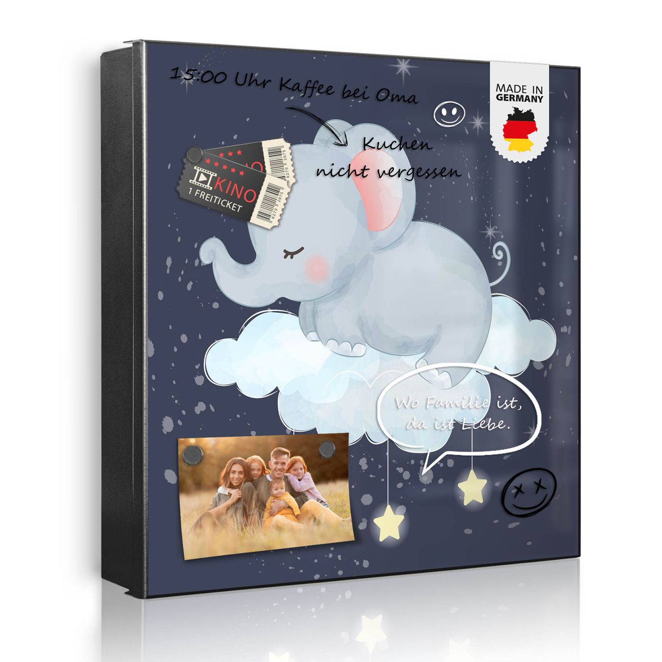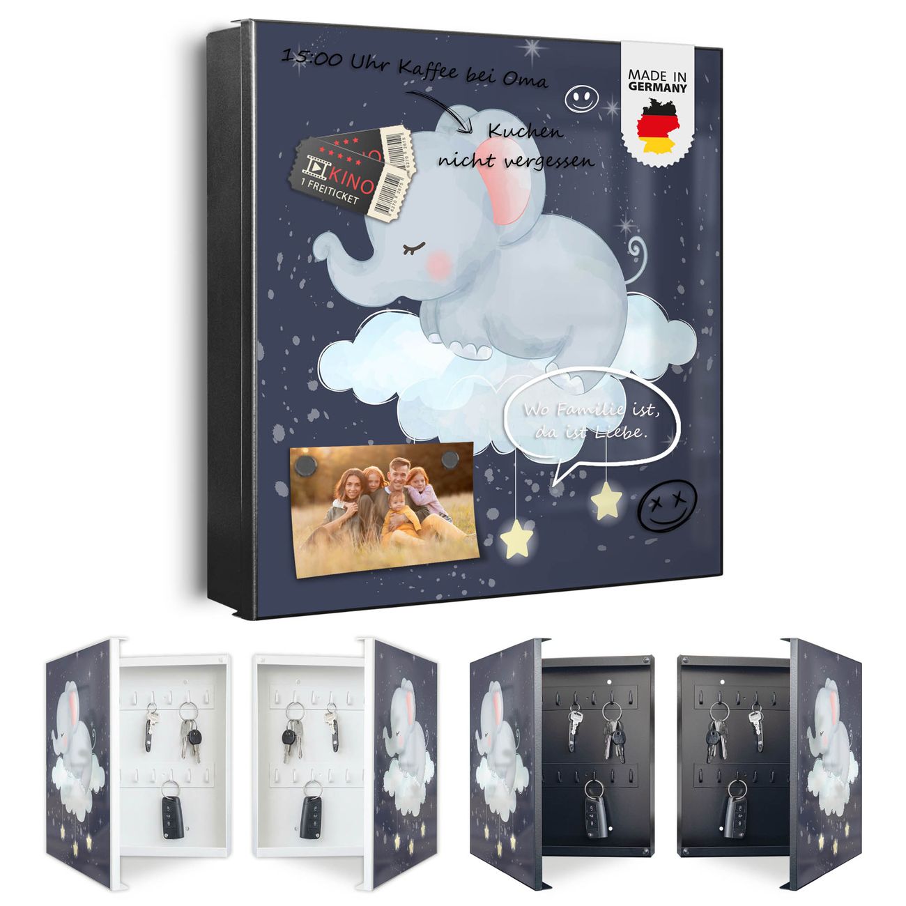 Bringe Ordnung und Eleganz in deinen Eingangsbereich mit dem banjado Schlüsselkasten Motiv Motiv schlafender Elefant. Die moderne Schlüsselbox kombiniert funktionales Design mit hochwertiger Verarbeitung und wird so zu einem echten Hingucker in Flur, Büro oder Ferienwohnung. ✅ Stilvolle Schlüsselaufbewahrung mit Motiv Motiv schlafender Elefant Der Design-Schlüsselkasten Motiv Motiv schlafender Elefant bietet Platz für bis zu 32 Schlüssel, die auf 4 stabilen Reihen mit je 8 Haken übersichtlich verstaut werden. Mit seinen kompakten Maßen von 30 x 30 x 5 cm passt die Schlüsselbox perfekt auch in kleinere Räume. Der schwarz lackierte Stahlkorpus mit rechts angeschlagenem Türscharnier harmoniert mit gedruckten Folie auf der Front und fügt sich nahtlos in jedes Wohnambiente ein. Ob als Schlüsselorganizer für Zuhause oder als praktische Lösung für Büros, Praxen und Gewerbe, der banjado Schlüsselkasten sorgt für Ordnung und Übersicht. Dank der magnetischen, mit Kreidestiften beschreibbaren Folie auf der Front kannst du Notizen anheften oder Termine direkt auf der Oberfläche festhalten. Die Schlüsselbox Motiv Motiv schlafender Elefant zur Wandmontage wird inklusive Befestigungsmaterial geliefert und ist schnell angebracht. So hast du deine Schlüssel jederzeit griffbereit und zugleich stilvoll verstaut. Mit diesem banjado Schlüsselkasten Motiv Motiv schlafender Elefant kombinierst du praktische Aufbewahrung mit stilvollem Wohndesign. Ob privat oder geschäftlich, die Schlüsselbox sorgt für mehr Ordnung, Übersicht und ein wohnliches Ambiente.Vorteile im Überblick