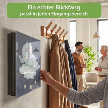 Bringe Ordnung und Eleganz in deinen Eingangsbereich mit dem banjado Schlüsselkasten Motiv Motiv schlafender Elefant. Die moderne Schlüsselbox kombiniert funktionales Design mit hochwertiger Verarbeitung und wird so zu einem echten Hingucker in Flur, Büro oder Ferienwohnung. ✅ Stilvolle Schlüsselaufbewahrung mit Glasfront im Motiv Motiv schlafender Elefant Der Design-Schlüsselkasten Motiv Motiv schlafender Elefant bietet Platz für bis zu 50 Schlüssel, die auf 5 stabilen Reihen mit je 10 Haken übersichtlich verstaut werden. Mit seinen kompakten Maßen von 30 x 30 x 5 cm passt die Schlüsselbox perfekt auch in kleinere Räume. Der schwarz lackierte Stahlkorpus mit rechts angeschlagenem Türscharnier harmoniert mit der Glasfront und fügt sich nahtlos in jedes Wohnambiente ein. Ob als Schlüsselorganizer für Zuhause oder als praktische Lösung für Büros, Praxen und Gewerbe, der banjado Schlüsselkasten sorgt für Ordnung und Übersicht. Dank der magnetischen, mit Kreidestiften beschreibbaren Glasfront kannst du Notizen anheften oder Termine direkt auf der Oberfläche festhalten. Die Schlüsselbox Motiv Motiv schlafender Elefant zur Wandmontage wird inklusive Befestigungsmaterial geliefert und ist schnell angebracht. So hast du deine Schlüssel jederzeit griffbereit und zugleich stilvoll verstaut. Mit diesem banjado Schlüsselkasten Motiv Motiv schlafender Elefant kombinierst du praktische Aufbewahrung mit stilvollem Wohndesign. Ob privat oder geschäftlich, die Schlüsselbox sorgt für mehr Ordnung, Übersicht und ein wohnliches Ambiente.Vorteile im Überblick