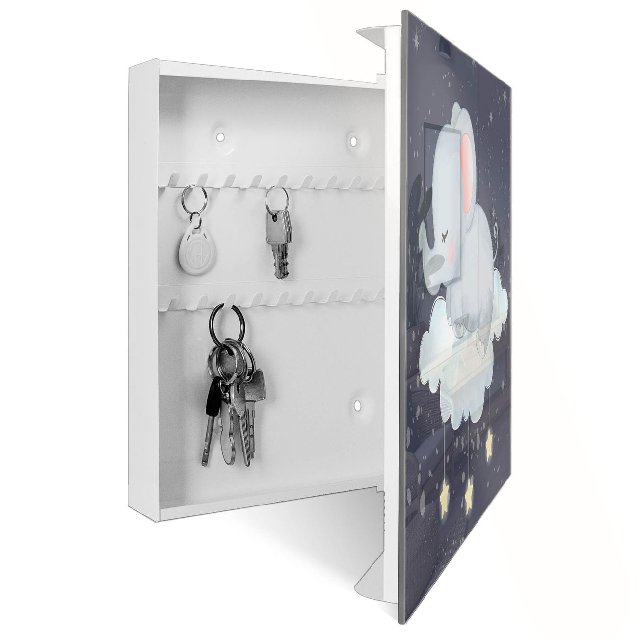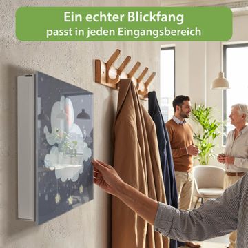 Bringe Ordnung und Eleganz in deinen Eingangsbereich mit dem banjado Schlüsselkasten Motiv Motiv schlafender Elefant. Die moderne Schlüsselbox kombiniert funktionales Design mit hochwertiger Verarbeitung und wird so zu einem echten Hingucker in Flur, Büro oder Ferienwohnung. ✅ Stilvolle Schlüsselaufbewahrung mit Glasfront im Motiv Motiv schlafender Elefant Der Design-Schlüsselkasten Motiv Motiv schlafender Elefant bietet Platz für bis zu 50 Schlüssel, die auf 5 stabilen Reihen mit je 10 Haken übersichtlich verstaut werden. Mit seinen kompakten Maßen von 30 x 30 x 5 cm passt die Schlüsselbox perfekt auch in kleinere Räume. Der weiß lackierte Stahlkorpus mit rechts angeschlagenem Türscharnier harmoniert mit der Glasfront und fügt sich nahtlos in jedes Wohnambiente ein. Ob als Schlüsselorganizer für Zuhause oder als praktische Lösung für Büros, Praxen und Gewerbe, der banjado Schlüsselkasten sorgt für Ordnung und Übersicht. Dank der magnetischen, mit Kreidestiften beschreibbaren Glasfront kannst du Notizen anheften oder Termine direkt auf der Oberfläche festhalten. Die Schlüsselbox Motiv Motiv schlafender Elefant zur Wandmontage wird inklusive Befestigungsmaterial geliefert und ist schnell angebracht. So hast du deine Schlüssel jederzeit griffbereit und zugleich stilvoll verstaut. Mit diesem banjado Schlüsselkasten Motiv Motiv schlafender Elefant kombinierst du praktische Aufbewahrung mit stilvollem Wohndesign. Ob privat oder geschäftlich, die Schlüsselbox sorgt für mehr Ordnung, Übersicht und ein wohnliches Ambiente.Vorteile im Überblick