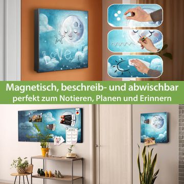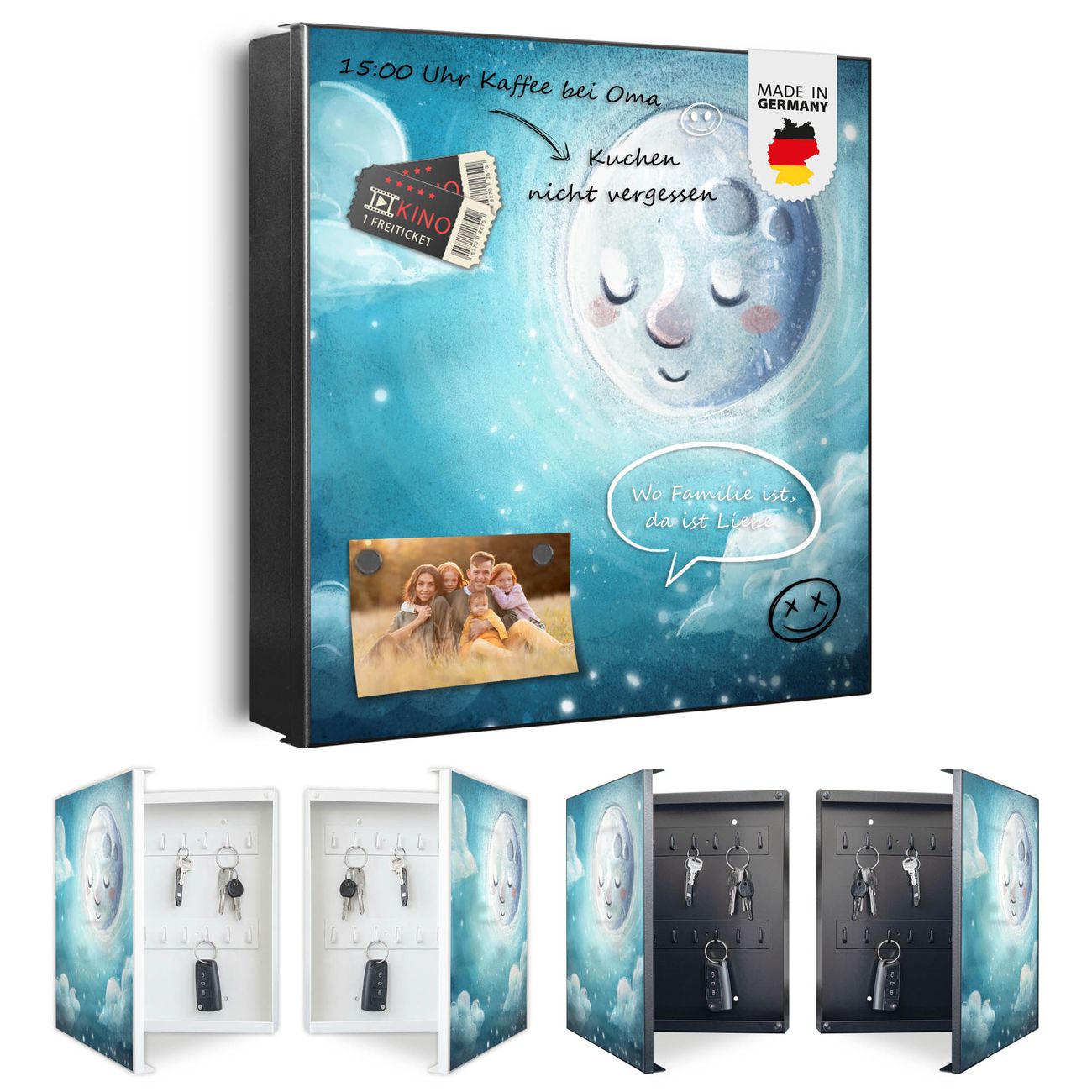 Bringe Ordnung und Eleganz in deinen Eingangsbereich mit dem banjado Schlüsselkasten Motiv Motiv schlafender Mond. Die moderne Schlüsselbox kombiniert funktionales Design mit hochwertiger Verarbeitung und wird so zu einem echten Hingucker in Flur, Büro oder Ferienwohnung. ✅ Stilvolle Schlüsselaufbewahrung mit Motiv Motiv schlafender Mond Der Design-Schlüsselkasten Motiv Motiv schlafender Mond bietet Platz für bis zu 32 Schlüssel, die auf 4 stabilen Reihen mit je 8 Haken übersichtlich verstaut werden. Mit seinen kompakten Maßen von 30 x 30 x 5 cm passt die Schlüsselbox perfekt auch in kleinere Räume. Der schwarz lackierte Stahlkorpus mit links angeschlagenem Türscharnier harmoniert mit gedruckten Folie auf der Front und fügt sich nahtlos in jedes Wohnambiente ein. Ob als Schlüsselorganizer für Zuhause oder als praktische Lösung für Büros, Praxen und Gewerbe, der banjado Schlüsselkasten sorgt für Ordnung und Übersicht. Dank der magnetischen, mit Kreidestiften beschreibbaren Folie auf der Front kannst du Notizen anheften oder Termine direkt auf der Oberfläche festhalten. Die Schlüsselbox Motiv Motiv schlafender Mond zur Wandmontage wird inklusive Befestigungsmaterial geliefert und ist schnell angebracht. So hast du deine Schlüssel jederzeit griffbereit und zugleich stilvoll verstaut. Mit diesem banjado Schlüsselkasten Motiv Motiv schlafender Mond kombinierst du praktische Aufbewahrung mit stilvollem Wohndesign. Ob privat oder geschäftlich, die Schlüsselbox sorgt für mehr Ordnung, Übersicht und ein wohnliches Ambiente.Vorteile im Überblick