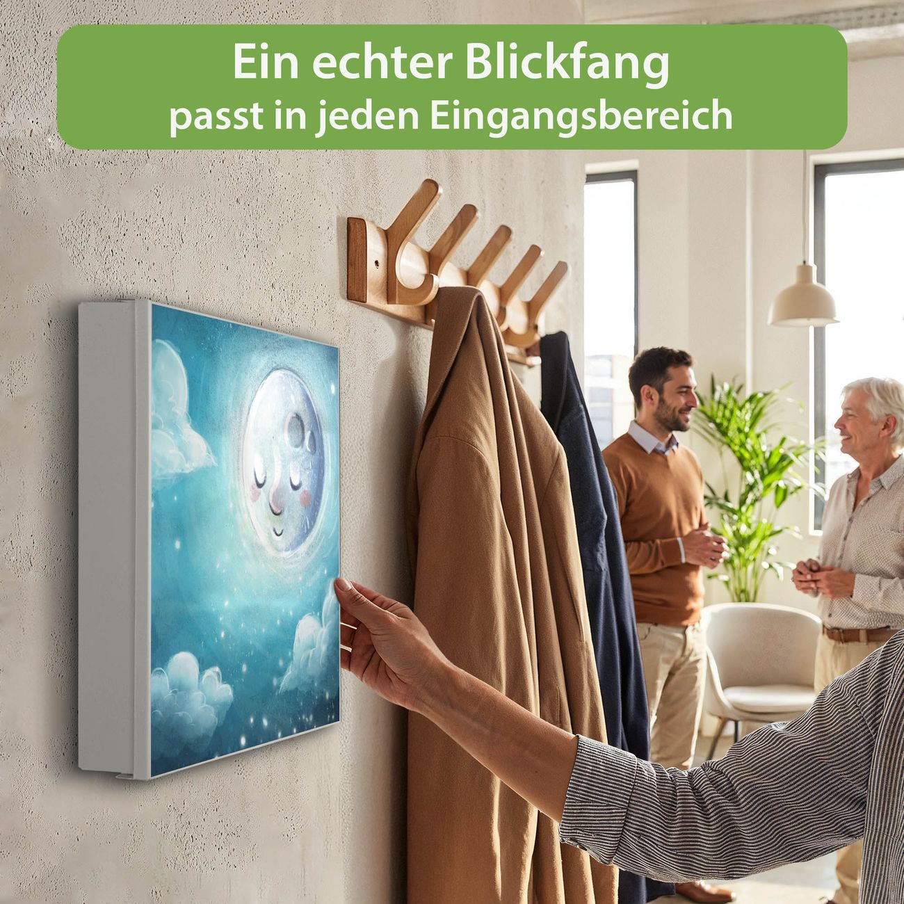 Bringe Ordnung und Eleganz in deinen Eingangsbereich mit dem banjado Schlüsselkasten Motiv Motiv schlafender Mond. Die moderne Schlüsselbox kombiniert funktionales Design mit hochwertiger Verarbeitung und wird so zu einem echten Hingucker in Flur, Büro oder Ferienwohnung. ✅ Stilvolle Schlüsselaufbewahrung mit Motiv Motiv schlafender Mond Der Design-Schlüsselkasten Motiv Motiv schlafender Mond bietet Platz für bis zu 32 Schlüssel, die auf 4 stabilen Reihen mit je 8 Haken übersichtlich verstaut werden. Mit seinen kompakten Maßen von 30 x 30 x 5 cm passt die Schlüsselbox perfekt auch in kleinere Räume. Der weiß lackierte Stahlkorpus mit links angeschlagenem Türscharnier harmoniert mit gedruckten Folie auf der Front und fügt sich nahtlos in jedes Wohnambiente ein. Ob als Schlüsselorganizer für Zuhause oder als praktische Lösung für Büros, Praxen und Gewerbe, der banjado Schlüsselkasten sorgt für Ordnung und Übersicht. Dank der magnetischen, mit Kreidestiften beschreibbaren Folie auf der Front kannst du Notizen anheften oder Termine direkt auf der Oberfläche festhalten. Die Schlüsselbox Motiv Motiv schlafender Mond zur Wandmontage wird inklusive Befestigungsmaterial geliefert und ist schnell angebracht. So hast du deine Schlüssel jederzeit griffbereit und zugleich stilvoll verstaut. Mit diesem banjado Schlüsselkasten Motiv Motiv schlafender Mond kombinierst du praktische Aufbewahrung mit stilvollem Wohndesign. Ob privat oder geschäftlich, die Schlüsselbox sorgt für mehr Ordnung, Übersicht und ein wohnliches Ambiente.Vorteile im Überblick