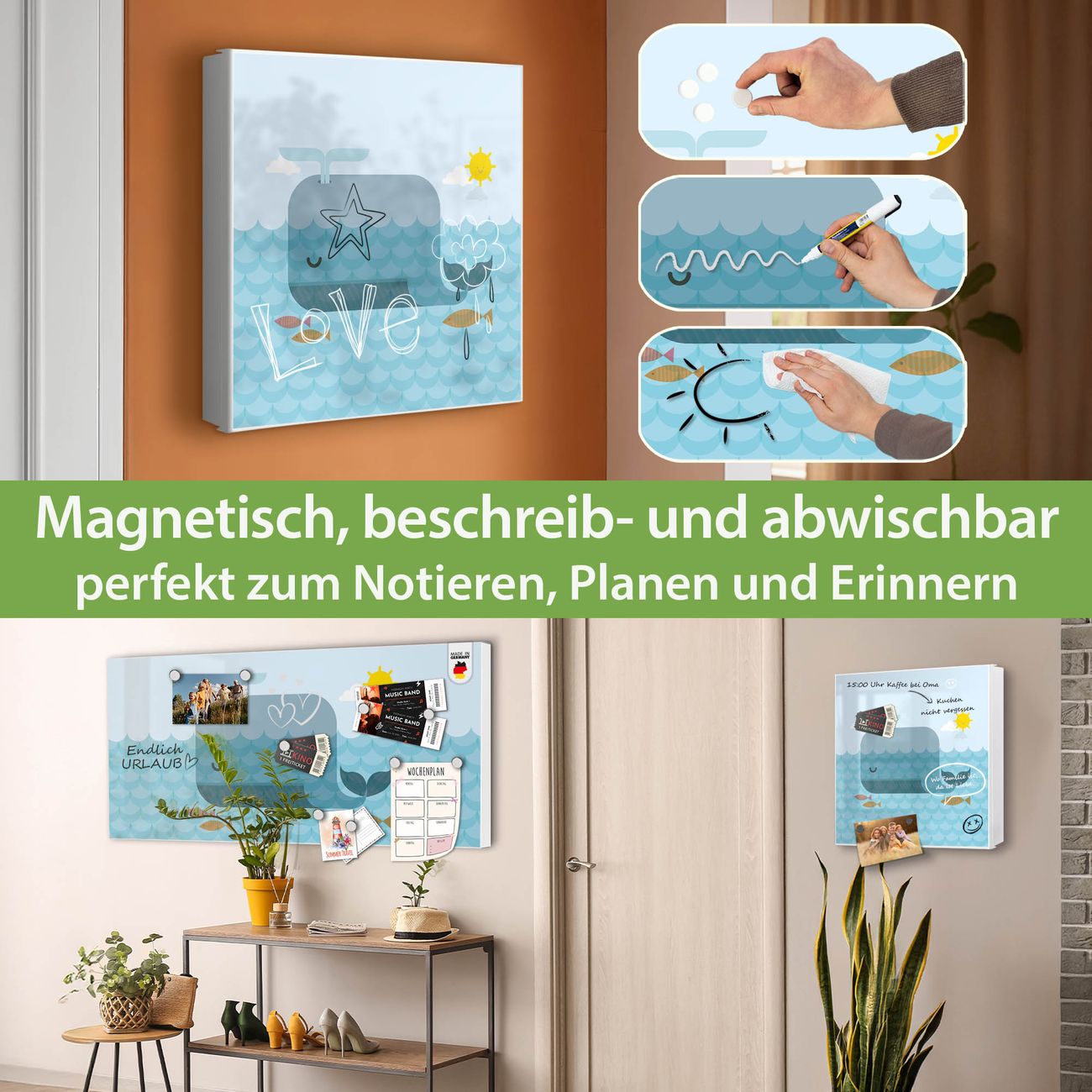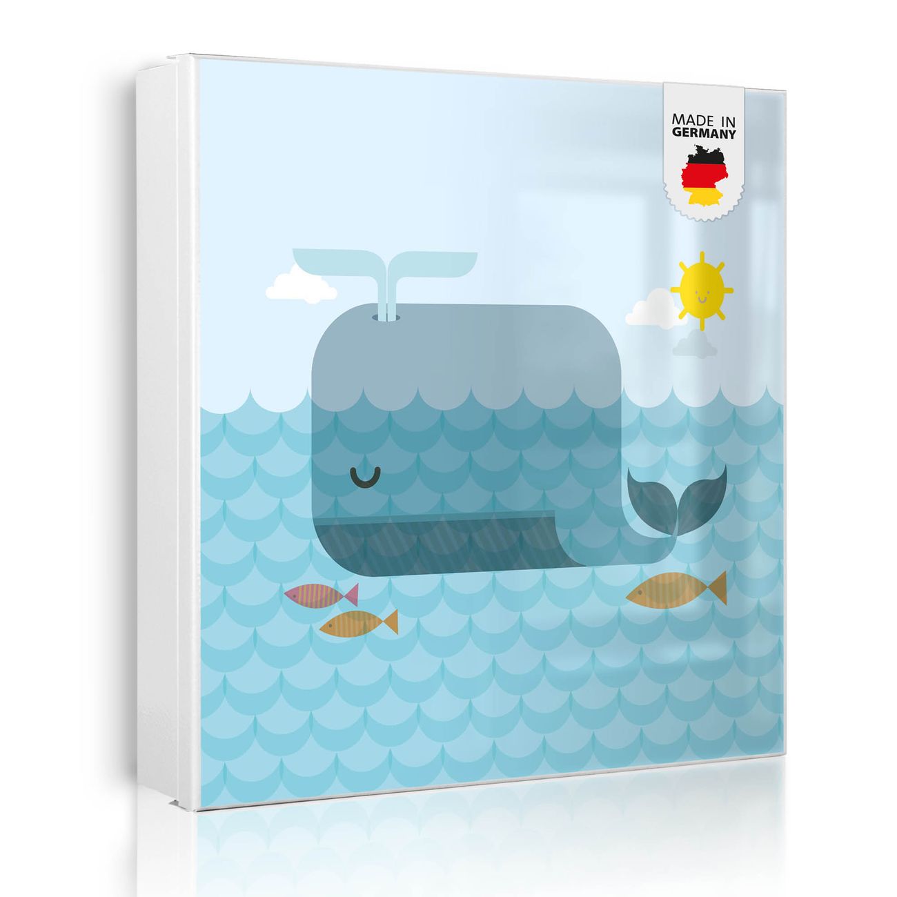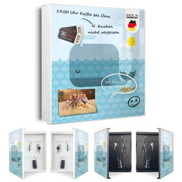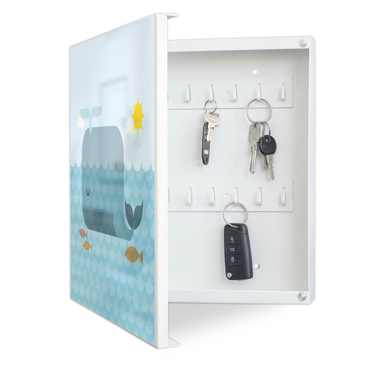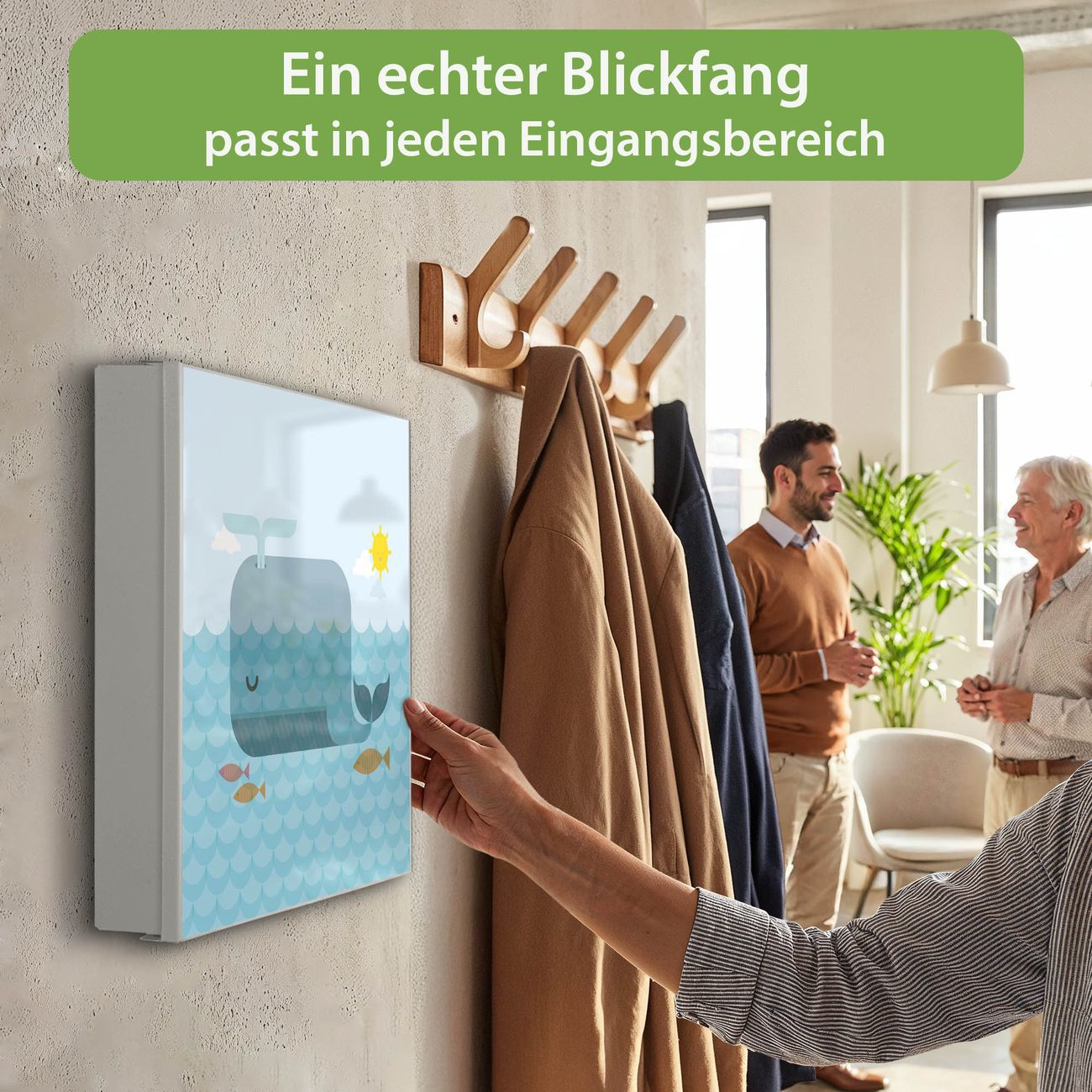 Bringe Ordnung und Eleganz in deinen Eingangsbereich mit dem banjado Schlüsselkasten Motiv Motiv Schlafender Wal. Die moderne Schlüsselbox kombiniert funktionales Design mit hochwertiger Verarbeitung und wird so zu einem echten Hingucker in Flur, Büro oder Ferienwohnung. ✅ Stilvolle Schlüsselaufbewahrung mit Motiv Motiv Schlafender Wal Der Design-Schlüsselkasten Motiv Motiv Schlafender Wal bietet Platz für bis zu 32 Schlüssel, die auf 4 stabilen Reihen mit je 8 Haken übersichtlich verstaut werden. Mit seinen kompakten Maßen von 30 x 30 x 5 cm passt die Schlüsselbox perfekt auch in kleinere Räume. Der weiß lackierte Stahlkorpus mit links angeschlagenem Türscharnier harmoniert mit gedruckten Folie auf der Front und fügt sich nahtlos in jedes Wohnambiente ein. Ob als Schlüsselorganizer für Zuhause oder als praktische Lösung für Büros, Praxen und Gewerbe, der banjado Schlüsselkasten sorgt für Ordnung und Übersicht. Dank der magnetischen, mit Kreidestiften beschreibbaren Folie auf der Front kannst du Notizen anheften oder Termine direkt auf der Oberfläche festhalten. Die Schlüsselbox Motiv Motiv Schlafender Wal zur Wandmontage wird inklusive Befestigungsmaterial geliefert und ist schnell angebracht. So hast du deine Schlüssel jederzeit griffbereit und zugleich stilvoll verstaut. Mit diesem banjado Schlüsselkasten Motiv Motiv Schlafender Wal kombinierst du praktische Aufbewahrung mit stilvollem Wohndesign. Ob privat oder geschäftlich, die Schlüsselbox sorgt für mehr Ordnung, Übersicht und ein wohnliches Ambiente.Vorteile im Überblick