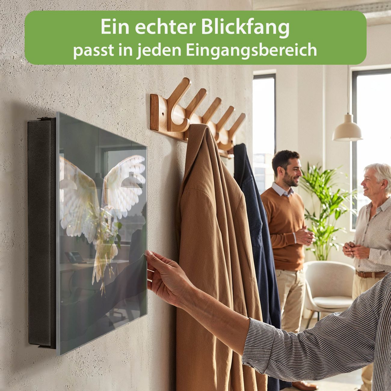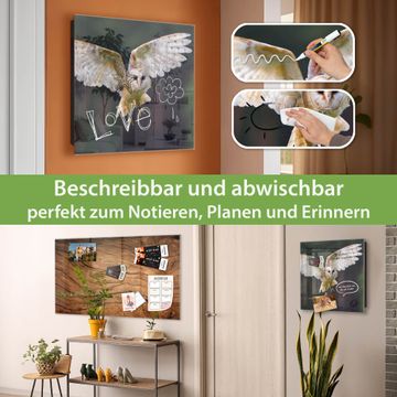 Bringe Ordnung und Eleganz in deinen Eingangsbereich mit dem banjado Schlüsselkasten Motiv Motiv Schleiereule. Die moderne Schlüsselbox kombiniert funktionales Design mit hochwertiger Verarbeitung und wird so zu einem echten Hingucker in Flur, Büro oder Ferienwohnung. ✅ Stilvolle Schlüsselaufbewahrung mit Glasfront im Motiv Motiv Schleiereule Der Design-Schlüsselkasten Motiv Motiv Schleiereule bietet Platz für bis zu 50 Schlüssel, die auf 5 stabilen Reihen mit je 10 Haken übersichtlich verstaut werden. Mit seinen kompakten Maßen von 30 x 30 x 5 cm passt die Schlüsselbox perfekt auch in kleinere Räume. Der schwarz lackierte Stahlkorpus mit rechts angeschlagenem Türscharnier harmoniert mit der Glasfront und fügt sich nahtlos in jedes Wohnambiente ein. Ob als Schlüsselorganizer für Zuhause oder als praktische Lösung für Büros, Praxen und Gewerbe, der banjado Schlüsselkasten sorgt für Ordnung und Übersicht. Dank der magnetischen, mit Kreidestiften beschreibbaren Glasfront kannst du Notizen anheften oder Termine direkt auf der Oberfläche festhalten. Die Schlüsselbox Motiv Motiv Schleiereule zur Wandmontage wird inklusive Befestigungsmaterial geliefert und ist schnell angebracht. So hast du deine Schlüssel jederzeit griffbereit und zugleich stilvoll verstaut. Mit diesem banjado Schlüsselkasten Motiv Motiv Schleiereule kombinierst du praktische Aufbewahrung mit stilvollem Wohndesign. Ob privat oder geschäftlich, die Schlüsselbox sorgt für mehr Ordnung, Übersicht und ein wohnliches Ambiente.Vorteile im Überblick