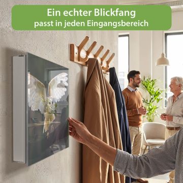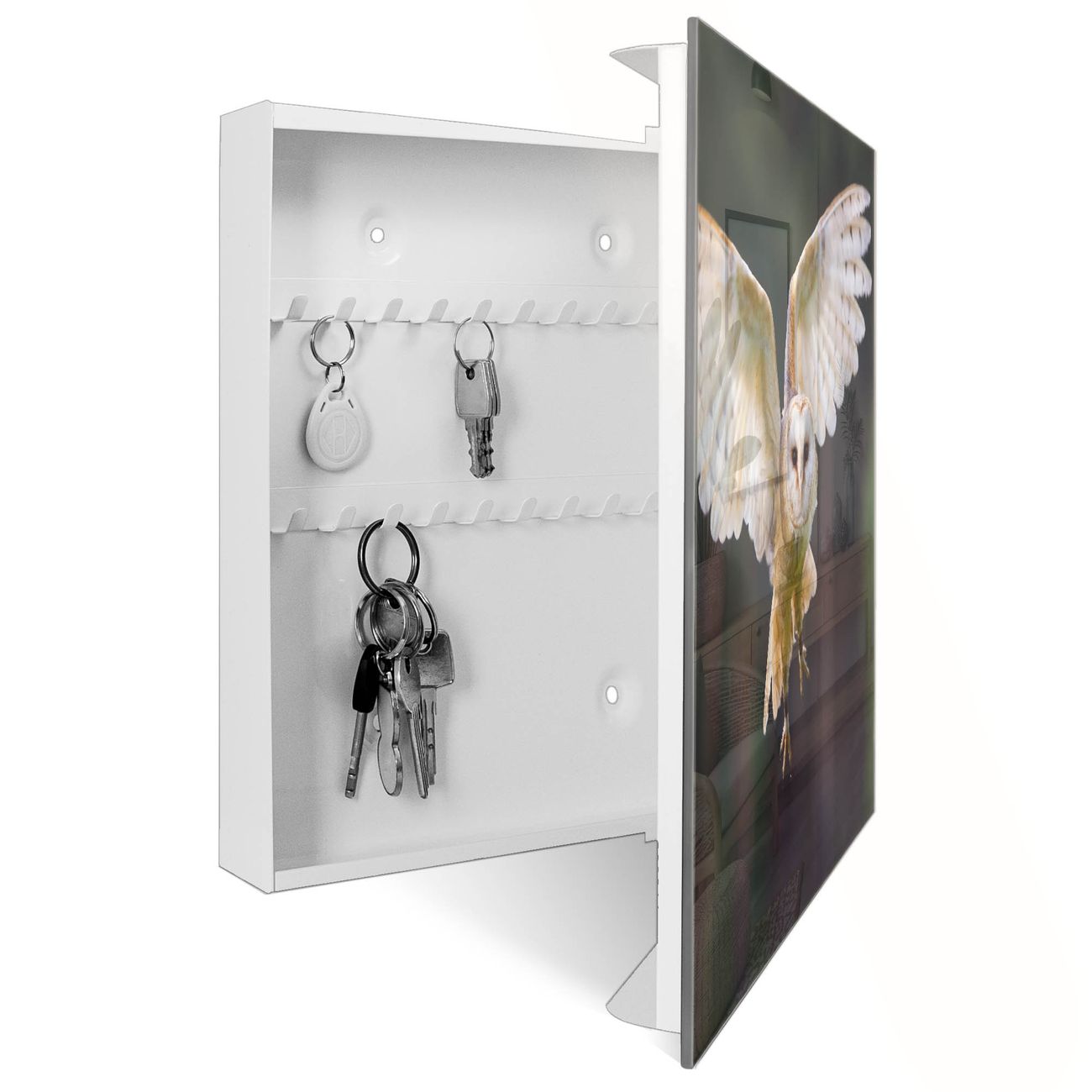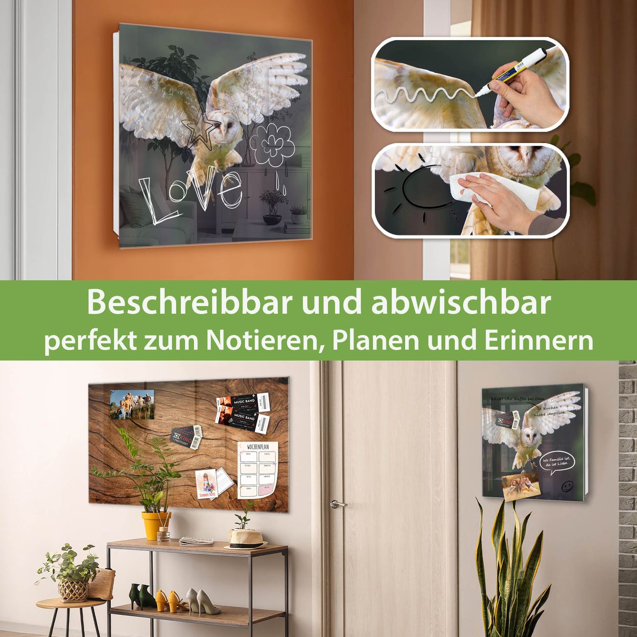 Bringe Ordnung und Eleganz in deinen Eingangsbereich mit dem banjado Schlüsselkasten Motiv Motiv Schleiereule. Die moderne Schlüsselbox kombiniert funktionales Design mit hochwertiger Verarbeitung und wird so zu einem echten Hingucker in Flur, Büro oder Ferienwohnung. ✅ Stilvolle Schlüsselaufbewahrung mit Glasfront im Motiv Motiv Schleiereule Der Design-Schlüsselkasten Motiv Motiv Schleiereule bietet Platz für bis zu 50 Schlüssel, die auf 5 stabilen Reihen mit je 10 Haken übersichtlich verstaut werden. Mit seinen kompakten Maßen von 30 x 30 x 5 cm passt die Schlüsselbox perfekt auch in kleinere Räume. Der weiß lackierte Stahlkorpus mit rechts angeschlagenem Türscharnier harmoniert mit der Glasfront und fügt sich nahtlos in jedes Wohnambiente ein. Ob als Schlüsselorganizer für Zuhause oder als praktische Lösung für Büros, Praxen und Gewerbe, der banjado Schlüsselkasten sorgt für Ordnung und Übersicht. Dank der magnetischen, mit Kreidestiften beschreibbaren Glasfront kannst du Notizen anheften oder Termine direkt auf der Oberfläche festhalten. Die Schlüsselbox Motiv Motiv Schleiereule zur Wandmontage wird inklusive Befestigungsmaterial geliefert und ist schnell angebracht. So hast du deine Schlüssel jederzeit griffbereit und zugleich stilvoll verstaut. Mit diesem banjado Schlüsselkasten Motiv Motiv Schleiereule kombinierst du praktische Aufbewahrung mit stilvollem Wohndesign. Ob privat oder geschäftlich, die Schlüsselbox sorgt für mehr Ordnung, Übersicht und ein wohnliches Ambiente.Vorteile im Überblick