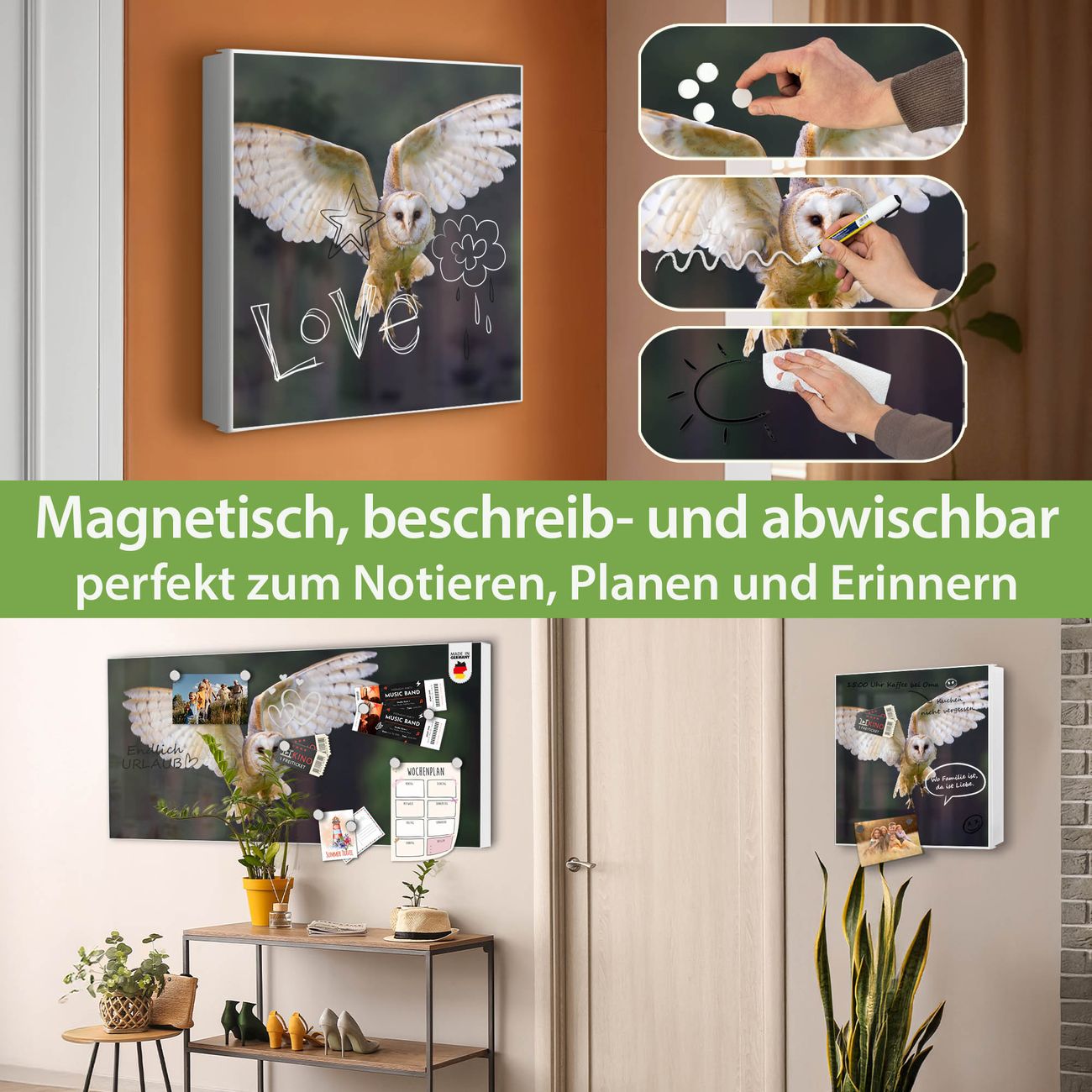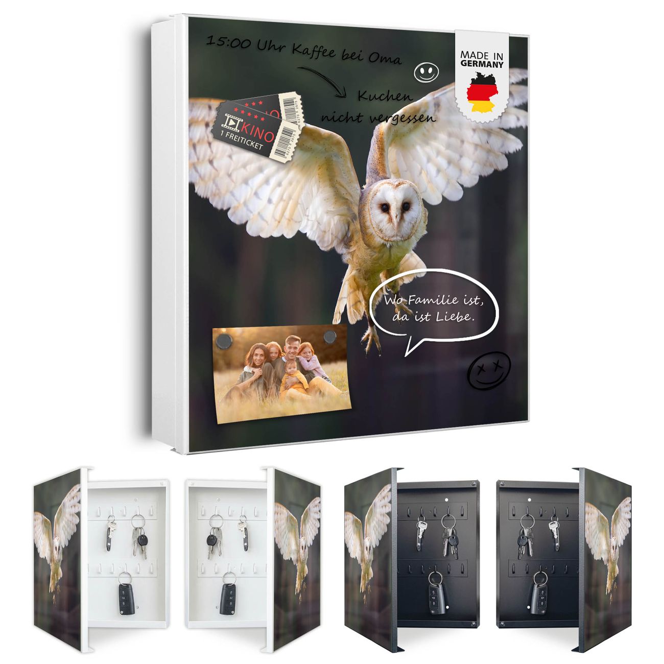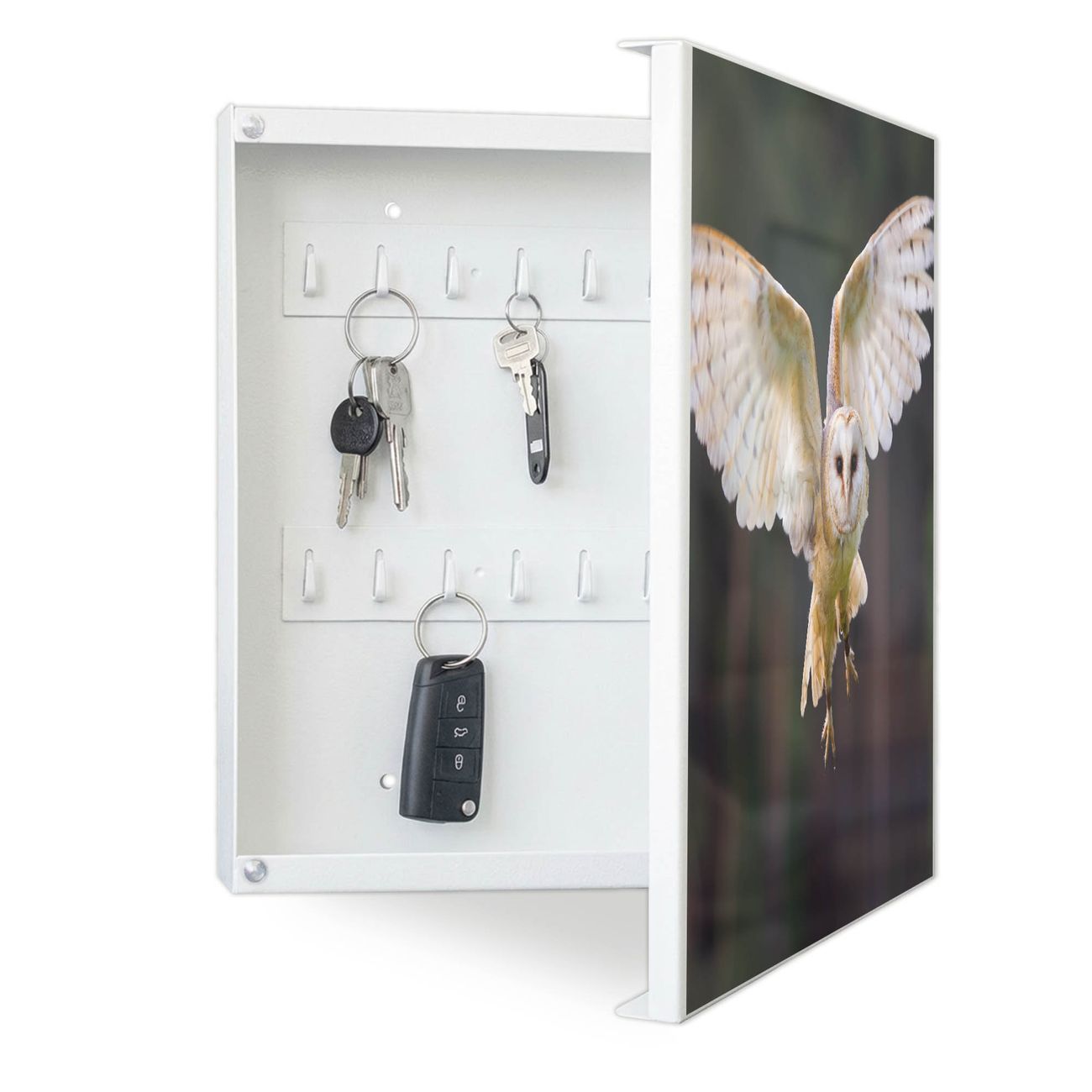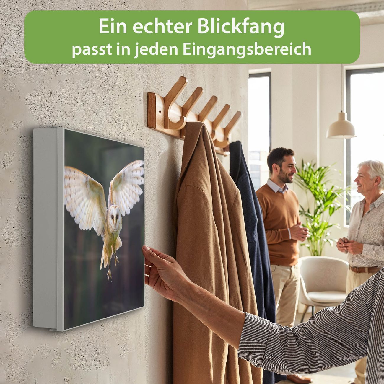 Bringe Ordnung und Eleganz in deinen Eingangsbereich mit dem banjado Schlüsselkasten Motiv Motiv Schleiereule. Die moderne Schlüsselbox kombiniert funktionales Design mit hochwertiger Verarbeitung und wird so zu einem echten Hingucker in Flur, Büro oder Ferienwohnung. ✅ Stilvolle Schlüsselaufbewahrung mit Motiv Motiv Schleiereule Der Design-Schlüsselkasten Motiv Motiv Schleiereule bietet Platz für bis zu 32 Schlüssel, die auf 4 stabilen Reihen mit je 8 Haken übersichtlich verstaut werden. Mit seinen kompakten Maßen von 30 x 30 x 5 cm passt die Schlüsselbox perfekt auch in kleinere Räume. Der weiß lackierte Stahlkorpus mit rechts angeschlagenem Türscharnier harmoniert mit gedruckten Folie auf der Front und fügt sich nahtlos in jedes Wohnambiente ein. Ob als Schlüsselorganizer für Zuhause oder als praktische Lösung für Büros, Praxen und Gewerbe, der banjado Schlüsselkasten sorgt für Ordnung und Übersicht. Dank der magnetischen, mit Kreidestiften beschreibbaren Folie auf der Front kannst du Notizen anheften oder Termine direkt auf der Oberfläche festhalten. Die Schlüsselbox Motiv Motiv Schleiereule zur Wandmontage wird inklusive Befestigungsmaterial geliefert und ist schnell angebracht. So hast du deine Schlüssel jederzeit griffbereit und zugleich stilvoll verstaut. Mit diesem banjado Schlüsselkasten Motiv Motiv Schleiereule kombinierst du praktische Aufbewahrung mit stilvollem Wohndesign. Ob privat oder geschäftlich, die Schlüsselbox sorgt für mehr Ordnung, Übersicht und ein wohnliches Ambiente.Vorteile im Überblick