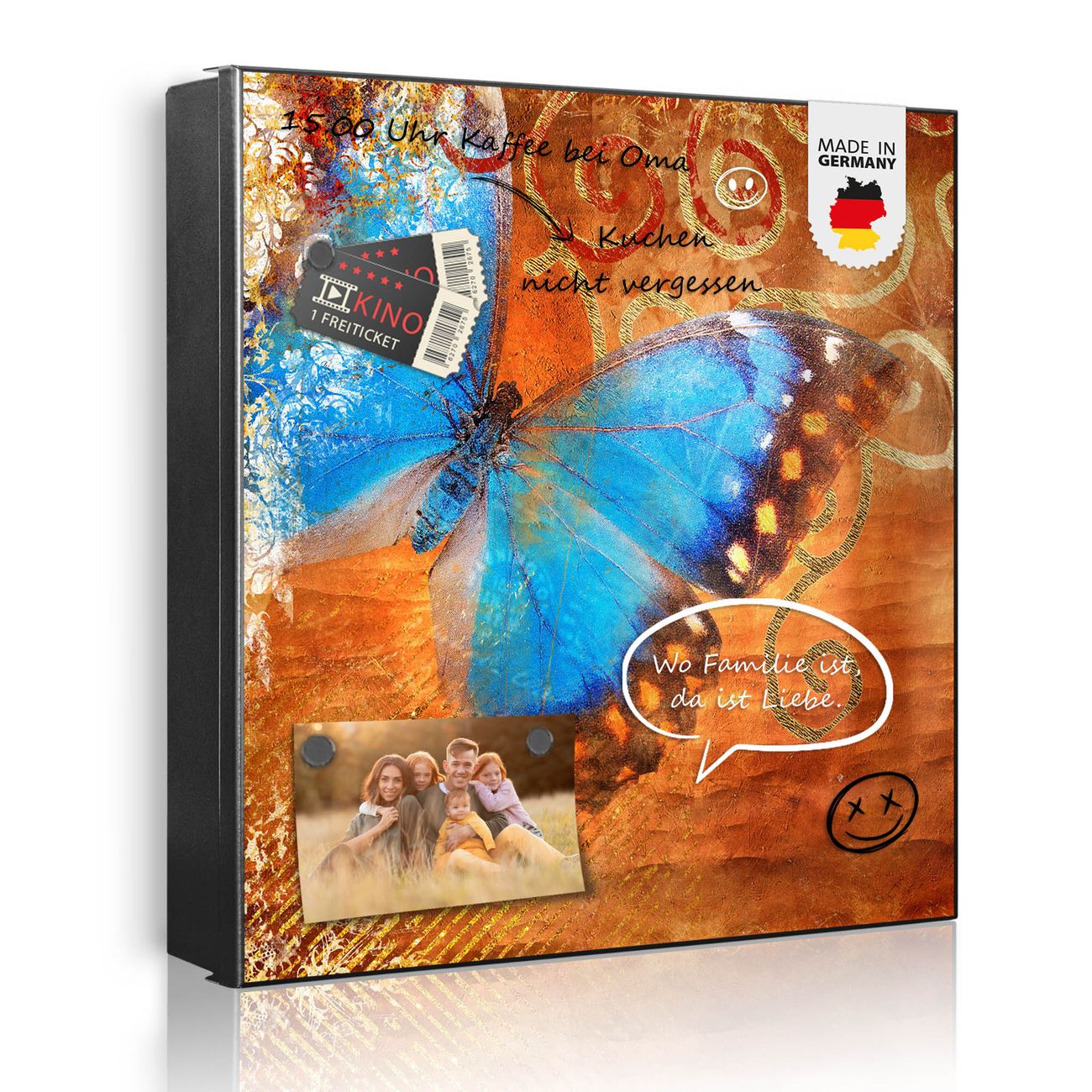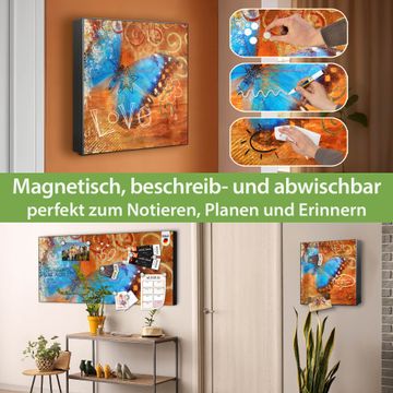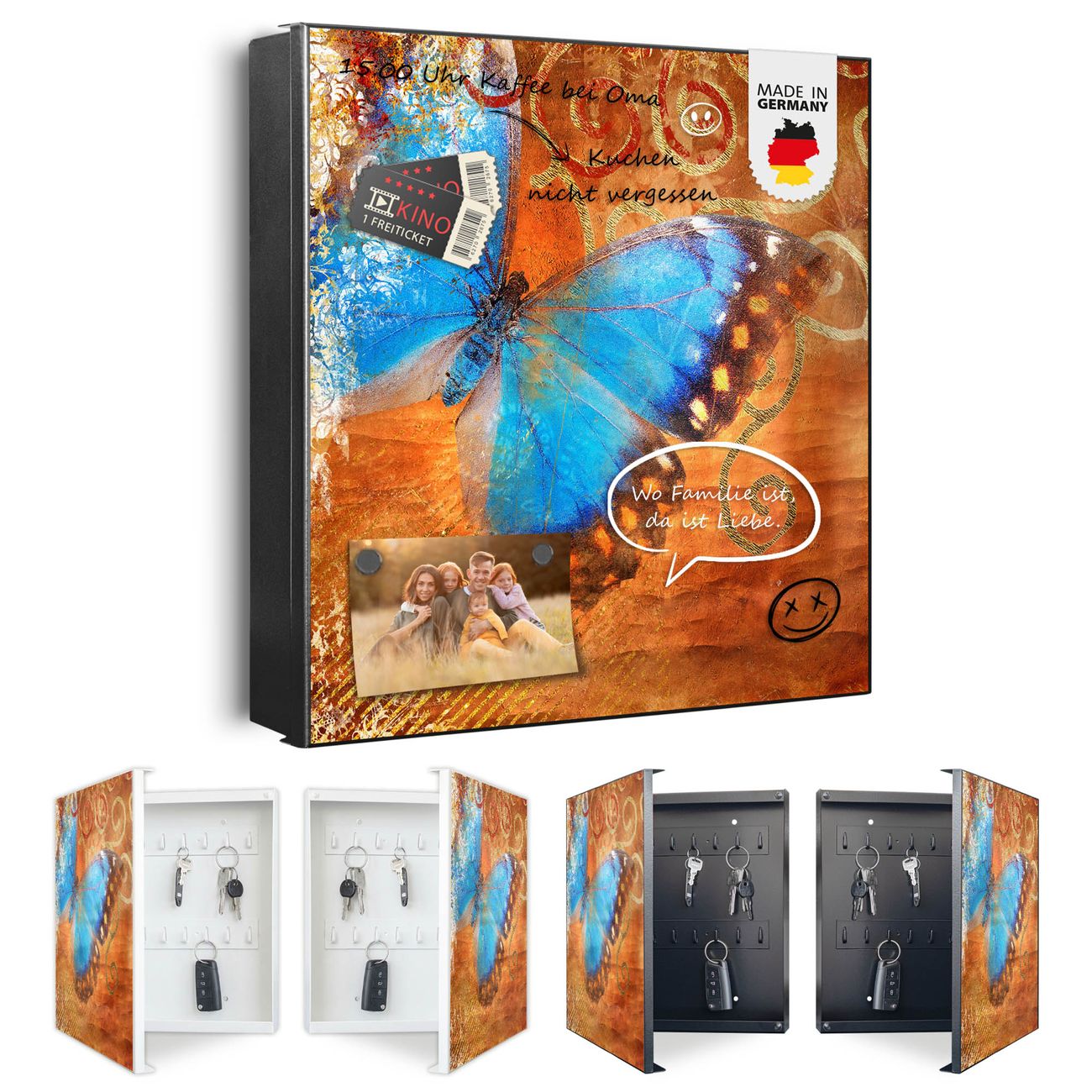 Bringe Ordnung und Eleganz in deinen Eingangsbereich mit dem banjado Schlüsselkasten Motiv Motiv Schmetterling. Die moderne Schlüsselbox kombiniert funktionales Design mit hochwertiger Verarbeitung und wird so zu einem echten Hingucker in Flur, Büro oder Ferienwohnung. ✅ Stilvolle Schlüsselaufbewahrung mit Motiv Motiv Schmetterling Der Design-Schlüsselkasten Motiv Motiv Schmetterling bietet Platz für bis zu 32 Schlüssel, die auf 4 stabilen Reihen mit je 8 Haken übersichtlich verstaut werden. Mit seinen kompakten Maßen von 30 x 30 x 5 cm passt die Schlüsselbox perfekt auch in kleinere Räume. Der schwarz lackierte Stahlkorpus mit rechts angeschlagenem Türscharnier harmoniert mit gedruckten Folie auf der Front und fügt sich nahtlos in jedes Wohnambiente ein. Ob als Schlüsselorganizer für Zuhause oder als praktische Lösung für Büros, Praxen und Gewerbe, der banjado Schlüsselkasten sorgt für Ordnung und Übersicht. Dank der magnetischen, mit Kreidestiften beschreibbaren Folie auf der Front kannst du Notizen anheften oder Termine direkt auf der Oberfläche festhalten. Die Schlüsselbox Motiv Motiv Schmetterling zur Wandmontage wird inklusive Befestigungsmaterial geliefert und ist schnell angebracht. So hast du deine Schlüssel jederzeit griffbereit und zugleich stilvoll verstaut. Mit diesem banjado Schlüsselkasten Motiv Motiv Schmetterling kombinierst du praktische Aufbewahrung mit stilvollem Wohndesign. Ob privat oder geschäftlich, die Schlüsselbox sorgt für mehr Ordnung, Übersicht und ein wohnliches Ambiente.Vorteile im Überblick