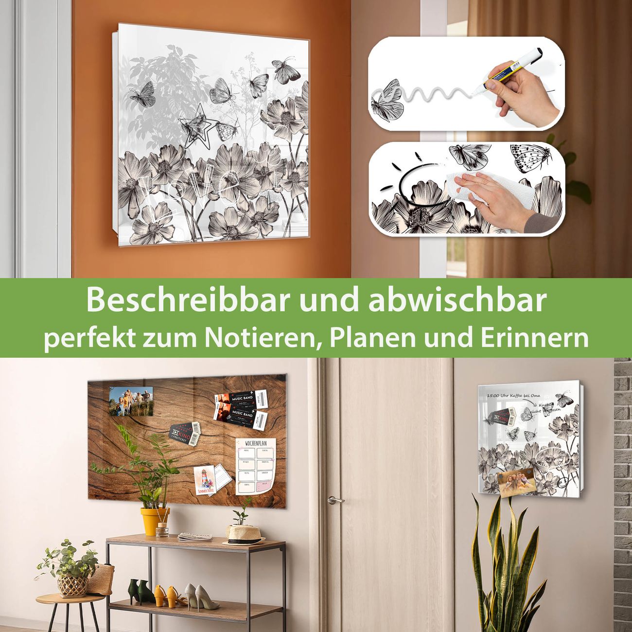 Bringe Ordnung und Eleganz in deinen Eingangsbereich mit dem banjado Schlüsselkasten Motiv Motiv Schmetterlingsgarten. Die moderne Schlüsselbox kombiniert funktionales Design mit hochwertiger Verarbeitung und wird so zu einem echten Hingucker in Flur, Büro oder Ferienwohnung. ✅ Stilvolle Schlüsselaufbewahrung mit Glasfront im Motiv Motiv Schmetterlingsgarten Der Design-Schlüsselkasten Motiv Motiv Schmetterlingsgarten bietet Platz für bis zu 50 Schlüssel, die auf 5 stabilen Reihen mit je 10 Haken übersichtlich verstaut werden. Mit seinen kompakten Maßen von 30 x 30 x 5 cm passt die Schlüsselbox perfekt auch in kleinere Räume. Der weiß lackierte Stahlkorpus mit rechts angeschlagenem Türscharnier harmoniert mit der Glasfront und fügt sich nahtlos in jedes Wohnambiente ein. Ob als Schlüsselorganizer für Zuhause oder als praktische Lösung für Büros, Praxen und Gewerbe, der banjado Schlüsselkasten sorgt für Ordnung und Übersicht. Dank der magnetischen, mit Kreidestiften beschreibbaren Glasfront kannst du Notizen anheften oder Termine direkt auf der Oberfläche festhalten. Die Schlüsselbox Motiv Motiv Schmetterlingsgarten zur Wandmontage wird inklusive Befestigungsmaterial geliefert und ist schnell angebracht. So hast du deine Schlüssel jederzeit griffbereit und zugleich stilvoll verstaut. Mit diesem banjado Schlüsselkasten Motiv Motiv Schmetterlingsgarten kombinierst du praktische Aufbewahrung mit stilvollem Wohndesign. Ob privat oder geschäftlich, die Schlüsselbox sorgt für mehr Ordnung, Übersicht und ein wohnliches Ambiente.Vorteile im Überblick