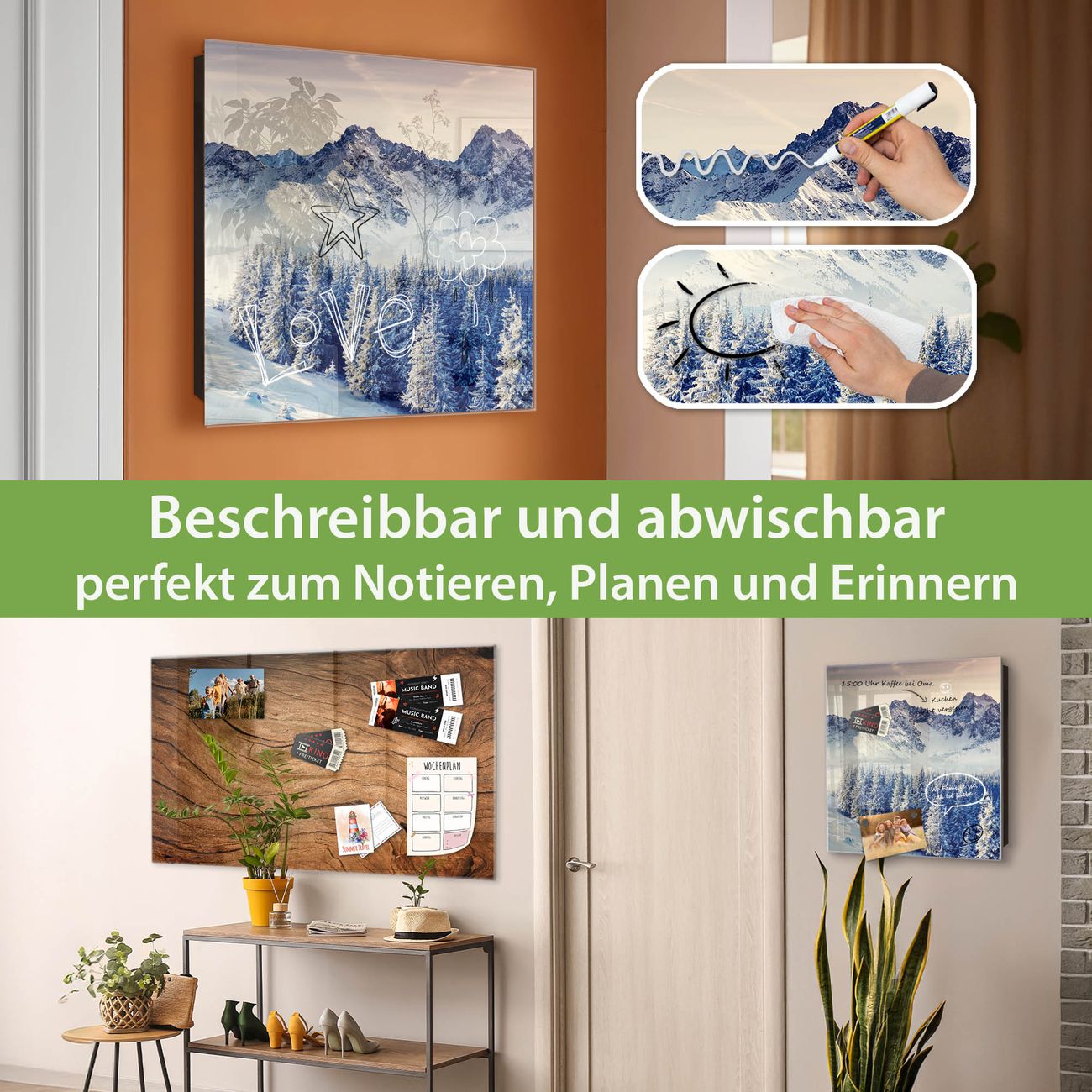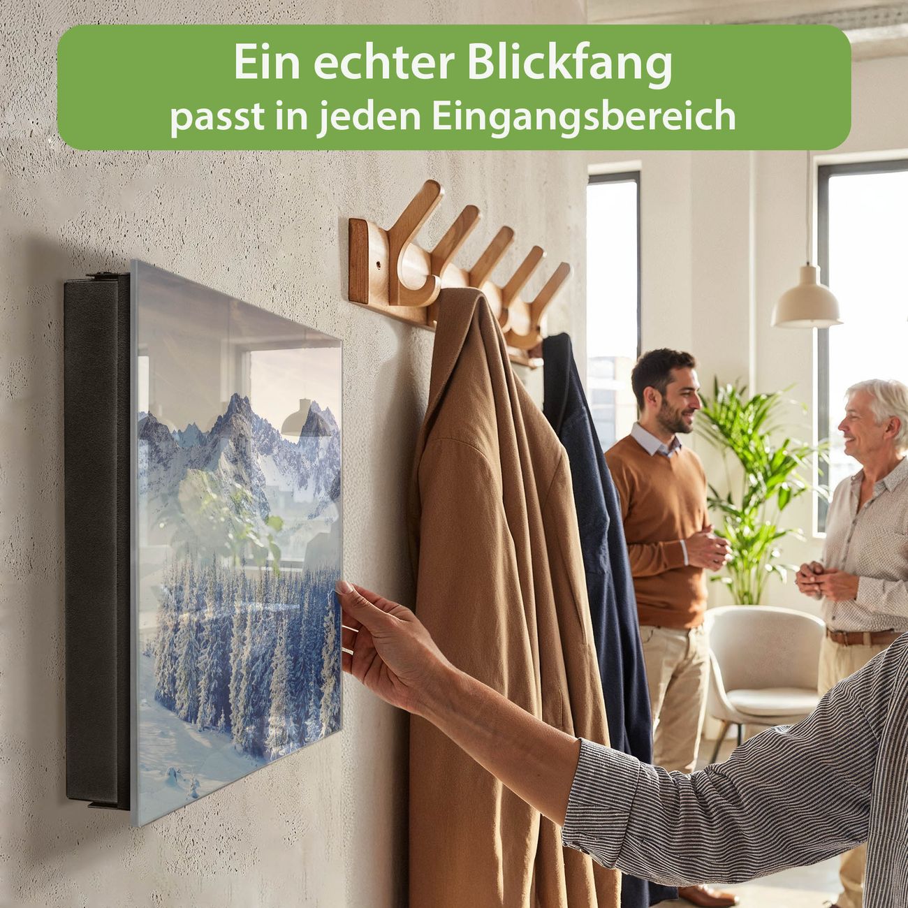 Bringe Ordnung und Eleganz in deinen Eingangsbereich mit dem banjado Schlüsselkasten Motiv Motiv Schneebedeckte Berge. Die moderne Schlüsselbox kombiniert funktionales Design mit hochwertiger Verarbeitung und wird so zu einem echten Hingucker in Flur, Büro oder Ferienwohnung. ✅ Stilvolle Schlüsselaufbewahrung mit Glasfront im Motiv Motiv Schneebedeckte Berge Der Design-Schlüsselkasten Motiv Motiv Schneebedeckte Berge bietet Platz für bis zu 50 Schlüssel, die auf 5 stabilen Reihen mit je 10 Haken übersichtlich verstaut werden. Mit seinen kompakten Maßen von 30 x 30 x 5 cm passt die Schlüsselbox perfekt auch in kleinere Räume. Der schwarz lackierte Stahlkorpus mit rechts angeschlagenem Türscharnier harmoniert mit der Glasfront und fügt sich nahtlos in jedes Wohnambiente ein. Ob als Schlüsselorganizer für Zuhause oder als praktische Lösung für Büros, Praxen und Gewerbe, der banjado Schlüsselkasten sorgt für Ordnung und Übersicht. Dank der magnetischen, mit Kreidestiften beschreibbaren Glasfront kannst du Notizen anheften oder Termine direkt auf der Oberfläche festhalten. Die Schlüsselbox Motiv Motiv Schneebedeckte Berge zur Wandmontage wird inklusive Befestigungsmaterial geliefert und ist schnell angebracht. So hast du deine Schlüssel jederzeit griffbereit und zugleich stilvoll verstaut. Mit diesem banjado Schlüsselkasten Motiv Motiv Schneebedeckte Berge kombinierst du praktische Aufbewahrung mit stilvollem Wohndesign. Ob privat oder geschäftlich, die Schlüsselbox sorgt für mehr Ordnung, Übersicht und ein wohnliches Ambiente.Vorteile im Überblick