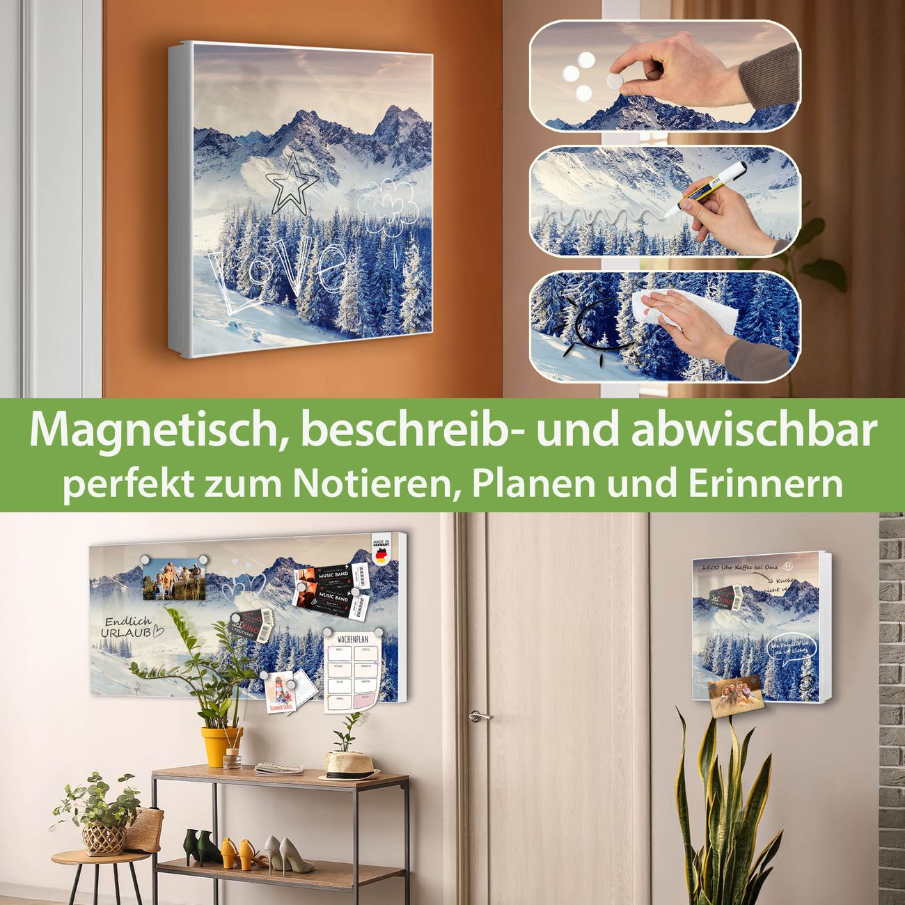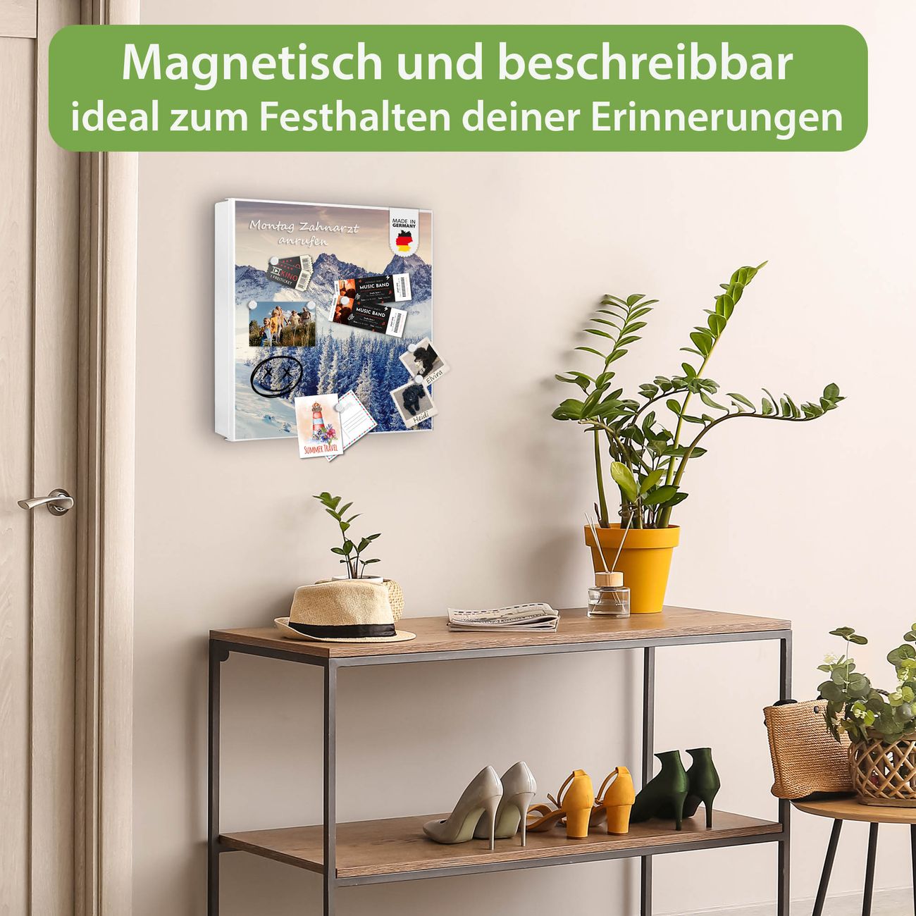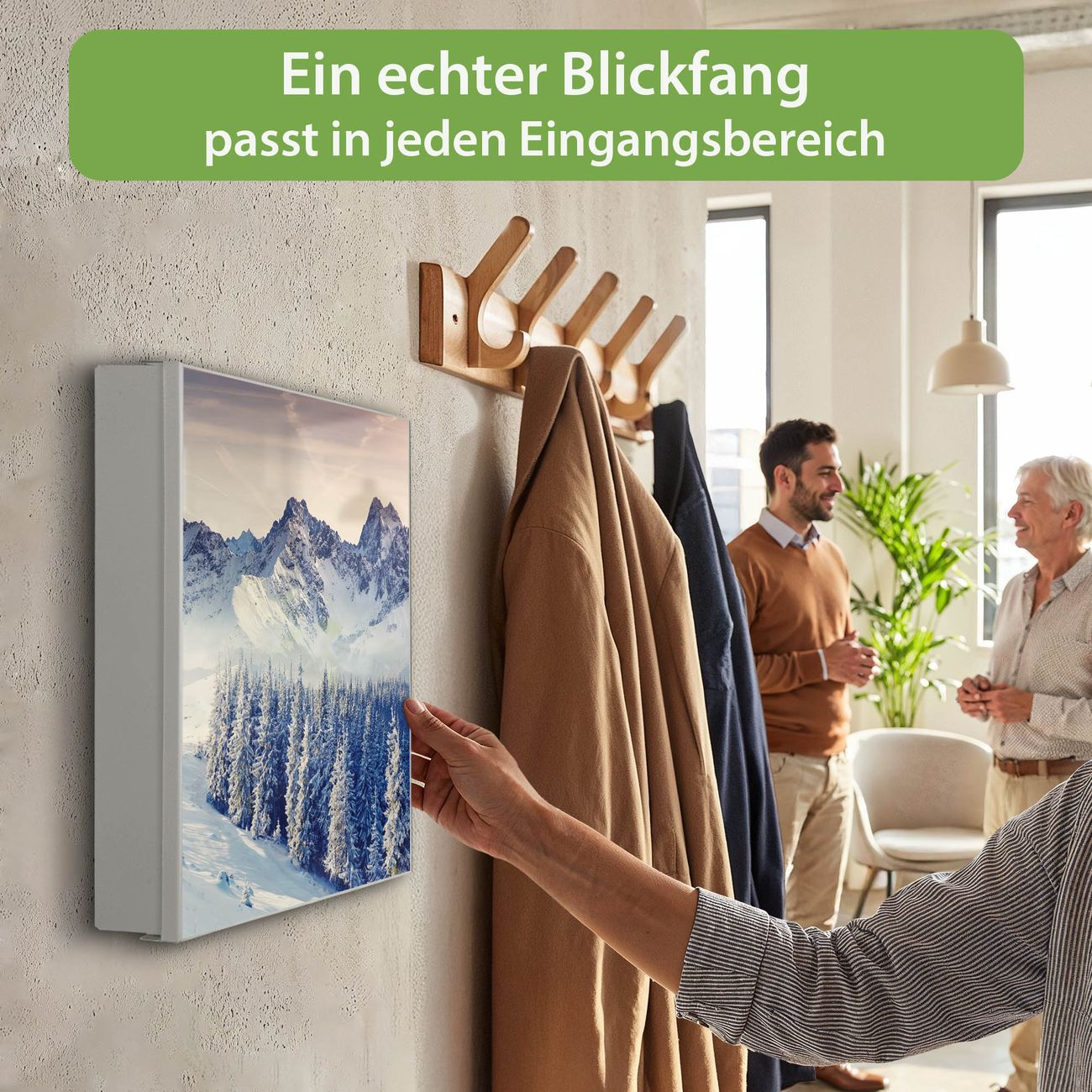 Bringe Ordnung und Eleganz in deinen Eingangsbereich mit dem banjado Schlüsselkasten Motiv Motiv Schneebedeckte Berge. Die moderne Schlüsselbox kombiniert funktionales Design mit hochwertiger Verarbeitung und wird so zu einem echten Hingucker in Flur, Büro oder Ferienwohnung. ✅ Stilvolle Schlüsselaufbewahrung mit Motiv Motiv Schneebedeckte Berge Der Design-Schlüsselkasten Motiv Motiv Schneebedeckte Berge bietet Platz für bis zu 32 Schlüssel, die auf 4 stabilen Reihen mit je 8 Haken übersichtlich verstaut werden. Mit seinen kompakten Maßen von 30 x 30 x 5 cm passt die Schlüsselbox perfekt auch in kleinere Räume. Der weiß lackierte Stahlkorpus mit rechts angeschlagenem Türscharnier harmoniert mit gedruckten Folie auf der Front und fügt sich nahtlos in jedes Wohnambiente ein. Ob als Schlüsselorganizer für Zuhause oder als praktische Lösung für Büros, Praxen und Gewerbe, der banjado Schlüsselkasten sorgt für Ordnung und Übersicht. Dank der magnetischen, mit Kreidestiften beschreibbaren Folie auf der Front kannst du Notizen anheften oder Termine direkt auf der Oberfläche festhalten. Die Schlüsselbox Motiv Motiv Schneebedeckte Berge zur Wandmontage wird inklusive Befestigungsmaterial geliefert und ist schnell angebracht. So hast du deine Schlüssel jederzeit griffbereit und zugleich stilvoll verstaut. Mit diesem banjado Schlüsselkasten Motiv Motiv Schneebedeckte Berge kombinierst du praktische Aufbewahrung mit stilvollem Wohndesign. Ob privat oder geschäftlich, die Schlüsselbox sorgt für mehr Ordnung, Übersicht und ein wohnliches Ambiente.Vorteile im Überblick