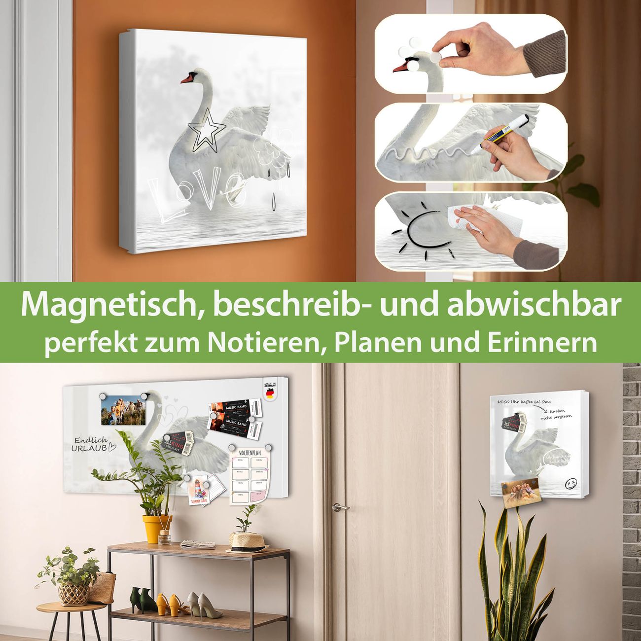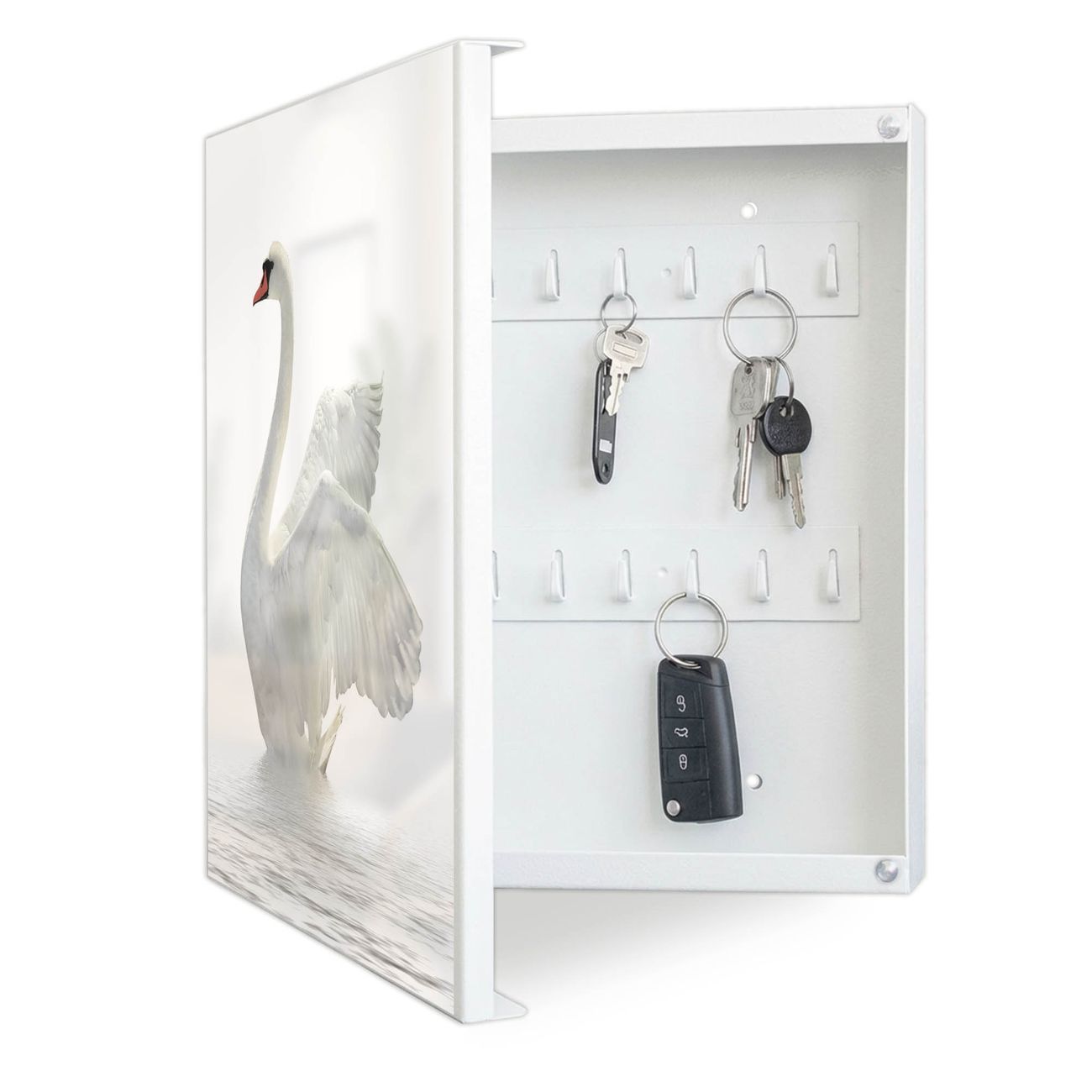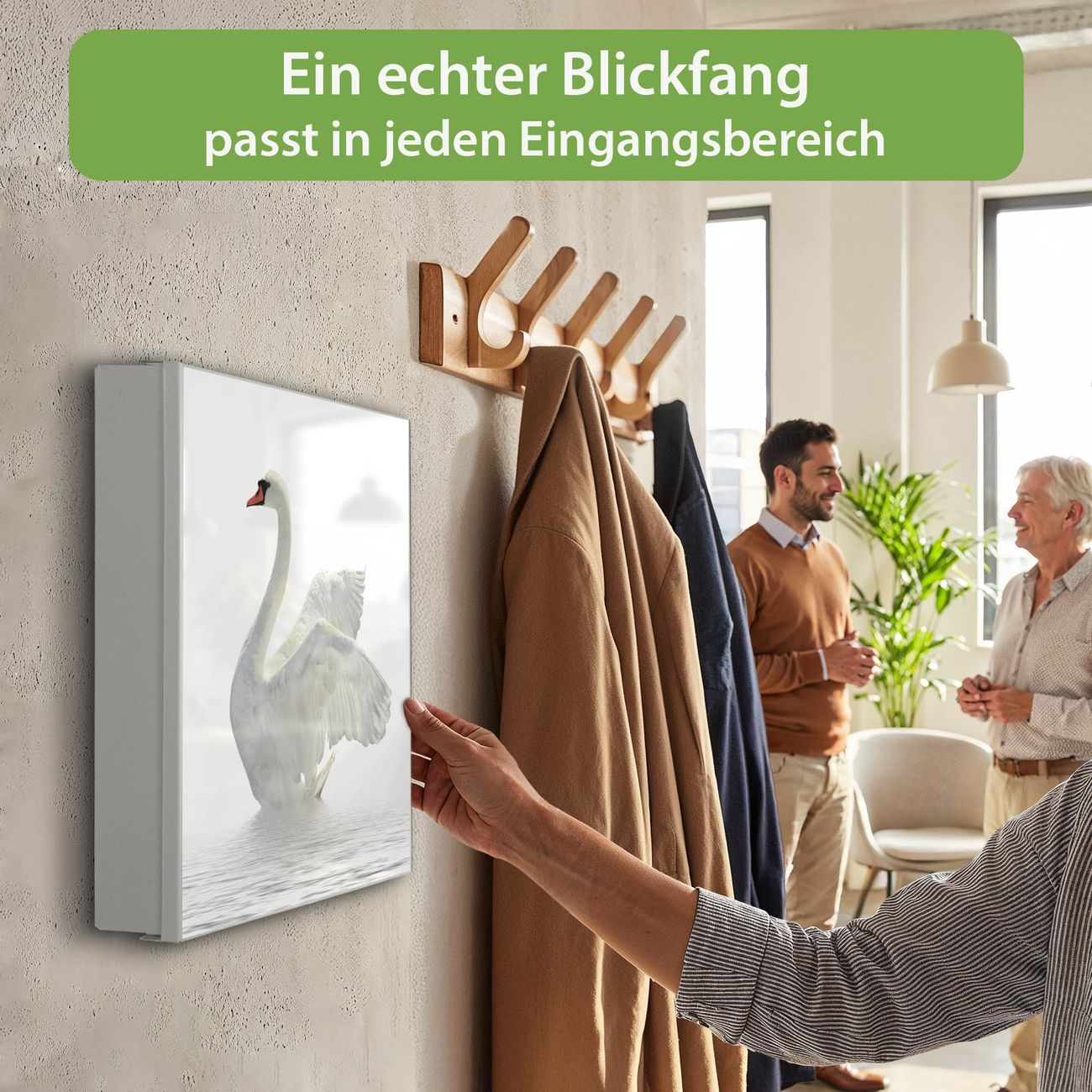 Bringe Ordnung und Eleganz in deinen Eingangsbereich mit dem banjado Schlüsselkasten Motiv Motiv Schwan. Die moderne Schlüsselbox kombiniert funktionales Design mit hochwertiger Verarbeitung und wird so zu einem echten Hingucker in Flur, Büro oder Ferienwohnung. ✅ Stilvolle Schlüsselaufbewahrung mit Motiv Motiv Schwan Der Design-Schlüsselkasten Motiv Motiv Schwan bietet Platz für bis zu 32 Schlüssel, die auf 4 stabilen Reihen mit je 8 Haken übersichtlich verstaut werden. Mit seinen kompakten Maßen von 30 x 30 x 5 cm passt die Schlüsselbox perfekt auch in kleinere Räume. Der weiß lackierte Stahlkorpus mit links angeschlagenem Türscharnier harmoniert mit gedruckten Folie auf der Front und fügt sich nahtlos in jedes Wohnambiente ein. Ob als Schlüsselorganizer für Zuhause oder als praktische Lösung für Büros, Praxen und Gewerbe, der banjado Schlüsselkasten sorgt für Ordnung und Übersicht. Dank der magnetischen, mit Kreidestiften beschreibbaren Folie auf der Front kannst du Notizen anheften oder Termine direkt auf der Oberfläche festhalten. Die Schlüsselbox Motiv Motiv Schwan zur Wandmontage wird inklusive Befestigungsmaterial geliefert und ist schnell angebracht. So hast du deine Schlüssel jederzeit griffbereit und zugleich stilvoll verstaut. Mit diesem banjado Schlüsselkasten Motiv Motiv Schwan kombinierst du praktische Aufbewahrung mit stilvollem Wohndesign. Ob privat oder geschäftlich, die Schlüsselbox sorgt für mehr Ordnung, Übersicht und ein wohnliches Ambiente.Vorteile im Überblick