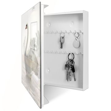 Bringe Ordnung und Eleganz in deinen Eingangsbereich mit dem banjado Schlüsselkasten Motiv Motiv Schwan. Die moderne Schlüsselbox kombiniert funktionales Design mit hochwertiger Verarbeitung und wird so zu einem echten Hingucker in Flur, Büro oder Ferienwohnung. ✅ Stilvolle Schlüsselaufbewahrung mit Glasfront im Motiv Motiv Schwan Der Design-Schlüsselkasten Motiv Motiv Schwan bietet Platz für bis zu 50 Schlüssel, die auf 5 stabilen Reihen mit je 10 Haken übersichtlich verstaut werden. Mit seinen kompakten Maßen von 30 x 30 x 5 cm passt die Schlüsselbox perfekt auch in kleinere Räume. Der weiß lackierte Stahlkorpus mit rechts angeschlagenem Türscharnier harmoniert mit der Glasfront und fügt sich nahtlos in jedes Wohnambiente ein. Ob als Schlüsselorganizer für Zuhause oder als praktische Lösung für Büros, Praxen und Gewerbe, der banjado Schlüsselkasten sorgt für Ordnung und Übersicht. Dank der magnetischen, mit Kreidestiften beschreibbaren Glasfront kannst du Notizen anheften oder Termine direkt auf der Oberfläche festhalten. Die Schlüsselbox Motiv Motiv Schwan zur Wandmontage wird inklusive Befestigungsmaterial geliefert und ist schnell angebracht. So hast du deine Schlüssel jederzeit griffbereit und zugleich stilvoll verstaut. Mit diesem banjado Schlüsselkasten Motiv Motiv Schwan kombinierst du praktische Aufbewahrung mit stilvollem Wohndesign. Ob privat oder geschäftlich, die Schlüsselbox sorgt für mehr Ordnung, Übersicht und ein wohnliches Ambiente.Vorteile im Überblick