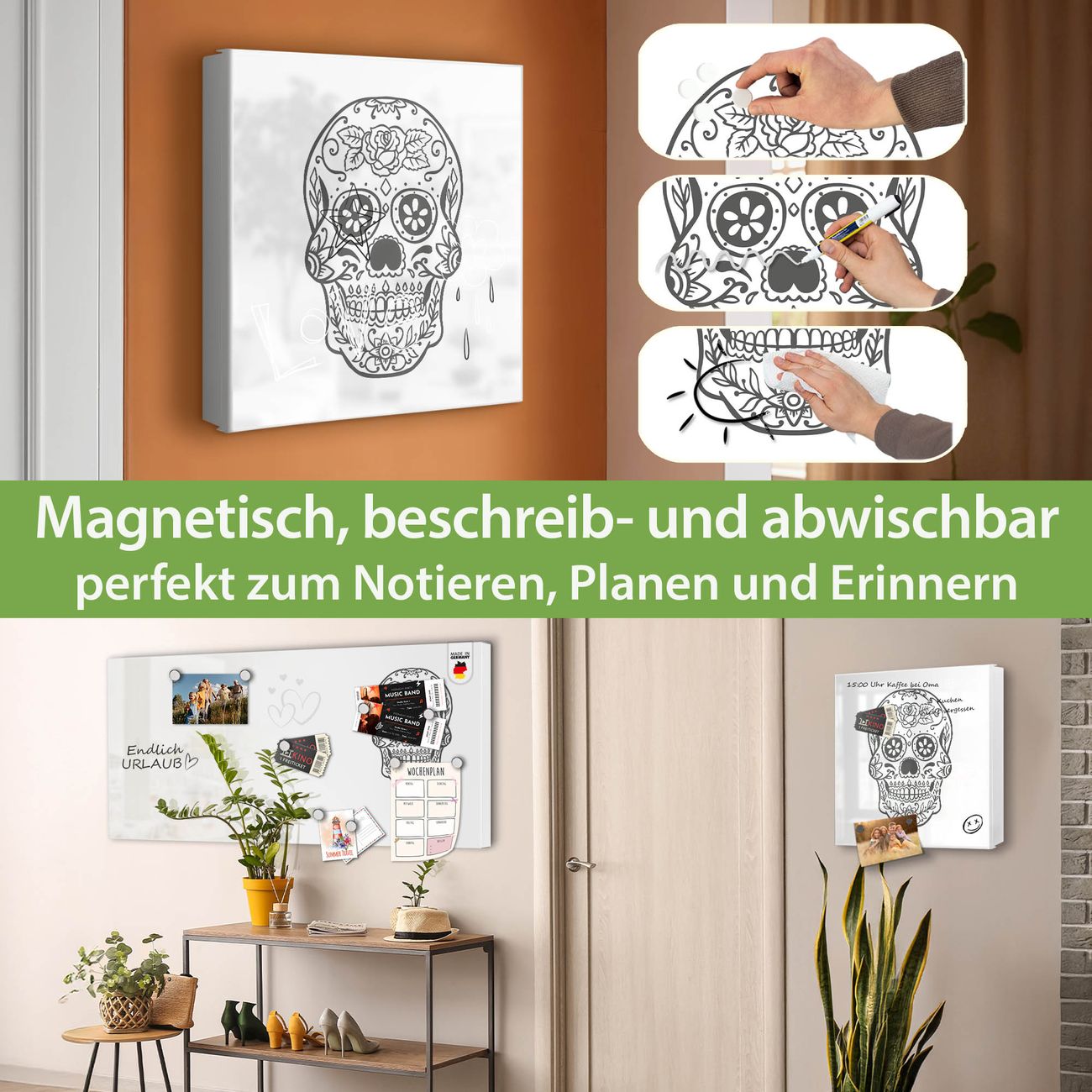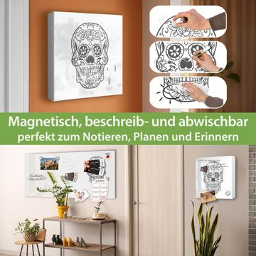 Bringe Ordnung und Eleganz in deinen Eingangsbereich mit dem banjado Schlüsselkasten Motiv Motiv Schwarz-Weiß Sugar Skull. Die moderne Schlüsselbox kombiniert funktionales Design mit hochwertiger Verarbeitung und wird so zu einem echten Hingucker in Flur, Büro oder Ferienwohnung. ✅ Stilvolle Schlüsselaufbewahrung mit Motiv Motiv Schwarz-Weiß Sugar Skull Der Design-Schlüsselkasten Motiv Motiv Schwarz-Weiß Sugar Skull bietet Platz für bis zu 32 Schlüssel, die auf 4 stabilen Reihen mit je 8 Haken übersichtlich verstaut werden. Mit seinen kompakten Maßen von 30 x 30 x 5 cm passt die Schlüsselbox perfekt auch in kleinere Räume. Der weiß lackierte Stahlkorpus mit links angeschlagenem Türscharnier harmoniert mit gedruckten Folie auf der Front und fügt sich nahtlos in jedes Wohnambiente ein. Ob als Schlüsselorganizer für Zuhause oder als praktische Lösung für Büros, Praxen und Gewerbe, der banjado Schlüsselkasten sorgt für Ordnung und Übersicht. Dank der magnetischen, mit Kreidestiften beschreibbaren Folie auf der Front kannst du Notizen anheften oder Termine direkt auf der Oberfläche festhalten. Die Schlüsselbox Motiv Motiv Schwarz-Weiß Sugar Skull zur Wandmontage wird inklusive Befestigungsmaterial geliefert und ist schnell angebracht. So hast du deine Schlüssel jederzeit griffbereit und zugleich stilvoll verstaut. Mit diesem banjado Schlüsselkasten Motiv Motiv Schwarz-Weiß Sugar Skull kombinierst du praktische Aufbewahrung mit stilvollem Wohndesign. Ob privat oder geschäftlich, die Schlüsselbox sorgt für mehr Ordnung, Übersicht und ein wohnliches Ambiente.Vorteile im Überblick