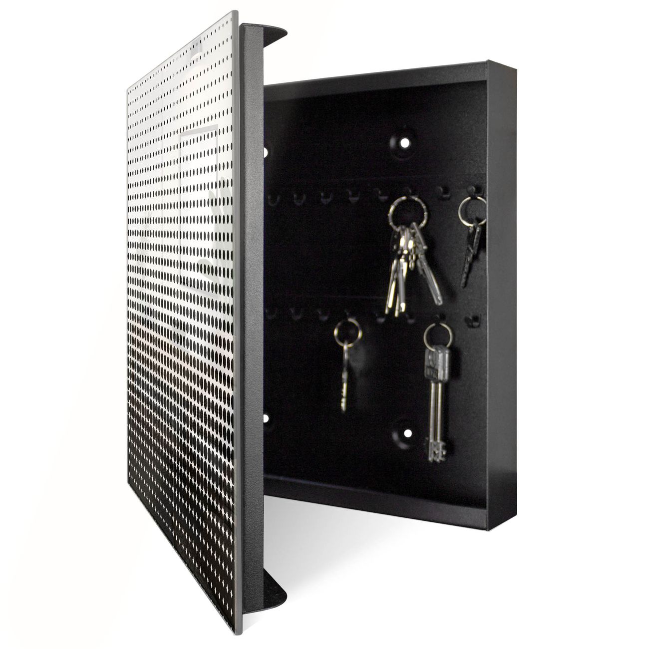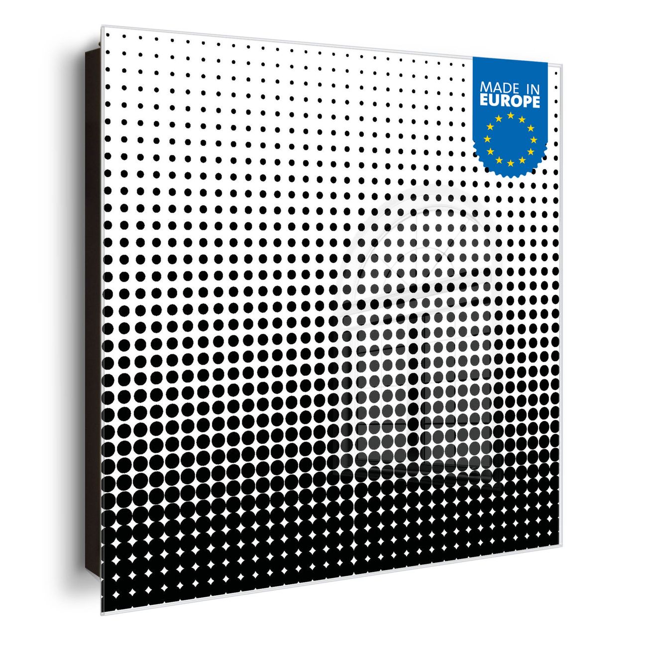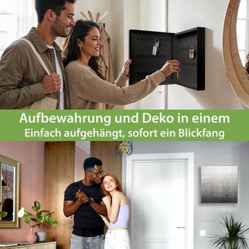 Bringe Ordnung und Eleganz in deinen Eingangsbereich mit dem banjado Schlüsselkasten Motiv Motiv Schwarz Weiß. Die moderne Schlüsselbox kombiniert funktionales Design mit hochwertiger Verarbeitung und wird so zu einem echten Hingucker in Flur, Büro oder Ferienwohnung. ✅ Stilvolle Schlüsselaufbewahrung mit Glasfront im Motiv Motiv Schwarz Weiß Der Design-Schlüsselkasten Motiv Motiv Schwarz Weiß bietet Platz für bis zu 50 Schlüssel, die auf 5 stabilen Reihen mit je 10 Haken übersichtlich verstaut werden. Mit seinen kompakten Maßen von 30 x 30 x 5 cm passt die Schlüsselbox perfekt auch in kleinere Räume. Der schwarz lackierte Stahlkorpus mit rechts angeschlagenem Türscharnier harmoniert mit der Glasfront und fügt sich nahtlos in jedes Wohnambiente ein. Ob als Schlüsselorganizer für Zuhause oder als praktische Lösung für Büros, Praxen und Gewerbe, der banjado Schlüsselkasten sorgt für Ordnung und Übersicht. Dank der magnetischen, mit Kreidestiften beschreibbaren Glasfront kannst du Notizen anheften oder Termine direkt auf der Oberfläche festhalten. Die Schlüsselbox Motiv Motiv Schwarz Weiß zur Wandmontage wird inklusive Befestigungsmaterial geliefert und ist schnell angebracht. So hast du deine Schlüssel jederzeit griffbereit und zugleich stilvoll verstaut. Mit diesem banjado Schlüsselkasten Motiv Motiv Schwarz Weiß kombinierst du praktische Aufbewahrung mit stilvollem Wohndesign. Ob privat oder geschäftlich, die Schlüsselbox sorgt für mehr Ordnung, Übersicht und ein wohnliches Ambiente.Vorteile im Überblick